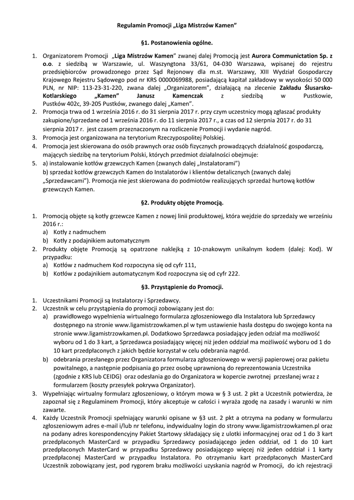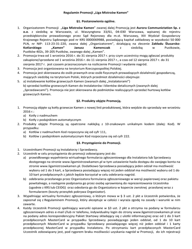 Regulamin Promocji „Liga Mistrzów Kamen” §1. Postanowienia ogólne. 1. Organizatorem Promocji „Liga Mistrzów Kamen” zwanej dalej Promocją jest Aurora Communictation Sp. z o.o. z siedzibą w Warszawie, ul. Waszyngtona 33/61, 04-030 Warszawa, wpisanej do rejestru przedsiębiorców prowadzonego przez Sąd Rejonowy dla m.st. Warszawy, XIII Wydział Gospodarczy Krajowego Rejestru Sądowego pod nr KRS 0000069988, posiadającą kapitał zakładowy w wysokości 50 000 PLN, nr NIP: 113-23-31-220, zwana dalej „Organizatorem”, działającą na zlecenie Zakładu ŚlusarskoKotlarskiego „Kamen” Janusz Kamenczak z siedzibą w Pustkowie, Pustków 402c, 39-205 Pustków, zwanego dalej „Kamen”. 2. Promocja trwa od 1 września 2016 r. do 31 sierpnia 2017 r. przy czym uczestnicy mogą zgłaszać produkty zakupione/sprzedane od 1 września 2016 r. do 11 sierpnia 2017 r., a czas od 12 sierpnia 2017 r. do 31 sierpnia 2017 r. jest czasem przeznaczonym na rozliczenie Promocji i wydanie nagród. 3. Promocja jest organizowana na terytorium Rzeczypospolitej Polskiej. 4. Promocja jest skierowana do osób prawnych oraz osób fizycznych prowadzących działalność gospodarczą, mających siedzibę na terytorium Polski, których przedmiot działalności obejmuje: 5. a) instalowanie kotłów grzewczych Kamen (zwanych dalej „Instalatorami”) b) sprzedaż kotłów grzewczych Kamen do Instalatorów i klientów detalicznych (zwanych dalej „Sprzedawcami”). Promocja nie jest skierowana do podmiotów realizujących sprzedaż hurtową kotłów grzewczych Kamen. §2. Produkty objęte Promocją. 1. Promocją objęte są kotły grzewcze Kamen z nowej linii produktowej, która wejdzie do sprzedaży we wrześniu 2016 r.: a) Kotły z nadmuchem b) Kotły z podajnikiem automatycznym 2. Produkty objęte Promocją są opatrzone naklejką z 10-znakowym unikalnym kodem (dalej: Kod). W przypadku: a) Kotłów z nadmuchem Kod rozpoczyna się od cyfr 111, b) Kotłów z podajnikiem automatycznym Kod rozpoczyna się od cyfr 222. §3. Przystąpienie do Promocji. 1. Uczestnikami Promocji są Instalatorzy i Sprzedawcy. 2. Uczestnik w celu przystąpienia do promocji zobowiązany jest do: a) prawidłowego wypełnienia wirtualnego formularza zgłoszeniowego dla Instalatora lub Sprzedawcy dostępnego na stronie www.ligamistrzowkamen.pl w tym ustawienie hasła dostępu do swojego konta na stronie www.ligamistrzowkamen.pl. Dodatkowo Sprzedawca posiadający jeden odział ma możliwość wyboru od 1 do 3 kart, a Sprzedawca posiadający więcej niż jeden oddział ma możliwość wyboru od 1 do 10 kart przedpłaconych z jakich będzie korzystał w celu odebrania nagród. b) odebrania przesłanego przez Organizatora formularza zgłoszeniowego w wersji papierowej oraz pakietu powitalnego, a następnie podpisania go przez osobę uprawnioną do reprezentowania Uczestnika (zgodnie z KRS lub CEIDG) oraz odesłania go do Organizatora w kopercie zwrotnej przesłanej wraz z formularzem (koszty przesyłek pokrywa Organizator). 3. Wypełniając wirtualny formularz zgłoszeniowy, o którym mowa w § 3 ust. 2 pkt a Uczestnik potwierdza, że zapoznał się z Regulaminem Promocji, który akceptuje w całości i wyraża zgodę na zasady i warunki w nim zawarte. 4. Każdy Uczestnik Promocji spełniający warunki opisane w §3 ust. 2 pkt a otrzyma na podany w formularzu zgłoszeniowym adres e-mail i/lub nr telefonu, indywidualny login do strony www.ligamistrzowkamen.pl oraz na podany adres korespondencyjny Pakiet Startowy składający się z ulotki informacyjnej oraz od 1 do 3 kart przedpłaconych MasterCard w przypadku Sprzedawcy posiadającego jeden oddział, od 1 do 10 kart przedpłaconych MasterCard w przypadku Sprzedawcy posiadającego więcej niż jeden oddział i 1 karty przedpłaconej MasterCard w przypadku Instalatora. Po otrzymaniu kart przedpłaconych MasterCard Uczestnik zobowiązany jest, pod rygorem braku możliwości uzyskania nagród w Promocji, do ich rejestracji poprzez wpisanie unikalnych kodów z kart w odpowiednie pole znajdujące się na stronie www.ligamistrzowkamen.pl w zakładce „Moje konto”. 5. Podczas trwania Promocji Uczestnik w każdej chwili ma prawo do dobrowolnej rezygnacji z Promocji poprzez wysłanie informacji o rezygnacji za pomocą formularza kontaktowego zamieszczonego na dedykowanej stronie www.ligamistrzowkamen.pl. 6. Uczestnikami Promocji nie mogą być pracownicy Kamen i Organizatora oraz członkowie ich najbliższej rodziny. Za członków najbliższej rodziny uważa się wstępnych, zstępnych, małżonków oraz rodzeństwo. § 4 Nagroda. 1. Każdy Uczestnik Promocji ma prawo do uzyskania „nagrody gwarantowanej” (zwanej dalej „Nagrodą”) w postaci zasilenia karty przedpłaconej, o której mowa w § 3 ust. 4 na zasadach określonych poniżej. 2. Otrzymanie i wartość Nagrody jest w przypadku Instalatorów uzależnione od zakupów a w przypadku Sprzedawców od sprzedaży kotłów grzewczych Kamen. 3. W Promocji liczona jest jedynie zakup/sprzedaż Produktów, które zostaną zarejestrowane przez Uczestnika w Promocji do dnia 18.08.2017 r., z zastrzeżeniem, że rejestracja powinna nastąpić w ciągu 30 dni od daty widniejącej na fakturze/paragonie. 4. W celu rejestracji Produktu w Promocji Uczestnik powinien: 4.1. Zalogować się na stronie www.ligamistrzowkamen.pl i wejść w zakładkę „Rejestracja produktu” 4.2. Wypełnić formularz rejestracji zakupionego/sprzedanego Produktu podając: a) W przypadku Instalatora: rodzaj Produktu, nazwę i adres dystrybutora, u którego zakupiono Produkt, datę zakupu Produktu, adres miejsca instalacji kotła, Kod umieszczony na zakupionym Produkcie. b) W przypadku Sprzedawcy: rodzaj Produktu, datę sprzedaży Produktu, Kod umieszczony na sprzedanym Produkcie, numer karty na którą ma zostać przelana Nagroda. 5. Każdy Kod może zostać zarejestrowany przez 1 Instalatora i 1 Sprzedawcę. 6. Wartość przyznanych Nagród dla poszczególnych Uczestn