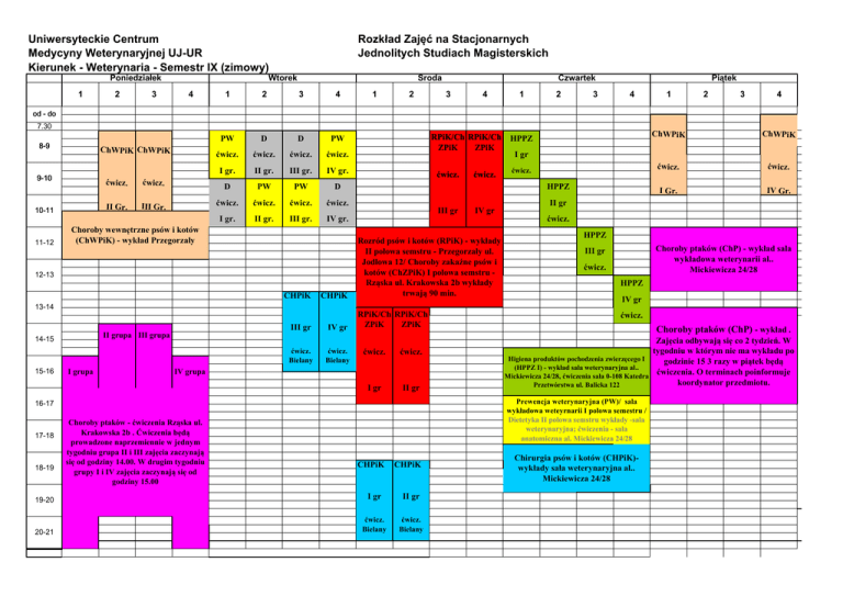 Rozkład Zajęć na Stacjonarnych Jednolitych Studiach Magisterskich Uniwersyteckie Centrum Medycyny Weterynaryjnej UJ-UR Kierunek - Weterynaria - Semestr IX (zimowy) Poniedziałek 1 2 3 Środa Wtorek 4 1 2 Piątek Czwartek 1 2 3 4 3 4 1 2 PW D D PW ćwicz. ćwicz. ćwicz. ćwicz. I gr. II gr. III gr. IV gr. ćwicz. D PW PW D HPPZ III Gr. ćwicz. ćwicz. ćwicz. ćwicz. II gr I gr. II gr. III gr. IV gr. 3 4 1 2 3 4 od - do 7.30 8-9 ChWPiK ChWPiK 9-10 ćwicz. II Gr. 10-11 11-12 RPiK/Ch RPiK/Ch ZPiK ZPiK ćwicz. III gr Choroby wewnętrzne psów i kotów (ChWPiK) - wykład Przegorzały 12-13 CHPiK CHPiK III gr IV gr ćwicz. Bielany ćwicz. Bielany 15-16 RPiK/Ch RPiK/Ch ZPiK ZPiK II grupa III grupa I grupa ćwicz. ćwicz. I gr II gr IV grupa 18-19 Choroby ptaków - ćwiczenia Rząska ul. Krakowska 2b . Ćwiczenia będą prowadzone naprzemiennie w jednym tygodniu grupa II i III zajęcia zaczynają się od godziny 14.00. W drugim tygodniu grupy I i IV zajęcia zaczynają się od godziny 15.00 CHPiK CHPiK 19-20 I gr II gr 20-21 ćwicz. Bielany ćwicz. Bielany ChWPiK ChWPiK ćwicz. ćwicz. I Gr. IV Gr. I gr ćwicz. ćwicz. HPPZ Choroby ptaków (ChP) - wykład sala wykładowa weterynarii al.. Mickiewicza 24/28 III gr ćwicz. HPPZ IV gr ćwicz. Choroby ptaków (ChP) - wykład . Zajęcia odbywają się co 2 tydzień. W tygodniu w którym nie ma wykładu po Higiena produktów pochodzenia zwierzęcego I godzinie 15 3 razy w piątek będą (HPPZ I) - wykład sala weterynaryjna al.. ćwiczenia. O terminach poinformuje Mickiewicza 24/28, ćwiczenia sala 0-108 Katedra koordynator przedmiotu. Przetwórstwa ul. Balicka 122 Prewencja weterynaryjna (PW)/ sala wykładowa weteyrnarii I połowa semestru / Dietetyka II połowa semstru wykłady -sala weterynaryjna; ćwiczenia - sala anatomiczna al. Mickiewicza 24/28 16-17 17-18 IV gr Rozród psów i kotów (RPiK) - wykłady II połowa semstru - Przegorzały ul. Jodłowa 12/ Choroby zakaźne psów i kotów (ChZPiK) I połowa semstru Rząska ul. Krakowska 2b wykłady trwają 90 min. 13-14 14-15 ćwicz. HPPZ Chirurgia psów i kotów (CHPiK)wykłady sala weterynaryjna al.. Mickiewicza 24/28