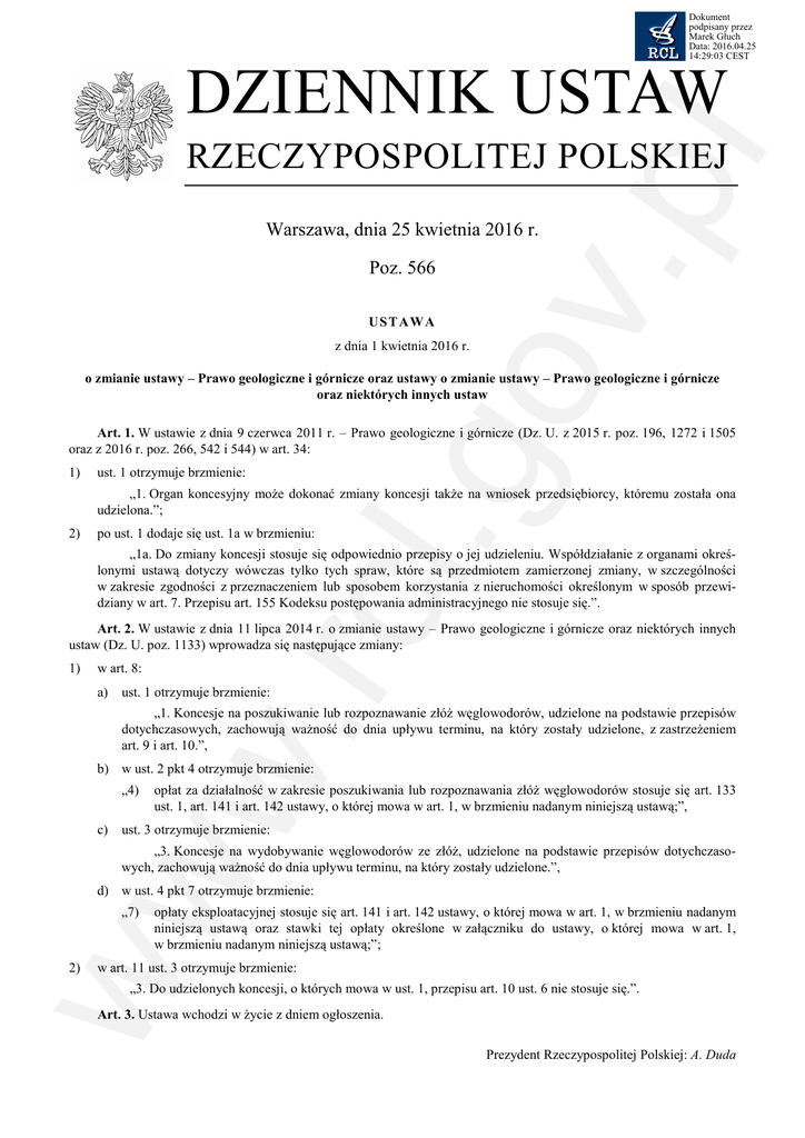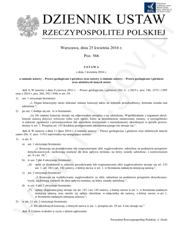 Dokument podpisany przez Marek Głuch Data: 2016.04.25 14:29:03 CEST l.g ov .pl DZIENNIK USTAW RZECZYPOSPOLITEJ POLSKIEJ Warszawa, dnia 25 kwietnia 2016 r. Poz. 566 US T AW A z dnia 1 kwietnia 2016 r. o zmianie ustawy – Prawo geologiczne i górnicze oraz ustawy o zmianie ustawy – Prawo geologiczne i górnicze oraz niektórych innych ustaw Art. 1. W ustawie z dnia 9 czerwca 2011 r. – Prawo geologiczne i górnicze (Dz. U. z 2015 r. poz. 196, 1272 i 1505 oraz z 2016 r. poz. 266, 542 i 544) w art. 34: 1) ust. 1 otrzymuje brzmienie: „1. Organ koncesyjny może dokonać zmiany koncesji także na wniosek przedsiębiorcy, któremu została ona udzielona.”; 2) po ust. 1 dodaje się ust. 1a w brzmieniu: w. rc „1a. Do zmiany koncesji stosuje się odpowiednio przepisy o jej udzieleniu. Współdziałanie z organami określonymi ustawą dotyczy wówczas tylko tych spraw, które są przedmiotem zamierzonej zmiany, w szczególności w zakresie zgodności z przeznaczeniem lub sposobem korzystania z nieruchomości określonym w sposób przewidziany w art. 7. Przepisu art. 155 Kodeksu postępowania administracyjnego nie stosuje się.”. Art. 2. W ustawie z dnia 11 lipca 2014 r. o zmianie ustawy – Prawo geologiczne i górnicze oraz niektórych innych ustaw (Dz. U. poz. 1133) wprowadza się następujące zmiany: 1) w art. 8: a) ust. 1 otrzymuje brzmienie: „1. Koncesje na poszukiwanie lub rozpoznawanie złóż węglowodorów, udzielone na podstawie przepisów dotychczasowych, zachowują ważność do dnia upływu terminu, na który zostały udzielone, z zastrzeżeniem art. 9 i art. 10.”, b) w ust. 2 pkt 4 otrzymuje brzmienie: „4) c) opłat za działalność w zakresie poszukiwania lub rozpoznawania złóż węglowodorów stosuje się art. 133 ust. 1, art. 141 i art. 142 ustawy, o której mowa w art. 1, w brzmieniu nadanym niniejszą ustawą;”, ust. 3 otrzymuje brzmienie: ww „3. Koncesje na wydobywanie węglowodorów ze złóż, udzielone na podstawie przepisów dotychczasowych, zachowują ważność do dnia upływu terminu, na który zostały udzielone.”, d) w ust. 4 pkt 7 otrzymuje brzmienie: „7) 2) opłaty eksploatacyjnej stosuje się art. 141 i art. 142 ustawy, o której mowa w art. 1, w brzmieniu nadanym niniejszą ustawą oraz stawki tej opłaty określone w załączniku do ustawy, o której mowa w art. 1, w brzmieniu nadanym niniejszą ustawą;”; w art. 11 ust. 3 otrzymuje brzmienie: „3. Do udzielonych koncesji, o których mowa w ust. 1, przepisu art. 10 ust. 6 nie stosuje się.”. Art. 3. Ustawa wchodzi w życie z dniem ogłoszenia. Prezydent Rzeczypospolitej Polskiej: A. Duda