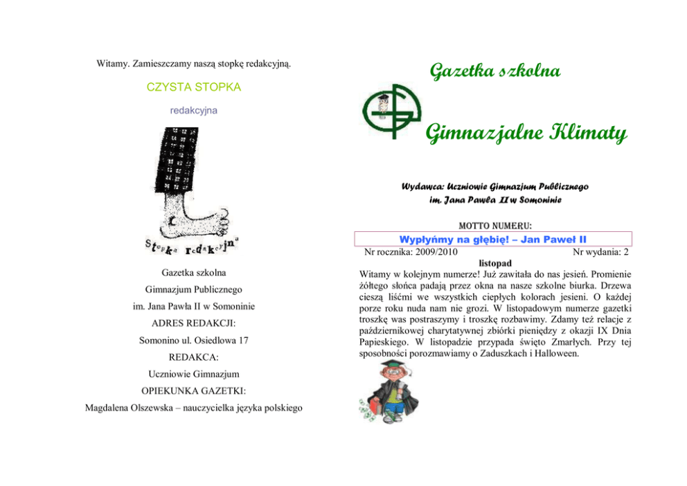 Witamy. Zamieszczamy naszą stopkę redakcyjną. Gazetka szkolna CZYSTA STOPKA redakcyjna Gimnazjalne Klimaty Wydawca: Uczniowie Gimnazjum Publicznego im. Jana Pawła II w Somoninie Gazetka szkolna Gimnazjum Publicznego im. Jana Pawła II w Somoninie ADRES REDAKCJI: Somonino ul. Osiedlowa 17 REDAKCA: Uczniowie Gimnazjum OPIEKUNKA GAZETKI: Magdalena Olszewska – nauczycielka języka polskiego Motto numeru: Wypłyńmy na głębię! – Jan Paweł II Nr rocznika: 2009/2010 Nr wydania: 2 listopad Witamy w kolejnym numerze! Już zawitała do nas jesień. Promienie żółtego słońca padają przez okna na nasze szkolne biurka. Drzewa cieszą liśćmi we wszystkich ciepłych kolorach jesieni. O każdej porze roku nuda nam nie grozi. W listopadowym numerze gazetki troszkę was postraszymy i troszkę rozbawimy. Zdamy też relacje z październikowej charytatywnej zbiórki pieniędzy z okazji IX Dnia Papieskiego. W listopadzie przypada święto Zmarłych. Przy tej sposobności porozmawiamy o Zaduszkach i Halloween. Numer zawiera: Podzieliliśmy się miłością… 1. Raport po zbiórce pieniędzy w ramach IX Dnia Papieskiego. 2. Wywiad z Panią Weroniką Miotk. 3. Zaduszki czy Halloween? 4. Sposób na dynię. 5. Straszna historia… 6. Kolorowani. W dniach od 9-16 października 2009r. nasi wolontariusze, czyli z gimnazjaliści: Agnieszka Gawroń, Agnieszka Socha, Anna Szwaba, Aleksandra Szwaba, Artur Grzenia, Aneta Puzdrowska, Małgorzata Laszkowska, Ewelina Węsierska (uczniowie klasy III a) oraz Jagoda Socha z klasy III b i Paulina Michalewicz z klasy III c brali udział w zbiórce publicznej przy okazji IX Dnia Papieskiego. 7. Szczypta humoru. Zebrali sumę 380 zł na Fundusz Dzieła Nowego Tysiąclecia. Wolontariusze aktywnie włączyli się w to zadanie, kwestując na ulicach Somonina i Egiertowa. Po zakończeniu zbiórki pieniędzy komisyjnie otwarto puszki Kwestujących i podliczono zebrane datki. Dzięki tym złotówkom przyznane zostaną stypendia najbardziej uzdolnionym gimnazjalistom i licealistom, pochodzącym z wiosek i małych miast. WYWIAD! Na pytania odpowiada Pani Kornelia Miszkowska 1. Czy lubi uczyć pani w szkole? Lubię uczyć w szkole, marzyłam o tym już od szkoły średniej. Nie zawsze jest łatwo, ale lubię pracę z młodzieżą jako nauczyciel matematyki. 2. Co pani robi w wolnym czasie? W wolnym czasie czytam książki, słucham muzyki, odwiedzam znajomych, chodzę do kina i na spacery. Mam zawsze dużo spraw na głowie, ale staram się sporo czasu poświęcać rodzinie i znajomym. 3. Ile lat pani pracuje? Nauczanie w Gimnazjum Publicznym im. Jana Pawa II w Somoninie to moja pierwsza stała praca. Wcześniej pracowałam kilka miesięcy w Algidzie przy produkcji lodów. 4. Jak długo Pani uczy w szkole? Dopiero zaczynam pracę w szkole jako nauczyciel. Wcześniej odbywałam miesięczne praktyki w innej szkole. Tam uczyłam matematyki i informatyki. 5. Czy dobrze Pani się czuje w tym zawodzie? Tak. Jak wcześniej wspominałam lubię pracę z młodzieżą. Już w szkole średniej wybrałam sobie ten zawód, nie wiedząc dokładnie jak będę się w nim czuła, czy chętnie będę chodzić do pracy i czy sprawdzę się jako nauczyciel. Dopiero na studiach podczas praktyk przekonałam się w 100% co to za zawód, na czym dokładnie polega, jakie są plusy i minusy bycia nauczycielem, czy spiszę się w tym zawodzie jako nauczyciel i wychowawca. Dopiero zaczynam pracę więc jeszcze długa i ciężka droga przede mną. Wiadomo, że początki są zawsze ciężkie, ale to mnie nie zniechęca. Jestem „świeżo upieczonym” nauczycielem, który się uczy i mam nadzieję, że uczniowie mi wybaczą niektóre niejasności, bo nauczyciel to zawód bardzo wymagający. 6. Czy ma Pani jakieś hobby? Lubię pływać, słuchać muzyki, gotować. Kocham też jeździć na rowerze dlatego, że mieszkam w tak pięknym zakątku Kaszub i mogę go stale podziwiać. 7. Czy Pani lubi czytać książki, jeśli tak to jakie? Lubię czytać książki przygodowe, młodzieżowe, fantastyczne i psychologiczne. Takie, które mają wciągającą fabułę i nagłe zwroty akcji. Wywiad przeprowadził uczeń klasy II a Zbyszek Gajęcki Zaduszki czy Halloween? Halloween Listopad to miesiąc, w którym wspominamy wszystkich świętych i modlimy się za naszych drogich zmarłych. Tak jest w Polsce. Powoli jednak wkraczają do naszego życia elementy Hallween. Zaduszki To współczesny odpowiednik pogańskiego święta Dziadów i tradycyjna nazwa katolickiego wspomnienia zmarłych. Dziady były zwyczajem ludowym. Jego zasadniczym celem było nawiązanie kontaktu z duszami zmarłych i pozyskanie ich przychylności. Dziady obchodzono dwa razy w roku - na wiosnę i na jesieni. Obecnie święto przypada na 2 listopada w dzień po dniu Wszystkich Świętych. Tego dnia katolicy modlą się za wszystkich wierzących w Chrystusa, którzy odeszli już z tego świata, a teraz przebywają w Halloween– zwyczaj związany z karnawałem i odnoszący się do święta zmarłych, obchodzony w wielu krajach kultury chrześcijańskiej nocą 31 października, czyli przed dniem Wszystkich Świętych. Odniesienia do Halloween są często widoczne w kulturze amerykańskiej. W Irlandii dzień jest świętem państwowym. Święto Halloween w Polsce pojawiło się w latach 90. czyśćcu. W Dzień Zaduszny tradycją jest chodzenie na groby Historia: bliskich, palenie zniczy, modlitwy i odprawianie mszy w intencji Ponad 2 tys. lat temu w ten dzień żegnano lato, witano zimę oraz obchodzono święto zmarłych. W ten dzień w Irlandii palono ogniska oraz odprawiano modły za dusze zmarłych. W czasach pogańskich ludzie w Irlandii przebierali się w kolorowe kostiumy i odprowadzali duchy do granic miasta. zmarłych. Z obrządków ludowych przetrwał jeszcze gdzieniegdzie zwyczaj karmienia dusz zmarłych, przybyłych w tym dniu z zaświatów na ziemię. Lud wiejski wierzył, że w noc poprzedzającą Dzień Zaduszny Zwyczaje: powstaj