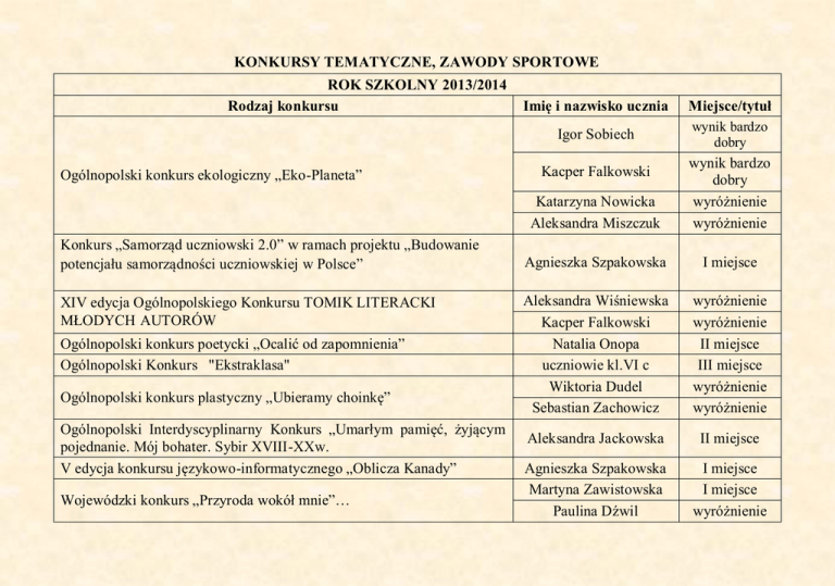 KONKURSY TEMATYCZNE, ZAWODY SPORTOWE ROK SZKOLNY 2013/2014 Rodzaj konkursu Ogólnopolski konkurs ekologiczny „Eko-Planeta” Konkurs „Samorząd uczniowski 2.0” w ramach projektu „Budowanie potencjału samorządności uczniowskiej w Polsce” XIV edycja Ogólnopolskiego Konkursu TOMIK LITERACKI MŁODYCH AUTORÓW Ogólnopolski konkurs poetycki „Ocalić od zapomnienia” Ogólnopolski Konkurs "Ekstraklasa" Ogólnopolski konkurs plastyczny „Ubieramy choinkę” Ogólnopolski Interdyscyplinarny Konkurs „Umarłym pamięć, żyjącym pojednanie. Mój bohater. Sybir XVIII-XXw. V edycja konkursu językowo-informatycznego „Oblicza Kanady” Wojewódzki konkurs „Przyroda wokół mnie”… Imię i nazwisko ucznia Miejsce/tytuł Igor Sobiech wynik bardzo dobry Katarzyna Nowicka Aleksandra Miszczuk wynik bardzo dobry wyróżnienie wyróżnienie Agnieszka Szpakowska I miejsce Aleksandra Wiśniewska Kacper Falkowski Natalia Onopa uczniowie kl.VI c Wiktoria Dudel Sebastian Zachowicz wyróżnienie wyróżnienie II miejsce III miejsce wyróżnienie wyróżnienie Aleksandra Jackowska II miejsce Agnieszka Szpakowska Martyna Zawistowska Paulina Dźwil I miejsce I miejsce wyróżnienie Kacper Falkowski Wojewódzki konkurs plastyczny pod hasłem ,,Roślina i zwierzę też może być w dobrym lub złym humorze” Mateusz Regliński I miejsce Wojewódzki konkurs plastyczny ,,Zawodowi Odkrywcy” Weronika Bagińska Julia Jarmołowska I miejsce wyróżnienie Aleksandra Pietruczuk wyróżnienie Anna Danilczuk Sebastian Sienkiewicz Eliza Klim Wiktoria Perkowska Monika Lipińska Gabriela Gryko Julia Czajkowska Julita Germaniuk Amelia Milewska Małgorzata Zalewska Kamila Olszańska Natalia Mironiuk Julia Choroszewska Sandra Kotik Aleksandra Sawicka nagroda nagroda nagroda nagroda nagroda nagroda nagroda nagroda nagroda nagroda III miejsce wyróżnienie Marcin Stępkowski nagroda Wojewódzki konkurs plastyczny ,,Krajobraz Polski – Tradycje – Współczesność – Przyszłość” Wojewódzki konkurs plastyczny pt. „To wiem od Tuwima” Wojewódzki konkurs plastyczny pt. „Ozdoby wielkanocne” Wojewódzki konkurs plastyczny pt. „Literackie podróże małe i duże” – „Tajemniczy świat książki” Wojewódzki konkurs literacko – plastyczny pt. „O zdrowie dbam, dobrze się mam” VII Regionalny Konkurs „Mistrz origami” Ogólnopolski Konkurs Młodych Artystów Międzynarodowej Federacji Lotniczej FAI „Latanie dla ratowania życia” - finał regionalny Wojewódzki Konkurs Twórczości Plastycznej Dzieci i Młodzieży „Krajobraz Polski” wyróżnienie Wojewódzki konkurs Marzenia bezdomnego Reksa”- konkurs plastyczny Wojewódzki konkurs literacko-plastyczny „Nowe przygody Plastusia” Wojewódzki konkurs - „Ozdoby wielkanocne” Powiatowy konkurs „Ekologiczny tryb życia- czyli Trzymaj Formę we współczesnym świecie” IX Międzyszkolny Konkurs Ekologiczny „Parki Narodowe” Międzyszkolny Konkurs „Certyfikat Młodego Ekologa” XIV Przegląd Twórczości Dzieci i Młodzieży w kategorii „Twórczość literacka – proza” XIV Przegląd Twórczości Dzieci i Młodzieży w kategorii „Twórczość literacka – poezja” Aleksandra Jackowska Zofia Sztabińska Sebastian Zachowicz Eliza Klim Eliza Klim Julia Cukrowska, Łukasz Szarejko, Piotr Kostecki Gabriela Mierzwińska Gabriela Karłuk Paula Olszańska Paweł Borys Kacper Falkowski Igor Sobiech II miejsce II miejsce wyróżnienie II miejsce II miejsce wyróżnienie Aleksandra Wiśniewska II miejsce Aleksandra Wiśniewska I miejsce I Miejski Konkurs Kultury Języka Polskiego Agnieszka Szpakowska Miejski konkurs plastyczno – literacki ,,Patron mojej szkoły” Małgorzata Szymańska Oliwia Jasiuk nagroda I miejsce II miejsce II miejsce nagroda I miejsce 1. miejsce / tytuł Mistrza Języka Polskiego I miejsce II miejsce Miejski Konkurs literacko - plastyczny: „Miś przyjacielem każdego dziecka” - II edycja Zofia Sztabińska Amelia Milewska Sebastian Zachowicz Łukasz Jacewicz Miejski konkurs plastyczny SZ nr 13„ Witaj wiosno”- IX międzyszkolny konkurs Sebastian Fruziński „ Żegnaj zimo, witaj wiosno”- konkurs plastyczny Magdalena Bartyś Miejski Konkurs Plastyczny „Po pasach gęsiego, kto doda coś do tego” Anna Andraka Dawid Treszczotko Emilia Zabielska Miejski Konkurs Twórczości Dziecięcej „Modelinowe cudaki – leśne zwierzaki” Eliza Klim Julia Kościukiewicz Oliwia Jasiuk Emilia Zabielska Miejski Konkurs Plastyczny ph.: „Ferie są super, każdy Ci to powie i zabawa na mrozie wychodzi na zdrowie” Adrianna Hołubowicz Sebastian Sienkiewicz Miejski konkurs - „Białe Boże Narodzenie barwami malowane” Eliza Klim Miejski konkurs - „Król Stefan Batory - portret wielkiego władcy” Eliza Klim Miejski konkurs - „Witaj wiosno” Jakub Hościło Maksym Iwaniuk Miejski konkurs - „Wielkanoc - czas radości i nadziei” Eliza Klim II miejsce III miejsce III miejsce I miejsce nagroda nagroda nagroda nagroda II miejsce II miejsce nagroda I miejsce III miejsce II miejsce III miejsce I miejsce I miejsce I miejsce I miejsce Miejski konkurs - „Białystok - moja mała Ojczyzna” XII Miejski Konkurs Poezji Dziecięcej ,,Złota polska jesień” Międzyszkolny konkurs „Znam swoje prawa i pamiętam, że inni też je mają” Festiwal Kultur - Miejski konkurs literacki : „Inni, a jednak tacy sami” II Międzyszkolny Konkurs na prezentację multimedialną w języku obcym „Co kraj to obyczaj” Międzyszkolny Konkurs programowania „Logomania 2014” Międzyszkolny Konkurs Historyczny „A to Polska właśnie- Tożsamość Polaka ” Międzyszkolny konkurs plastyczny pt. „Nasi czworonożni pupile” Międzyszkolny konkurs czytelniczy „Baśniowa kraina pana Andersen ’a” Eliza Klim Ewelina Onopa Piotr Grójec Zofia Sztabińska Sebastian Zachowicz Julia Kościukiewicz Hanna Olędzka Krzysztof Cudowski Nikolina Kravets Agnieszka Szpakowska Aleksandra Wiśniewska Jakub Targ