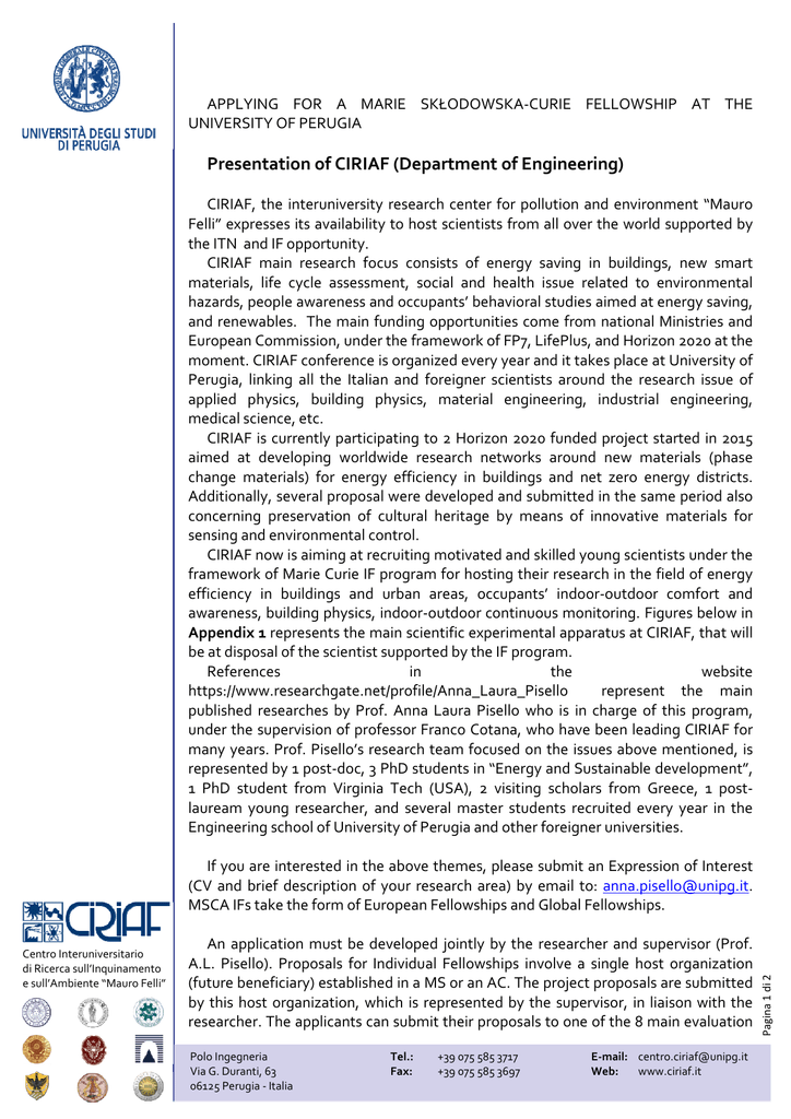 APPLYING FOR A MARIE SKŁODOWSKA‐CURIE FELLOWSHIP AT THE UNIVERSITY OF PERUGIA Centro Interuniversitario di Ricerca sull’Inquinamento e sull’Ambiente “Mauro Felli” CIRIAF, the interuniversity research center for pollution and environment “Mauro Felli” expresses its availability to host scientists from all over the world supported by the ITN and IF opportunity. CIRIAF main research focus consists of energy saving in buildings, new smart materials, life cycle assessment, social and health issue related to environmental hazards, people awareness and occupants’ behavioral studies aimed at energy saving, and renewables. The main funding opportunities come from national Ministries and European Commission, under the framework of FP7, LifePlus, and Horizon 2020 at the moment. CIRIAF conference is organized every year and it takes place at University of Perugia, linking all the Italian and foreigner scientists around the research issue of applied physics, building physics, material engineering, industrial engineering, medical science, etc. CIRIAF is currently participating to 2 Horizon 2020 funded project started in 2015 aimed at developing worldwide research networks around new materials (phase change materials) for energy efficiency in buildings and net zero energy districts. Additionally, several proposal were developed and submitted in the same period also concerning preservation of cultural heritage by means of innovative materials for sensing and environmental control. CIRIAF now is aiming at recruiting motivated and skilled young scientists under the framework of Marie Curie IF program for hosting their research in the field of energy efficiency in buildings and urban areas, occupants’ indoor‐outdoor comfort and awareness, building physics, indoor‐outdoor continuous monitoring. Figures below in Appendix 1 represents the main scientific experimental apparatus at CIRIAF, that will be at disposal of the scientist supported by the IF program. References in the website https://www.researchgate.net/profile/Anna_Laura_Pisello represent the main published researches by Prof. Anna Laura Pisello who is in charge of this program, under the supervision of professor Franco Cotana, who have been leading CIRIAF for many years. Prof. Pisello’s research team focused on the issues above mentioned, is represented by 1 post‐doc, 3 PhD students in “Energy and Sustainable development”, 1 PhD student from Virginia Tech (USA), 2 visiting scholars from Greece, 1 post‐ lauream young researcher, and several master students recruited every year in the Engineering school of University of Perugia and other foreigner universities. If you are interested in the above themes, please submit an Expression of Interest (CV and brief description of your research area) by email to: [email protected]. MSCA IFs take the form of European Fellowships and Global Fellowships. An application must be developed jointly by the researcher and supervisor (Prof. A.L. Pisello). Proposals for Individual Fellowships involve a single host organization (future beneficiary) established in a MS or an AC. The project proposals are submitted by this host organization, which is represented by the supervisor, in liaison with the researcher. The applicants can submit their proposals to one of the 8 main evaluation Polo Ingegneria Via G. Duranti, 63 06125 Perugia ‐ Italia Tel.: Fax: +39 075 585 3717 +39 075 585 3697 E‐mail: [email protected] Web: www.ciriaf.it Pagina 1 di 2 Presentation of CIRIAF (Department of Engineering) panels: Chemistry (CHE), Social Sciences and Humanities (SOC), Economic Sciences (ECO), Information Science and Engineering (ENG), Environment and Geosciences (ENV), Life Sciences (LIF), Mathematics (MAT), Physics (PHY). Of course, the most valuable panels at CIRIAF should be ENG, PHY, ENV, and SOC. For European Fellowships the applicants can submit their proposals as Standard EF to one of the 8 main evaluation panels or to one of the 2 multidisciplinary panels: Career Restart Panel (CAR) and Reintegration Panel (RI). The CAR panel provides financial support to individual researchers who want to resume research in Europe after a career break, while the RI panel is dedicated to researchers who want to return to Europe to reintegrate in a longer term research position. Global Fellowships GF are composed of an outgoing phase during which the researcher spends 1 to 2 years on secondment to a partner organisation in a Third Country, plus a mandatory 12‐month return period to a host organisation (the beneficiary) located in a Member State or Associated Country. For more information go to http://ec.europa.eu/research/participants/portal/desktop/en/opportunities/h 2020/calls/h2020‐msca‐if‐2015.html Appendix 1: Main experimental facilities at CIRIAF labs available for the ITN hosted scientist Acoustic chambers at CIRIAF lab New multidisciplinary research inspirations Outdoor multipurpose continuous monitoring setup for urban areas Continuously monitored full scale real buildings for experimental campaign Continuous monitoring permanent setup at the test‐room field at CIRIAF Two continuously monitored full scale buildings Spectrophotometer with integrating sphere for measuring solar reflectance, absorbance and transmittance of opaque and transparent envelope materials Impedance tube, for measuring acoustic properties of materials Hot box full scale equipment for thermal transmittance measurements Hot disk and hot plate for thermal conductivity and diffusivity measurement Pagina 2 di 2 Centro Interuniversitario di Ricerca sull’Inquinamento e sull’Ambiente “Mauro Felli” Polo Ingegneria Via G. Duranti, 63 06125 Perugia ‐ Italia Tel.: Fax: +39 075 585 3717 +39 075 585 3697 E‐mail: [email protected] Web: www.ciriaf.it