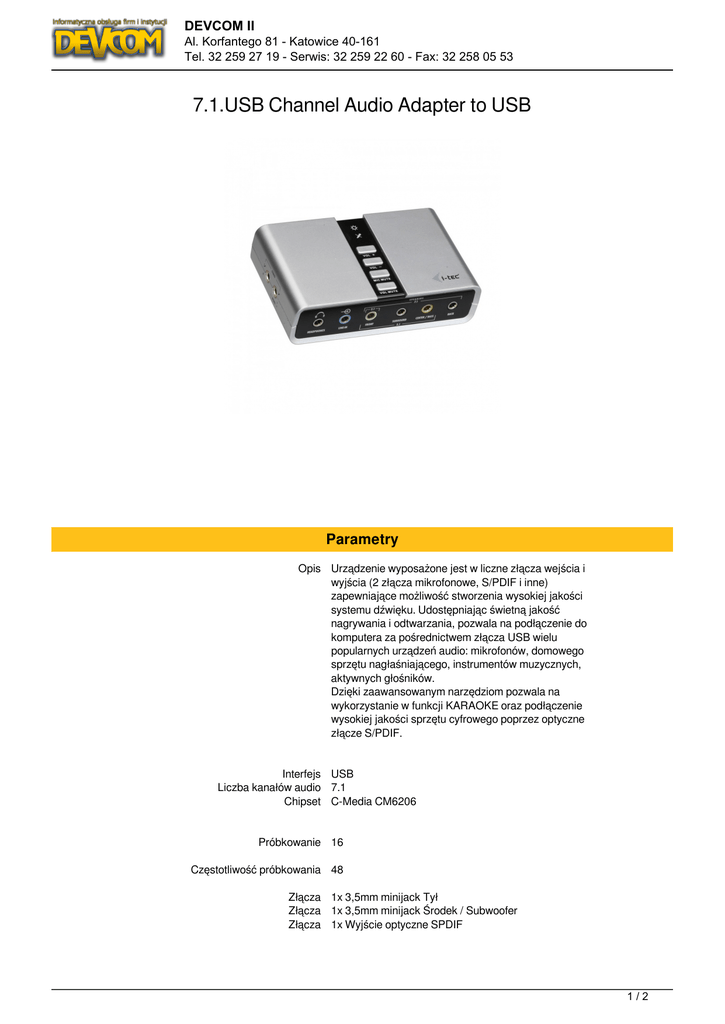 DEVCOM II Al. Korfantego 81 - Katowice 40-161 Tel. 32 259 27 19 - Serwis: 32 259 22 60 - Fax: 32 258 05 53 7.1.USB Channel Audio Adapter to USB Parametry Opis Urządzenie wyposażone jest w liczne złącza wejścia i wyjścia (2 złącza mikrofonowe, S/PDIF i inne) zapewniające możliwość stworzenia wysokiej jakości systemu dźwięku. Udostępniając świetną jakość nagrywania i odtwarzania, pozwala na podłączenie do komputera za pośrednictwem złącza USB wielu popularnych urządzeń audio: mikrofonów, domowego sprzętu nagłaśniającego, instrumentów muzycznych, aktywnych głośników. Dzięki zaawansowanym narzędziom pozwala na wykorzystanie w funkcji KARAOKE oraz podłączenie wysokiej jakości sprzętu cyfrowego poprzez optyczne złącze S/PDIF. Interfejs USB Liczba kanałów audio 7.1 Chipset C-Media CM6206 Próbkowanie 16 Częstotliwość próbkowania 48 Złącza 1x 3,5mm minijack Tył Złącza 1x 3,5mm minijack Środek / Subwoofer Złącza 1x Wyjście optyczne SPDIF 1/2 DEVCOM II Al. Korfantego 81 - Katowice 40-161 Tel. 32 259 27 19 - Serwis: 32 259 22 60 - Fax: 32 258 05 53 Złącza Złącza Złącza Złącza Wymagania sprzętowe Obsługiwane systemy operacyjne Obsługiwane systemy operacyjne Obsługiwane systemy operacyjne Obsługiwane systemy operacyjne Obsługiwane systemy operacyjne Obsługiwane systemy operacyjne Obsługiwane systemy operacyjne Obsługiwane systemy operacyjne Oprogramowanie 1x Wejście optyczne SPDIF 2x 3,5mm minijack Głośniki 2x 3,5mm minijack Mikrofon 1x 3,5mm minijack Line In PC, notebook z wolnym portem USB Windows 8.1 Windows 7 Windows 8 Windows XP Windows Vista Windows 2000 Mac OS Windows 10 Opatentowany software C-Media dla uzyskania różnych efektów dźwiękowych Kolor Srebrny Wymiary 100 x 60 x 26 mm Waga 93 Zawartość zestawu - 7.1 Channel Audio Adapter - USB kabel (93 cm) - CD - Instrukcja 2/2 Powered by TCPDF (www.tcpdf.org)