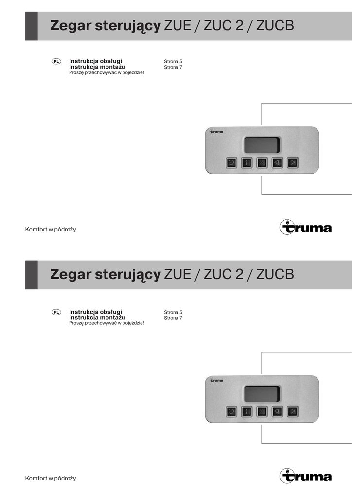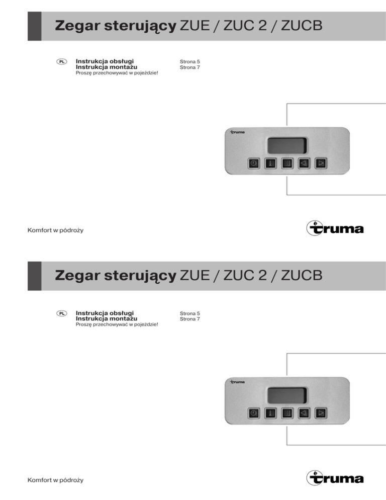 Zegar sterujący ZUE / ZUC 2 / ZUCB Instrukcja obsługi Instrukcja montażu Strona 5 Strona 7 Prosz przechowywać w pojeżdzie! Komfort w pódroży Zegar sterujący ZUE / ZUC 2 / ZUCB Instrukcja obsługi Instrukcja montażu Prosz przechowywać w pojeżdzie! Komfort w pódroży Strona 5 Strona 7 Szablon na otwór montażowy (wymiary B lub C wynikają z rysunków zabudowy, strona 4 i 5) ✂ oben / Top C C R m 2, 2 B Ø 43 mm m m m 4 C B B B C C C B = 90 mm C = 95 mm 2 Szablon na otwór montażowy (wymiary B lub C wynikają z rysunków zabudowy, strona 4 i 5) ✂ oben / Top C C R m B B B C C B = 90 mm C = 95 mm 2 2, 2 B Ø 43 mm m m m 4 C C A B 3 A B 3 C D C D 4 4 Krótki opis Instrukcja obsługi Zegar sterujący Truma – ZUE, nr art. 39890-00, i – ZUE 2, nr art. 39891-00, do ogrzewania Trumatic E 1800, E 2400, E 2800 oraz E 4000 (seria 2, od roku produkcji 1989) – ZUC 2, nr art. 34042-01, do ogrzewania Trumatic C 3402, C 4002 i C 6002 – ZUCB, nr art. 34043-01, do ogrzewania Truma Combi 4 i Combi 6 umożliwia zaprogramowanie 3 czasów włączenia w ciągu 7 dni. Czas działania jest programowalny i wynosi maksymalnie 2 godziny. Codzienne automatyczne włączenie ogrzewania nie jest możliwe. Tego zegara sterującego nie należy używać z urządzeniami grzewczymi Trumatic C 3400 / C 6000 serii 1, do roku produkcji 06/97. 4 3 1 Ogrzewanie można włączyć i wyłączyć przy pomocy panelu obsługi oraz zegara sterującego. Jeżeli ogrzewanie obsługiwane jest przy pomocy zegara sterującego, to włącznik na panelu obsługi musi znajdować się w położeniu „wyłączone”. W razie przerwy w dopływie prądu (np. demontaż lub ładowanie baterii) miga wskaźnik dnia na wyświetlaczu. Zaprogramowanie ogrzewania jest możliwe dopiero po ustawieniu zegara sterującego. Natychmiastowe uruchomienie ogrzewania Niezależnie od ustawionego czasu ogrzewanie można włączyć lub wyłączyć przez naciśnięcie przycisku . 2 Ustawienie aktualnego czasu 2 13 Nacisnąć i przytrzymać przycisk tak długo, aż wskaźnik zacznie migać. Ustawić czas przyciskami lub . Po ok. 5 sekundach włącza się bieg szybki. MODIMIDOFRSASO 5 1 2 3 4 5 6 7 8 9 = = = = = = = = = 6 7 8 9 Aktualny czas wzgl.czas włączenia Wskaźnik działania Wskaźnik pozycji pamięci Aktualny dzień tygodnia lub dzień włączenia Czas Pozycja pamięci Ogrzewanie natychmiastowe Wstecz Do przodu Krótki opis Ustawienie aktualnego dnia tygodnia Nacisnąć i przytrzymać przycisk tak długo, aż wskaźnik zacznie migać, po kolejnych ok. 5 sekundach miga wskaźnik dnia. Ustawić aktualny dzień tygodnia przyciskami lub . 5 Instrukcja obsługi Zegar sterujący Truma – ZUE, nr art. 39890-00, i – ZUE 2, nr art. 39891-00, do ogrzewania Trumatic E 1800, E 2400, E 2800 oraz E 4000 (seria 2, od roku produkcji 1989) – ZUC 2, nr art. 34042-01, do ogrzewania Trumatic C 3402, C 4002 i C 6002 – ZUCB, nr art. 34043-01, do ogrzewania Truma Combi 4 i Combi 6 umożliwia zaprogramowanie 3 czasów włączenia w ciągu 7 dni. Czas działania jest programowalny i wynosi maksymalnie 2 godziny. Codzienne automatyczne włączenie ogrzewania nie jest możliwe. Tego zegara sterującego nie należy używać z urządzeniami grzewczymi Trumatic C 3400 / C 6000 serii 1, do roku produkcji 06/97. 4 3 1 Ogrzewanie można włączyć i wyłączyć przy pomocy panelu obsługi oraz zegara sterującego. Jeżeli ogrzewanie obsługiwane jest przy pomocy zegara sterującego, to włącznik na panelu obsługi musi znajdować się w położeniu „wyłączone”. W razie przerwy w dopływie prądu (np. demontaż lub ładowanie baterii) miga wskaźnik dnia na wyświetlaczu. Zaprogramowanie ogrzewania jest możliwe dopiero po ustawieniu zegara sterującego. Natychmiastowe uruchomienie ogrzewania Niezależnie od ustawionego czasu ogrzewanie można włączyć lub wyłączyć przez naciśnięcie przycisku . 2 Ustawienie aktualnego czasu 2 13 Nacisnąć i przytrzymać przycisk tak długo, aż wskaźnik zacznie migać. Ustawić czas przyciskami lub . Po ok. 5 sekundach włącza się bieg szybki. MODIMIDOFRSASO 5 1 2 3 4 5 6 7 8 9 = = = = = = = = = 6 7 8 9 Aktualny czas wzgl.czas włączenia Wskaźnik działania Wskaźnik pozycji pamięci Aktualny dzień tygodnia lub dzień włączenia Czas Pozycja pamięci Ogrzewanie natychmiastowe Wstecz Do przodu Ustawienie aktualnego dnia tygodnia Nacisnąć i przytrzymać przycisk tak długo, aż wskaźnik zacznie migać, po kolejnych ok. 5 sekundach miga wskaźnik dnia. Ustawić aktualny dzień tygodnia przyciskami lub . 5 Programowanie czasów włączenia Czas działania Nacisnąć 1x przycisk , na wyświetlaczu pojawi się pozycja pamięci 1. Przyciskami lub ustawić żądany czas włączenia. Po ok. 5 sekundach miga wskaźnik dnia, przyciskiem ustawić żądany dzień włączenia. Ponownie nacisnąć przycisk , czas włączenia został zapisany w pamięci, a na wyświetlaczu pojawia się pozycja pamięci 2. Odpowiednio wprowadzić czas i dzień włączenia, i ponownie zapisać przyciskiem . Teraz na wyświetlaczu świeci pozycja pamięci 3. W taki sam sposób wprowadzić czas i dzień włączenia i ponownie zapisać przyciskiem . Nacisnąć przycisk . Czas działania zostanie wyświetlony. Po ok. 2 sekundach można ustawić czas działania przy pomocy przycisków lub w przedziale od 1 do 120 minut. Zegar przełącza się automatycznie na aktualny czas. Po przerwie w dopływie prądu uruchamiane jest ustawienie podstawowe 60 minut. Dla uniknięcia konieczności nowego programowania w przypadku codziennie powtarzającego się czasu ogrzewania dla każdego dnia tygodnia, na pozycjach pamięci 1 i 2 wyświetlany jest automatycznie najbliższy możliwy dzień tygodnia. Na 3 pozycji pamięci dzień tygodnia można ustawić bezpośrednio. Pozostały czas działania Nacisnąć przycisk , wyświetlany jest pozostały czas działania. Po 2 sekundach czas ten można skrócić przez kolejne naciśnięcie przycisku lub wydłużyć przy pom