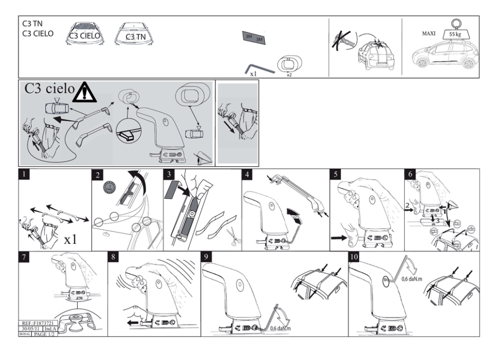 C3 TN C3 CIELO vert : avant verde : adelante zielony : przod C3 CIELO C3 TN 608 111 290 FEU VERT ZI de la Plaine de l'ain 01150 SAINT-VULBAS N° vert : 0800 10 10 01 3M bleu : arrière azul : atras niebieski : tyl 291 AVANT DROIT ANTERIORE DESTRA PRZOD PRAWA STRONA AVANT GAUCHE ANTERIORE SINISTRA PRZOD LEWA STRONA 288 55 3M 289 ARRIERE DROIT POSTERIORE DESTRA TYL PRAWA STRONA ARRIERE GAUCHE POSTERIORE SINISTRA TYL LEWA STRONA x1 C3 cielo x2 C3 cielo A A B B 9416-G8 9416-G7 1 3 2 6 5 4 Feuvert u u rt t er Feuv 2 vert Feu 1 x2 u u u 3 Feuvert u Feuvert x1 10 9 8 7 0,6 daN.m Feuvert 0,6 daN.m Feuvert u u u REF.:F1873721 Réf.:F1883721 30/05/11ind.A Ind.A 30/05/11 1/2 1/2 BTM BOSAL PAGE PAGE u Feuvert Feuvert 0,6 daN.m Français Sécurité - Prière de bien lire l’instruction de montage avant de commencer. - Veuillez vérifier que tous les articles sont inclus dans la boite. - Suivez l’ordre de numérotation 1,2,3 etc… - Ces barres de toit ne conviennent qu’au véhicule spécifié au recto de cette notice. - Fixer de façon sûre et correcte la charge. - Il est recommandé d’utiliser les accessoires adaptés au transport de la charge considérée (porte-vélo, porte-ski, etc…) - Faire attention à ne pas abîmer les barres de toit (chocs, etc…) et de veiller à un bon entretien des barres. - Nettoyer et sécher les surfaces en contact avec le véhicule avant montage. - Ces barres ont été conçues pour être placées à un endroit précis du véhicule. - La fixation sur le véhicule n’est plus garantie si le positionnement est différent de celui indiqué sur cette notice. - Les dispositifs de fixation doivent être serrés correctement et vérifiés régulièrement au cours des trajets. - L’arrimage des bagages avec des liens élastiques (sandow, tendeurs, etc...) est interdit; sangles conseillées. - Les pattes métalliques de fixation ont reçu un traitement spécial anti-agression de la peinture de votre véhicule ; ce traitement a fait l’objet de recherches approfondies. - N’intercaler aucune garniture supplémentaire (caoutchouc, plastique ou autre) entre la patte de fixation et la carrosserie, la bonne tenue des barres ne serait plus assurée. - Respecter la charge maximum admissible par le véhicule préconisée au recto. - La hauteur de la charge ne doit pas dépasser celle préconisée par le constructeur dans le manuel d’utilisation. - Planches à voile et charges longues: réduire la vitesse, 90 km/heure conseillé. - Pour économie d’énergie, les barres seront enlevées si elles ne sont pas utilisées. - Toute charge transportée sur le pavillon d’un véhicule affecte de manière sensible son comportement en particulier la sensibilité au vent latéral et le comportement en virage et au freinage. Il est conseillé de conduire avec plus de prudence (réduire la vitesse, tenir compte de l’augmentation des distances de freinage) - Important : Suivre correctement les instructions de montage et d’utilisation. Le non respect de cette notice d’utilisation dégage la responsabilité du constructeur. OK NO ESPAÑOL SEGURIDAD - Leer atentamente las instrucciones de montaje antes de comenzar. - Verificar que todos los artículos se encuentran en la caja. - Seguir el orden de numeración 1, 2, 3, etc. - Estas barras de techo sólo sirven para el vehículo especificado en el anverso de estas instrucciones. - Fijar la carga adecuadamente y de forma segura. - Se recomienda utilizar accesorios adaptados al transporte de la carga en cuestión (portabicicletas, portaesquís, etc.) - Prestar atención para no deteriorar las barras de techo (golpes, etc.) y realizar correctamente su mantenimiento. - Antes del montaje, limpiar y secar las superficies en contacto con el vehículo. - Estas barras han sido diseñadas para ser montadas en un lugar preciso del vehículo. - La fijación en el vehículo no está garantizada si la posición es diferente de la indicada en estas instrucciones. - Es imprescindible apretar correctamente los dispositivos de fijación y comprobarlos periódicamente durante el trayecto. - Se prohíbe sujetar el equipaje con elásticos (pulpos, tensores, etc.); se aconseja utilizar correas. - Las patillas metálicas de fijación han recibido un tratamiento especial antiagresión de la pintura de su vehículo; este tratamiento ha sido objeto de minuciosas investigaciones. - No intercalar ninguna guarnición suplementaria (caucho, plástico u otros) entre la patilla de fijación y la carrocería ya que, de lo contrario, no se garantizaría la correcta sujeción de las barras. - Respecte la carga máxima admitida por el vehículo que se indica en el anverso. - La altura de la carga no debe sobrepasar la recomendada por el fabricante en el manual de utilización. - Tablas de vela y cargas largas: reducir la velocidad; se recomienda circular a 90 km/h. - Para ahorrar energía, desmontar las barras si no se utilizan. - Todas las cargas que se transporten en el techo de un vehículo afectan de manera importante en su comportamiento, en especial en la sensibilidad al viento lateral y en el comportamiento en los giros y en la frenada. Se aconseja conducir con mayor prudencia (reducir la velocidad y tener en cuenta el aumento de la distancia para frenar) - Importante: Seguir correctamente las instrucciones de montaje y utilización. El incumplimiento de estas instrucciones de utilización exime de responsabilidad al Fabricante. POLSKI BEZPIECZEŃSTWO - Przed przystąpieniem do pracy należy dokładnie przeczytać instrukcję montażu. - Prosimy o sprawdzenie, czy wszystkie elementy znajdują się w opakowaniu. - Należy sprawdzić je zgodnie z kolejnymi numerami 1, 2, 3 itd. - Listwy dachowe przeznaczone są jedynie do samochodów wymienionych na odwrocie niniejszej instrukcji. - Należy zawsze zamocować ładunek w sposób prawidłowy i pewny. - Zalecane jest korzystanie z akcesoriów odpowiednich dla przewożonego ładunku (bagażnik na rowery, bagażnik