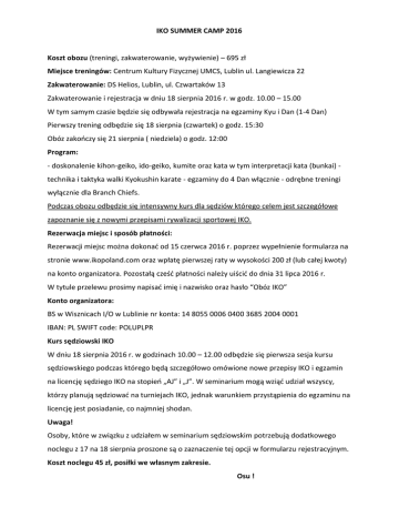 IKO SUMMER CAMP 2016 Koszt obozu (treningi, zakwaterowanie, wyżywienie) – 695 zł Miejsce treningów: Centrum Kultury Fizycznej UMCS, Lublin ul. Langiewicza 22 Zakwaterowanie: DS Helios, Lublin, ul. Czwartaków 13 Zakwaterowanie i rejestracja w dniu 18 sierpnia 2016 r. w godz. 10.00 – 15.00 W tym samym czasie będzie się odbywała rejestracja na egzaminy Kyu i Dan (1-4 Dan) Pierwszy trening odbędzie się 18 sierpnia (czwartek) o godz. 15:30 Obóz zakończy się 21 sierpnia ( niedziela) o godz. 12:00 Program: - doskonalenie kihon-geiko, ido-geiko, kumite oraz kata w tym interpretacji kata (bunkai) technika i taktyka walki Kyokushin karate - egzaminy do 4 Dan włącznie - odrębne treningi wyłącznie dla Branch Chiefs. Podczas obozu odbędzie się intensywny kurs dla sędziów którego celem jest szczegółowe zapoznanie się z nowymi przepisami rywalizacji sportowej IKO. Rezerwacja miejsc i sposób płatności: Rezerwacji miejsc można dokonać od 15 czerwca 2016 r. poprzez wypełnienie formularza na stronie www.ikopoland.com oraz wpłatę pierwszej raty w wysokości 200 zł (lub całej kwoty) na konto organizatora. Pozostałą cześć płatności należy uiścić do dnia 31 lipca 2016 r. W tytule przelewu prosimy napisać imię i nazwisko oraz hasło “Obóz IKO” Konto organizatora: BS w Wisznicach I/O w Lublinie nr konta: 14 8055 0006 0400 3685 2004 0001 IBAN: PL SWIFT code: POLUPLPR Kurs sędziowski IKO W dniu 18 sierpnia 2016 r. w godzinach 10.00 – 12.00 odbędzie się pierwsza sesja kursu sędziowskiego podczas którego będą szczegółowo omówione nowe przepisy IKO i egzamin na licencję sędziego IKO na stopień „AJ” i „J”. W seminarium mogą wziąć udział wszyscy, którzy planują sędziować na turniejach IKO, jednak warunkiem przystąpienia do egzaminu na licencję jest posiadanie, co najmniej shodan. Uwaga! Osoby, które w związku z udziałem w seminarium sędziowskim potrzebują dodatkowego noclegu z 17 na 18 sierpnia proszone są o zaznaczenie tej opcji w formularzu rejestracyjnym. Koszt noclegu 45 zł, posiłki we własnym zakresie. Osu !