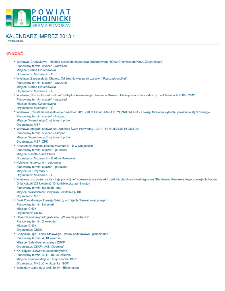 KALENDARZ IMPREZ 2013 r. 2013-04-04 KWIECIEÑ Wystawa „Charzykowy - kolebka polskiego żeglarstwa śródlądowego. 90 lat Chojnickiego Klubu Żeglarskiego” Planowany termin: styczeñ - wrzesieñ Miejsce: Brama Człuchowska Organizator: Muzeum H - E Wystawa „Z przeszłości Chojnic. Od średniowiecza do czasów II Rzeczypospolitej” Planowany termin: styczeñ - wrzesieñ Miejsce: Brama Człuchowska Organizator: Muzeum H - E Wystawa „Non multa sed multum”. Nabytki i konserwacja zbiorów w Muzeum Historyczno - Etnograficznym w Chojnicach 2002 - 2012 Planowany termin: styczeñ - wrzesieñ Miejsce: Brama Człuchowska Organizator: Muzeum H - E Wystawa „Powstanie niespełnionych nadziei” 2013 - ROK POWSTANIA STYCZNIOWEGO - z okazji 150-lecia wybuchu powstania styczniowego Planowany termin: styczeñ - listopad Miejsce: Wszechnica Chojnicka - I p. hol Organizator: MBP Wystawa fotografii podwodnej „Zaborski Świat Podwodny”. 2013 - ROK JEZIOR POMORZA Planowany termin: styczeñ - listopad Miejsce: Wszechnica Chojnicka - I p. hol Organizator: MBP, ZPK Prezentacja własnej kolekcji Muzeum H - E w Chojnicach Planowany termin: styczeñ - grudzieñ Miejsce: Baszta Kurza Stopa Organizator: Muzeum H - E Albin Makowski. Kolekcja historyczno - regionalna Planowany termin: styczeñ - grudzieñ Miejsce: ul. Drzymały 5 Organizator: Muzeum H - E Wystawa „Kto pisze i czyta - żyje podwójnie” - prezentacja sylwetek i dzieł Karola Głombiowskiego oraz Stanisława Gierszewskiego z okazji obchodów Dnia Książki (23 kwietnia) i Dnia Bibliotekarza (8 maja) Planowany termin: kwiecieñ - maj Miejsce: Wszechnica Chojnicka - czytelnia p.104 Organizator: MBP Finał Powiatowego Turnieju Wiedzy o Krajach Niemieckojęzycznych Planowany termin: kwiecieñ Miejsce: ChDK Organizator: ChDK Otwarcie wystawy fotograficznej ,,W krainie puchacza” Planowany termin: 2 kwietnia Miejsce: ChDK Organizator: ChDK Chojnicka Liga Tenisa Stołowego - szkoły podstawowe i gimnazjalne Planowany termin: 4, 18 kwietnia Miejsce: Sala Gimnastyczna - ZSKP Organizator: ZSKP, UKS „Ósemka” XXI Edycja „Czwartki Lekkoatletyczne” Planowany termin: 4, 11, 18, 25 kwietnia Miejsce: Stadion Miejski „Chojniczanka 1930” Organizator: MKS „Chojniczanka 1930” Warsztaty teatralne z prof. Jerzym Bielunasem Planowany termin: 5 kwietnia Miejsce: ChDK Organizator: ChDK XXII Biegi Piątkowe Planowany termin: 5, 12, 19, 26 kwietnia Miejsce: Stadion Miejski Kolejarz 1926 Organizator: KB Florian Warsztaty taneczne dla dzieci i młodzieży z tancerzem lub trenerem Planowany termin: 6 kwietnia Miejsce: ChDK Organizator: ChDK Wystawa fotograficzna pt. „Chojnickie Turnieje Rycerskie w latach 2006 - 2012” Planowany termin: 6 kwietnia Miejsce: podziemia kościoła gimnazjalnego Organizator: ES Pomerania, BR Herbu TUR VI Wielkanocny Turniej Łuczniczy Planowany termin: 6 kwietnia Miejsce: Sala gimnastyczna przy Zespole Szkół katolickich Organizator: : BR Herbu Tur, ks. Proboszcz Jacek Dawidowski, ES Pomerania Otwarcie wystawy rysunku ,,Galeria M” Planowany termin: 8 kwietnia Miejsce: ChDK Organizator: ChDK IX Mistrzostwa Gimnazjów woj. pomorskiego w strzelaniu z broni pneumatycznej Planowany termin: 9 - 10 kwietnia Miejsce: Strzelnica Gimnazjum nr 1 Organizator: ZM LOK, Gimnazjum nr 1 Chojnicka Liga Tenisa Stołowego - Dorośli Planowany termin: 10, 28 kwietnia Miejsce: Sala Gimnastyczna – ZSKP Organizator: ZSKP, UKS „Ósemka” Turniej Piłki Nożnej rocznika 1999 - 2000 Planowany termin: 11 kwietnia Miejsce: Boisko Orlik, ul. Lichnowska 1a Organizator: UM, Moje Boisko Orlik 2012 Chojnicka Liga Tenisa Stołowego - szkoły ponadgimnazjalne Planowany termin: 11, 25 kwietnia Miejsce: Sala Gimnastyczna - ZSKP Organizator: ZSKP, UKS „Ósemka” Spektakl „Zwariowany Komisariat” Planowany termin: 11 kwietnia Miejsce: ChDK Organizator: ChDK Mistrzostwa LOK woj. pomorskiego w strzelaniu z broni pneumatycznej Planowany termin: 12 kwietnia Miejsce: Miasto Chojnice Organizator: ZHP Chojnice „Primaaprilisowa Rodzina Harcerska” - Promocja Sportu Dzieci i Młodzieży Planowany termin: 12 - 15 kwietnia Miejsce: Strzelnica Gimnazjum nr 1 Organizator: ZM LOK XXI Kwietniowe Spotkania z Poezją Planowany termin: 17 - 19 kwietnia Miejsce: Aula Zespołu Szkół Organizator: ZS - LO, TP LO im. Filomatów Chojnickich Bieg ulicami Miasta Chojnice - „Mila Chojnicka” Planowany termin: 19 kwietnia Miejsce: Stadion Miejski „Chojniczanka 1930”, ulice starego miasta Organizator: MKS „Chojniczanka 1930”, UM Warsztaty teatralne „Wymiana Doświadczeñ” Planowany termin: 24 kwietnia Miejsce: ChDK Organizator: ChDK Turniej Strzelecki o Pierścieñ Św. Bernarda Planowany termin: 27 kwietnia Miejsce: Strzelnica CELESTAT Organizator: Kurkowe Bractwo Strzeleckie Spektakl teatralny „Matka Mejra i jej dzieci” w ramach Teatru Repertuarowego Planowany termin: 27 kwietnia Miejsce: ChDK Organizator: ChDK Występy taneczne z okazji Międzynarodowego Dnia Tañca Planowany termin: 28 kwietnia Miejsce: ChDK Organizator: ChDK MAJ Wystawa „Charzykowy - kolebka polskiego żeglarstwa śródlądowego. 90 lat Chojnickiego Klubu Żeglarskiego” Planowany termin: styczeñ - wrzesieñ Miejsce: Brama Człuchowska Organizator: Muzeum H - E Wystawa „Z przeszłości Chojnic. Od średniowiecza do czasów II Rzeczypospolitej” Planowany termin: styczeñ - wrzesieñ Miejsce: Brama Człuchowska Organizator: Muzeum H - E W ystawa „Non multa sed multum”. Nabytki i konserwacja zbiorów w Muzeum Historyczno - Etnograficznym w Chojnicach 2002 - 2012 Planowany termin: styczeñ-wrzesieñ Miejsce: Brama Człuchowska Organizator: Muzeum H - E Wystawa „Powstanie niespełnionych nadziei” 2013 - ROK POWSTANIA STYCZNIOWEGO - z okazji 150-lecia wybuchu powstania styczniowego Planowany termin: styczeñ - listopad Miejsce: Wszechnica Chojnicka - I p. hol Organizator: MBP Wystawa fotografii podwodnej „Zaborski Świat Podwodny”. 2013 - ROK JEZIOR POMORZA Pl