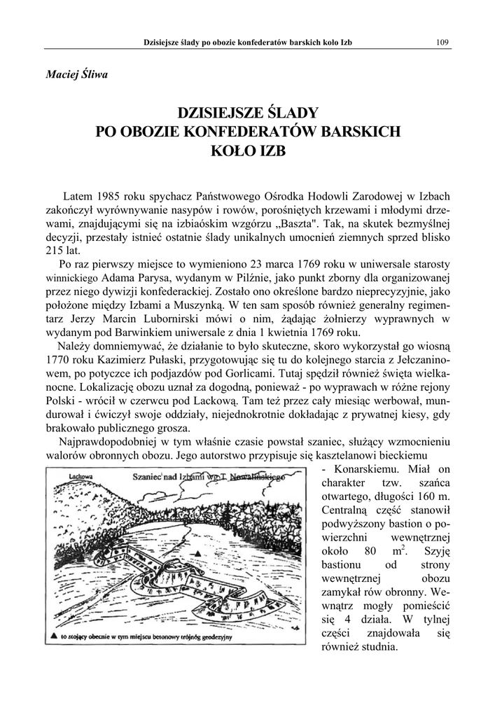 Dzisiejsze ślady po obozie konfederatów barskich koło Izb 109 Maciej Śliwa DZISIEJSZE ŚLADY PO OBOZIE KONFEDERATÓW BARSKICH KOŁO IZB Latem 1985 roku spychacz Państwowego Ośrodka Hodowli Zarodowej w Izbach zakończył wyrównywanie nasypów i rowów, porośniętych krzewami i młodymi drzewami, znajdującymi się na izbiaóskim wzgórzu „Baszta". Tak, na skutek bezmyślnej decyzji, przestały istnieć ostatnie ślady unikalnych umocnień ziemnych sprzed blisko 215 lat. Po raz pierwszy miejsce to wymieniono 23 marca 1769 roku w uniwersale starosty winnickiego Adama Parysa, wydanym w Pilźnie, jako punkt zborny dla organizowanej przez niego dywizji konfederackiej. Zostało ono określone bardzo nieprecyzyjnie, jako położone między Izbami a Muszynką. W ten sam sposób również generalny regimentarz Jerzy Marcin Lubornirski mówi o nim, żądając żołnierzy wyprawnych w wydanym pod Barwinkiem uniwersale z dnia 1 kwietnia 1769 roku. Należy domniemywać, że działanie to było skuteczne, skoro wykorzystał go wiosną 1770 roku Kazimierz Pułaski, przygotowując się tu do kolejnego starcia z Jełczaninowem, po potyczce ich podjazdów pod Gorlicami. Tutaj spędził również święta wielkanocne. Lokalizację obozu uznał za dogodną, ponieważ - po wyprawach w różne rejony Polski - wrócił w czerwcu pod Lackową. Tam też przez cały miesiąc werbował, mundurował i ćwiczył swoje oddziały, niejednokrotnie dokładając z prywatnej kiesy, gdy brakowało publicznego grosza. Najprawdopodobniej w tym właśnie czasie powstał szaniec, służący wzmocnieniu walorów obronnych obozu. Jego autorstwo przypisuje się kasztelanowi bieckiemu - Konarskiemu. Miał on charakter tzw. szańca otwartego, długości 160 m. Centralną część stanowił podwyższony bastion o powierzchni wewnętrznej około 80 m2. Szyję bastionu od strony wewnętrznej obozu zamykał rów obronny. Wewnątrz mogły pomieścić się 4 działa. W tylnej części znajdowała się również studnia. 110 Maciej Śliwa W obie strony wybiegały ramiona szańca o długości 50 metrów, tworząc kąt 160 stopni. Na końcu każdego znajdował się mały bastion o powierzchni około 65 m2. Mogły one pomieścić po dwa działa. Umożliwiały także odpieranie ataków bocznych oraz obronę rowów ramion. Przy takiej konstrukcji załoga powinna była składać się ze 180 ludzi, przy obronie w jednym szeregu, lub 300 - w przypadku obrony w dwóch szeregach. Umieszczenie w środkowej części górującego nad całością bastionu umożliwiało jego obronę nawet wtedy, kiedy przeciwnik zdobył bastiony boczne lub ramiona. Usytuowanie obozu posiadało jedną wadę. Dostrzegł ją, w lipcu 1770 roku, inżynier francuski de La Serre, specjalista od fortyfikacji, skierowany tu przez Generalność, rezydującą w tym czasie w Preszowie. Było nią samo wzniesienie, na którym wybudowano obóz. Jego wypukłe zbocza mogły ułatwić nieprzyjacielowi dojście w bezpośrednią bliskość pozycji konfederatów oraz utrudniały ogląd przedpola. Zapewne z tych powodów wzniesiono kamienną basztę. Niestety, trudno w tej chwili stwierdzić, czy stanowiła ona zwieńczenie bastionu centralnego szańca, czy też odrębną budowlę obozu. Bardzo ważnym atutem obozu izbiańskiego była bezpośrednia bliskość najwyższego szczytu Beskidu Niskiego, Lackowej. Źle dostępny teren, utrudniający poruszanie się między obozami, zmusił zapewne dowódców konfederackich do wprowadzenia systemu szybkiego porozumiewania. Wykorzystano w tym celu niezalesiony wówczas szczyt tej góry jako punkt sygnalizacji flagowej. Był on doskonale widoczny nie tylko z obozu w Muszynce, ale również z obozu koło Wysowej. Podobnie z obozu w Koniecznej (15 km w linii prostej) oraz z Gaboltova, wykorzystywanego jako bezpieczna siedziba po stronie węgierskiej przez marszałków skupionych w tzw. „grupie gabułtowskiej". 25 lipca 1770 roku przeciwko Pułaskiemu wyruszył z Krakowa generał wojsk rosyjskich Drewicz. Bardzo szybko - przez Zakliczyn, Gorlice i Grybów - dotarł w Beskidy na czele 3200 żołnierzy. Tymczasem siły konfederackie w Izbach i pobliskiej Koniecznej liczyły łącznie około 1000 ludzi. Powiadomiona o tym fakcie Generalność nakazała w wydanych 27 lipca rozkazach skupianie sił i organizowanie obrony w drugim, trudniej dostępnym obozie Pułaskiego pod Wysowa. W związku z tym cała załoga obozu izbiańskiego wraz z uzbrojeniem została tam przeniesiona. Po klęsce w bitwie pod Wysowa konfederaci przeszli za granicę węgierską Nigdy potem miejsce to przez konfederatów nie było już wykorzystane. A zabór południowych ziem polskich przez Austrię wyeliminował go z zasięgu działań wojsk konfederackich. W takim stanie umocnienia przetrwały blisko 130 lat, kiedy to, na przełomie wieków, rozebrano kamienną basztę. Pozyskany w ten sposób kamień został użyty do budowy plebanii. Następnie, po komasacji w okresie międzywojennym, nowy właściciel rozpoczął niwelację terenu. W jej wyniku przestał istnieć prawy bastion i część ramienia. W czasie II wojny światowej szaniec został włączony w system niemieckich okopów. Środkowy bastion posłużył za stanowisko obserwacyjne, a jego przedpiersie przecięto rowem łącznikowym. I taki stan utrzymał się do wspomnianego roku 1985. Dzisiejsze ślady po obozie konfederatów barskich koło Izb 111 Podczas jednej z wycieczek w te okolice przed trzema laty, przy drodze do przełęczy Beskid, odnalazłem mocno zdeformowaną kulę muszkietową. To utwierdziło mnie w przekonaniu, że można jeszcze coś ocalić z tamtych czasów. Przez następne ponad dwa lata przeszukiwania stoków Lackowej udało mi się zgromadzić pokaźny zbiór pamiątek konfederackich. Naj liczniejszą grupą znalezisk sąprzedmioty ołowiane. Najwięcej z tego metalu wykonywano kul do muszkietów. Pociski mają przeróżne średnice, co świadczy o bardzo dużym zróżnicowaniu broni palne