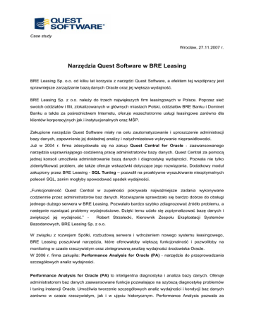 Case study Wrocław, 27.11.2007 r. Narzędzia Quest Software w BRE Leasing BRE Leasing Sp. o.o. od kilku lat korzysta z narzędzi Quest Software, a efektem tej współpracy jest sprawniejsze zarządzanie bazą danych Oracle oraz jej większa wydajność. BRE Leasing Sp. z o.o. należy do trzech największych firm leasingowych w Polsce. Poprzez sieć swoich oddziałów i filii, zlokalizowanych w głównych miastach Polski, oddziałów BRE Banku i Dominet Banku a także za pośrednictwem Internetu, oferuje wszechstronne usługi leasingowe zarówno dla klientów korporacyjnych jak i instytucjonalnych oraz MŚP. Zakupione narzędzia Quest Software miały na celu zautomatyzowanie i uproszczenie administracji bazy danych, zapewnienie jej dokładnej analizy i natychmiastowe wykrywanie nieprawidłowości. Już w 2004 r. firma zdecydowała się na zakup Quest Central for Oracle - zaawansowanego narzędzia usprawniającego codzienną pracę administratorów bazy danych. Quest Central za pomocą jednej konsoli umożliwia administrowanie bazą danych i diagnostykę wydajności. Pozwala nie tylko zidentyfikować problem, ale także oferuje wskazówki dotyczące jego rozwiązania. Dodatkowy moduł zakupiony przez BRE Leasing - SQL Tuning – pozwolił na proaktywne wyszukiwanie nieoptymalnych poleceń SQL, zanim mogłyby spowodować spadek wydajności. „Funkcjonalność Quest Central w zupełności pokrywała najważniejsze zadania wykonywane codziennie przez administratorów baz danych. Rozwiązanie sprawdzało się bardzo dobrze do obsługi jednego dużego serwera w BRE Leasing. Pozwalało bardzo szybko zdiagnozować źródło problemu, a następnie rozwiązać problemy wydajnościowe. Dzięki temu udało się zoptymalizować bazę danych i zwiększyć jej wydajność.” - Robert Strzelecki, Kierownik Zespołu Eksploatacji Systemów Bazodanowych, BRE Leasing Sp. z o.o. W związku z rozwojem Spółki, rozbudową serwera i wdrożeniem nowego systemu leasingowego, BRE Leasing poszukiwał narzędzia, które oferowałoby większą funkcjonalność i pozwoliłoby na monitoring w czasie rzeczywistym oraz zintegrowaną analizę wydajności środowiska Oracle. W 2006 r. firma zakupiła: Performance Analysis for Oracle (PA) - narzędzie do przeprowadzania szczegółowych analiz wydajności. Performance Analysis for Oracle (PA) to inteligentna diagnostyka i analiza bazy danych. Oferuje administratorom baz danych zaawansowane funkcje pozwalające na szybszą diagnostykę problemów i tuning instancji Oracle. Umożliwia tworzenie szczegółowych analiz wydajności i kondycji baz danych zarówno w czasie rzeczywistym, jak i w ujęciu historycznym. Performance Analysis pozwala za pomocą technologii IntelliProfile na inteligentne ustalenie linii bazowej wydajności. Po jej przekroczeniu, PA pokazuje analizę problemów i rekomendowane działania w celu natychmiastowej poprawy wydajności bazy danych. Wiele problemów wydajnościowych baz danych jest spowodowanych przez wprowadzane zmiany, PA automatycznie śledzi wszystkie zmiany i ustala ich wpływ na wydajność. Dzięki stałemu monitoringowi 24x7 analizowane są informacje dotyczące wydajności środowiska bazodanowego, co pozwala natychmiast wykryć nieprawidłowości i anomalie. Dzięki przejrzystemu graficznemu interfejsowi zarządzanie bazą danych i jej tuning za pomocą PA stały się proste i intuicyjne. „Performance Analysis znacznie przyspiesza i ułatwia tuning bazy danych. Część porad w przypadku wykrycia spadku wydajności, można wykorzystać automatycznie i z natychmiastowym efektem. Dodatkowo bez potrzeby zagłębiania się w przyczyny problemów, ponieważ PA robi to za administratora. Kiedy wdrażaliśmy nowy system leasingowy, pojawiły się problemy z zapytaniami SQL. Performance Analysis pokazał jasno i przejrzyście, które zapytania powodowały błędy na bazie danych.” - Robert Strzelecki, Kierownik Zespołu Eksploatacji Systemów Bazodanowych, BRE Leasing Sp. z o.o. Konsola Performance Analysis Dodatkowymi narzędziami Quest Software zakupionymi w 2006 r. przez BRE Leasing Sp. z o.o. były rozwiązania do poprawy zarządzania aplikacjami windowsowymi, a w szczególności wspomagające pracę systemu poczty e-mail, który jest ważnym kanałem komunikacji wewnętrznej i zewnętrznej Firmy. Są to Quest MessageStats (450 licencji) oraz Quest Group Policy Extensions for Desktops (360 licencji). Quest MessageStats dostarcza kompletnych informacji na temat całego środowiska Microsoft Exchange. Pomaga administratorom lepiej zarządzać systemem pocztowym, wykorzystaniem zasobów serwera i wydajnością. MessageStats mierzy ruch wiadomości e-mail w sieci, odstępstwa od polityki bezpieczeństwa, sprawdza także poziom usług SLA. Zarówno z perspektywy biznesowej, jak i technicznej, MessageStats wpływa na usprawnienie systemu pocztowego. Raporty, analizy i statystyki tworzone za pomocą MessageStats wspomagają pracę kadry zarządzającej i administratorów IT oraz pomagają w zapewnieniu zgodności pracy środowiska z wewnętrznymi i zewnętrznymi regulacjami. Drugie narzędzie: Quest Group Policy Extensions for Desktops pomaga administratorom efektywnie zarządzać obiektami GPO i automatyzuje zarządzanie stacjami roboczymi. Pozwala użytkownikom na szybkie zmiany hasła, łatwiejsze zarządzanie i upgrade profili w MS Outlook. Administratorzy mogą zarządzać profilami użytkowników i ustawieniami konfiguracyjnymi (umożliwia dowolne zmiany ustawień m.in. konfigurację aplikacji MS, np. Outlook, Word czy Excel) bez konieczności wprowadzania zmian na każdym komputerze użytkownika. W maju 2007 r. BRE Leasing zakupił kolejne narzędzie Quest Software: Spotlight on Active Directory, umożliwiające szczegółową analizę procesów zachodzących w środowisku AD. Narzędzie to będzie wykorzystywane przez administratorów do przeprowadzania w czasie rzeczywistym pełnej diagnostyki oraz wykrywania i rozwiązywania probl