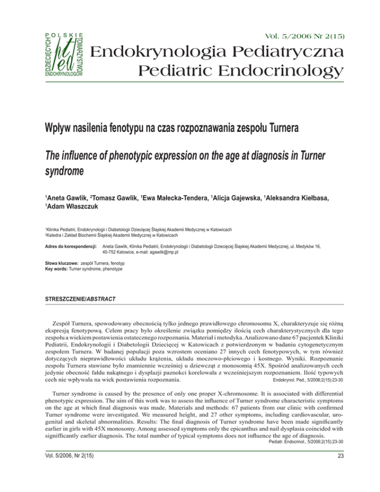 Vol. 5/2006 Nr 2(15) Endokrynologia Pediatryczna Pediatric Endocrinology Wpływ nasilenia fenotypu na czas rozpoznawania zespołu Turnera The influence of phenotypic expression on the age at diagnosis in Turner syndrome Aneta Gawlik, 2Tomasz Gawlik, 1Ewa Małecka-Tendera, 1Alicja Gajewska, 1Aleksandra Kiełbasa, 1 Adam Właszczuk 1 1 2 Klinika Pediatrii, Endokrynologii i Diabetologii Dziecięcej Śląskiej Akademii Medycznej w Katowicach Katedra i Zakład Biochemii Śląskiej Akademii Medycznej w Katowicach Adres do korespondencji: Aneta Gawlik, Klinika Pediatrii, Endokrynologii i Diabetologii Dziecięcej Śląskiej Akademii Medycznej, ul. Medyków 16, 40-752 Katowice, e-mail: [email protected] Słowa kluczowe: zespół Turnera, fenotyp Key words: Turner syndrome, phenotype STRESZCZENIE/ABSTRACT Zespół Turnera, spowodowany obecnością tylko jednego prawidłowego chromosomu X, charakteryzuje się różną ekspresją fenotypową. Celem pracy było określenie związku pomiędzy ilością cech charakterystycznych dla tego zespołu a wiekiem postawienia ostatecznego rozpoznania. Materiał i metodyka. Analizowano dane 67 pacjentek Kliniki Pediatrii, Endokrynologii i Diabetologii Dziecięcej w Katowicach z potwierdzonym w badaniu cytogenetycznym zespołem Turnera. W badanej populacji poza wzrostem oceniano 27 innych cech fenotypowych, w tym również dotyczących nieprawidłowości układu krążenia, układu moczowo-płciowego i kostnego. Wyniki. Rozpoznanie zespołu Turnera stawiane było znamiennie wcześniej u dziewcząt z monosomią 45X. Spośród analizowanych cech jedynie obecność fałdu nakątnego i dysplazji paznokci korelowała z wcześniejszym rozpoznaniem. Ilość typowych cech nie wpływała na wiek postawienia rozpoznania. Endokrynol. Ped., 5/2006;2(15):23-30 Turner syndrome is caused by the presence of only one proper X-chromosome. It is associated with differential phenotypic expression. The aim of this work was to assess the influence of Turner syndrome characteristic symptoms on the age at which final diagnosis was made. Materials and methods: 67 patients from our clinic with confirmed Turner syndrome were investigated. We measured height, and 27 other symptoms, including cardiovascular, urogenital and skeletal abnormalities. Results: The final diagnosis of Turner syndrome have been made significantly earlier in girls with 45X monosomy. Among assessed symptoms only the epicanthus and nail dysplasia coincided with signifficantly earlier diagnosis. The total number of typical symptoms does not influence the age of diagnosis. Pediatr. Endocrinol., 5/2006;2(15):23-30 Vol. 5/2006, Nr 2(15) 23 Praca oryginalna Wstęp Brak obecnie opracowań statystycznych szacujących liczbę pacjentek z zespołem Turnera (ZT) w Polsce. Według danych literatury jest to jedna z częstszych wad genetycznych, występująca u jednego na dwa tysiące żywo urodzonych noworodków płci żeńskiej [1]. Zaburzenie to spowodowane jest całkowitą lub częściową monosomią chromosomu X, obecną we wszystkich bądź tylko w niektórych komórkach. Ocenia się, że jest to zaledwie jeden procent płodów z monosomią chromosomu X. Pozostałe nie przeżywają do końca ciąży i są przyczyną aż 10% samoistnych poronień [2–4]. Nazwa zespołu pochodzi od nazwiska jednego z pierwszych badaczy, amerykańskiego internisty Henryka Turnera, który w roku 1938 opublikował pracę o siedmiu pacjentkach ze specyficznym fenotypem: niedoborem wzrostu, brakiem cech dojrzewania, płetwistością szyi oraz koślawością łokci [5]. Osiem lat wcześniej niemiecki pediatra, Otto Ullrich, prezentował przypadek 8-letniej dziewczynki, u której obserwował płetwistość szyi, ptozę, mikrognację, wysoko wysklepione podniebienie, nisko osadzone małżowiny uszne, nisko schodzącą linię owłosienia na karku oraz hipoplastyczne paznokcie [6]. Dopiero od roku 1959 specyficzny fenotyp łączono z liczbowymi lub strukturalnymi aberracjami chromosomu X. Właśnie wtedy po raz pierwszy u pacjentki z objawami zespołu Turnera stwierdzono nieprawidłowy żeński kariotyp – 45,X [7]. Obecnie rozpoznanie zespołu Turnera (Ullrich-Turnera) może być postawione jedynie po otrzymaniu nieprawidłowego wyniku badania cytogenetycznego. Prawidłowy kariotyp w limfocytach krwi obwodowej przy klasycznym fenotypie pacjentki nie zwalnia nas jednak od poszerzenia diagnostyki o badanie fibroblastów skóry [8]. U noworodków i niemowląt płci żeńskiej podejrzenie zespołu Turnera budzą: obrzęki limfatyczne stóp i dłoni, płetwistość szyi (często stwierdzane już w życiu płodowym w badaniu ultrasonograficznym), nisko schodząca na kark linia owłosienia, nisko osadzone małżowiny uszne, małożuchwie, wysoko wysklepione podniebienie, zmarszczka nakątna, wady układu krążenia, wady układu moczowego, często niska urodzeniowa masa i długość ciała. W kolejnych latach dołączają się inne zaburzenia, takie jak: zmniejszenie tempa wzrastania, niedobór wzrostu, brak cech dojrzewania, opóźnione dojrzewanie, zaburzenia miesiączkowania, wady układu kostnego, liczne znamiona barwnikowe, bielactwo, 24 Endokrynol. Ped., 5/2006;2(15):23-30 hipoplastyczne paznokcie, przewlekłe zapalenie ucha środkowego, nawracające infekcje dróg moczowych, nadciśnienie tętnicze, otyłość, zaburzenia gospodarki węglowodanowej i lipidowej, niedoczynność tarczycy oraz celiakia. Można przypuszczać, że nasilenie fenotypu powinno mieć odzwierciedlenie w wieku postawienia rozpoznania ZT: im więcej cech fenotypowych i im bardziej są one wyrażone, tym wcześniejsza diagnoza. Celem naszej pracy było określenie częstości występowania poszczególnych cech fenotypowych u badanych pacjentek oraz ustalenie związku miedzy nasileniem fenotypu a czasem rozpoznania zespołu Turnera. Materiał i metoda Badaniem objęto grupę 67 dziewcząt z zespołem Turnera, pacjentek Kliniki Endokrynologii i Diabetologii Dziecięcej Górnośląsk