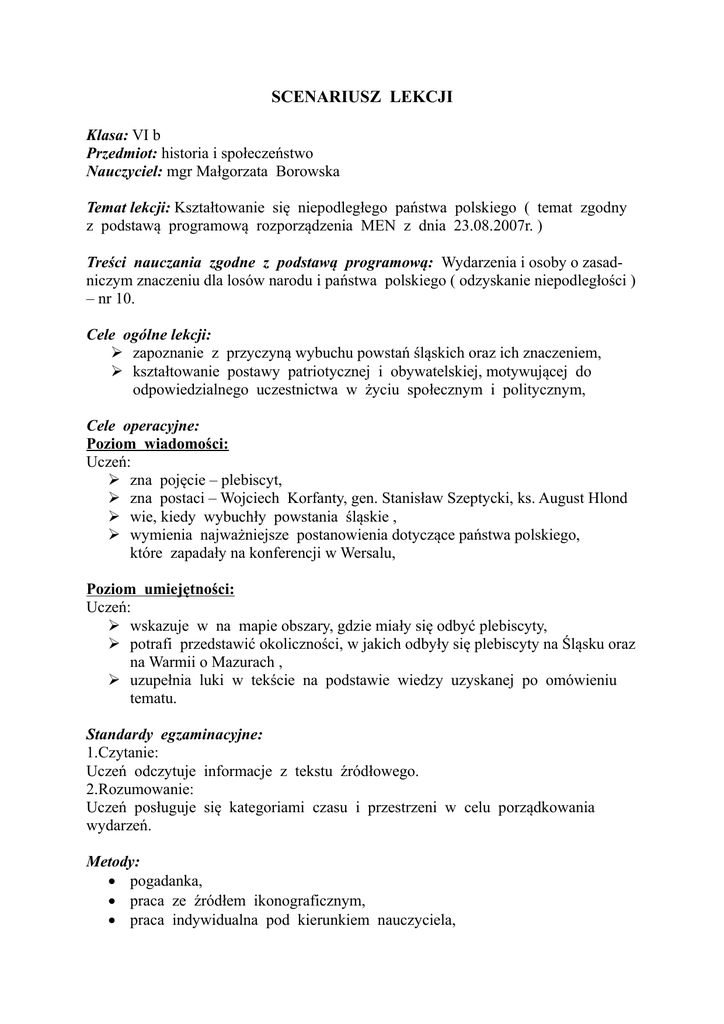 SCENARIUSZ LEKCJI Klasa: VI b Przedmiot: historia i społeczeństwo Nauczyciel: mgr Małgorzata Borowska Temat lekcji: Kształtowanie się niepodległego państwa polskiego ( temat zgodny z podstawą programową rozporządzenia MEN z dnia 23.08.2007r. ) Treści nauczania zgodne z podstawą programową: Wydarzenia i osoby o zasadniczym znaczeniu dla losów narodu i państwa polskiego ( odzyskanie niepodległości ) – nr 10. Cele ogólne lekcji: zapoznanie z przyczyną wybuchu powstań śląskich oraz ich znaczeniem, kształtowanie postawy patriotycznej i obywatelskiej, motywującej do odpowiedzialnego uczestnictwa w życiu społecznym i politycznym, Cele operacyjne: Poziom wiadomości: Uczeń: zna pojęcie – plebiscyt, zna postaci – Wojciech Korfanty, gen. Stanisław Szeptycki, ks. August Hlond wie, kiedy wybuchły powstania śląskie , wymienia najważniejsze postanowienia dotyczące państwa polskiego, które zapadały na konferencji w Wersalu, Poziom umiejętności: Uczeń: wskazuje w na mapie obszary, gdzie miały się odbyć plebiscyty, potrafi przedstawić okoliczności, w jakich odbyły się plebiscyty na Śląsku oraz na Warmii o Mazurach , uzupełnia luki w tekście na podstawie wiedzy uzyskanej po omówieniu tematu. Standardy egzaminacyjne: 1.Czytanie: Uczeń odczytuje informacje z tekstu źródłowego. 2.Rozumowanie: Uczeń posługuje się kategoriami czasu i przestrzeni w celu porządkowania wydarzeń. Metody: pogadanka, praca ze źródłem ikonograficznym, praca indywidualna pod kierunkiem nauczyciela, Formy pracy: zbiorowa, indywidualna. Środki i materiały dydaktyczne: podręcznik Wiesławy Surdyk-Fertsch i Bogumiły Olszewskiej „ My i historia. Historia i społeczeństwo 6 ” Wydawnictwo Szkolne PWN mapa ścienna, karty pracy dla uczniów, ilustracje postaci historycznych. Struktura i opis lekcji: 1.Czynności organizacyjno-porządkowe. Powitanie uczniów, sprawdzenie obecności. Nawiązanie do treści wcześniej poznanych – Walka Polaków o wolność w czasie I wojny światowej. Działalność I. J. Paderewskiego i J. Piłsudskiego. 2.Zapisanie nowego tematu lekcji. Jakie były postanowienia wobec państwa polskiego na konferencji pokojowej w Wersalu ? Odczytanie informacji z podręcznika. Co było przyczyną wybuchu powstań śląskich ? W jakich latach wybuchały kolejne powstania śląskie ? Kto był dyktatorem trzeciego powstania śląskiego ? 3.Nauczyciel wspólnie z uczniami definiuje pojęcie: plebiscyt. Porównanie definicji uczniowskiej ze słownikową. Opowiada uczniom o okolicznościach , w jakich został przeprowadzony plebiscyt na Śląsku oraz na Warmii i Mazurach. Za przyłączeniem Śląska do Polski opowiedziało się 40,3% głosujących, a za Niemcami 59,4%. Polska miała uzyskać tylko powiat pszczyński i rybnicki. W tej sytuacji Korfanty wezwał do strajku generalnego, który przerodził się w powstanie. Oddziały powstańcze opanowały prawie cały obszar plebiscytowy. Wówczas Niemcy rozpoczęli kontrofensywę, w czasie której stoczono największą bitwę o Górę Świętej Anny. Pod naciskiem aliantów walki przerwano. Politycznym efektem powstań stał się nowy podział Śląska – na warunkach korzystniejszych dla strony polskiej. W granicach państwa polskiego znalazło się około 1/3 obszaru plebiscytowego wraz z ważnymi ośrodkami przemysłowymi. W czerwcu następnego roku na Śląsk wkroczyły wojska polskie dowodzone przez gen. Stanisława Szeptyckiego, a centralne uroczystości przyłączenia uzyskanych terenów odbyły się 16 lipca 1922r. w Katowicach. W 1922r. ks. August Hlond zostaje mianowany administratorem apostolskim w Katowicach, a później po utworzeniu diecezji katowickiej jej pierwszym biskupem. 4.Podsumowanie zajęć – karty pracy z zadaniami dla uczniów. Ocena aktywności uczniów na zajęciach.