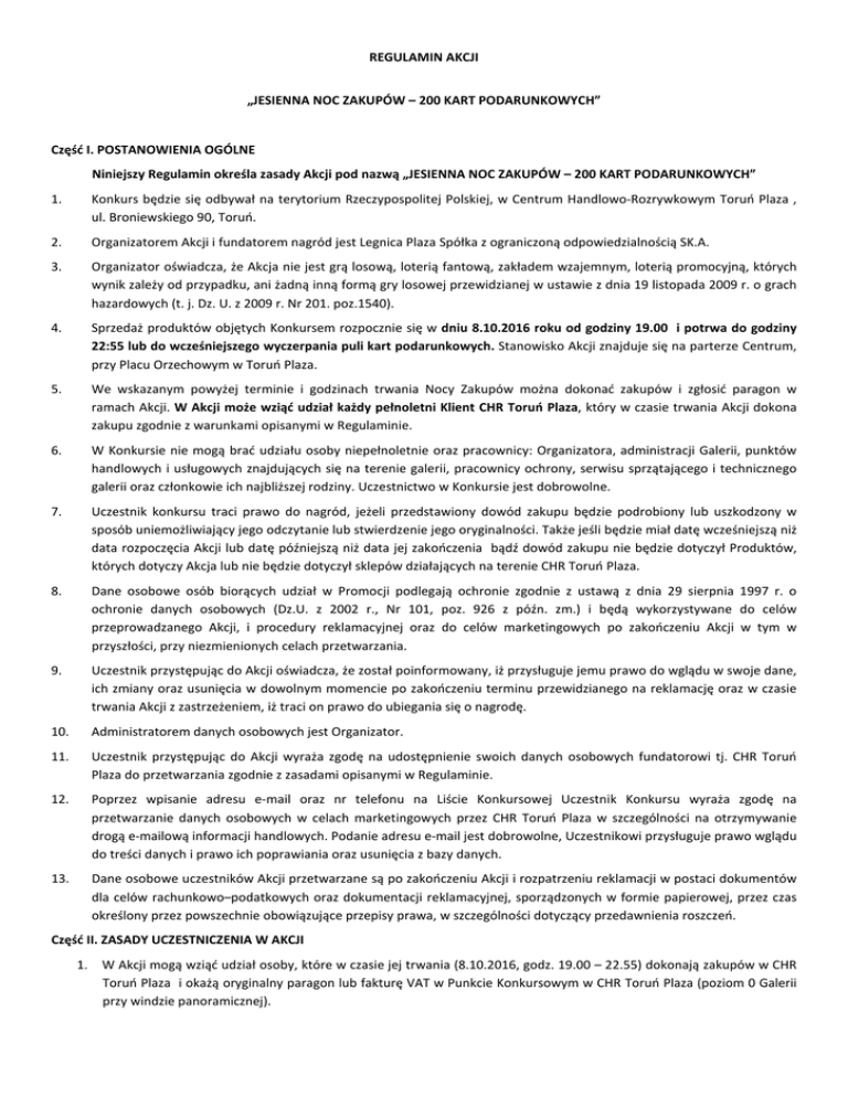 REGULAMIN AKCJI „JESIENNA NOC ZAKUPÓW – 200 KART PODARUNKOWYCH” Część I. POSTANOWIENIA OGÓLNE Niniejszy Regulamin określa zasady Akcji pod nazwą „JESIENNA NOC ZAKUPÓW – 200 KART PODARUNKOWYCH” 1. Konkurs będzie się odbywał na terytorium Rzeczypospolitej Polskiej, w Centrum Handlowo-Rozrywkowym Toruń Plaza , ul. Broniewskiego 90, Toruń. 2. Organizatorem Akcji i fundatorem nagród jest Legnica Plaza Spółka z ograniczoną odpowiedzialnością SK.A. 3. Organizator oświadcza, że Akcja nie jest grą losową, loterią fantową, zakładem wzajemnym, loterią promocyjną, których wynik zależy od przypadku, ani żadną inną formą gry losowej przewidzianej w ustawie z dnia 19 listopada 2009 r. o grach hazardowych (t. j. Dz. U. z 2009 r. Nr 201. poz.1540). 4. Sprzedaż produktów objętych Konkursem rozpocznie się w dniu 8.10.2016 roku od godziny 19.00 i potrwa do godziny 22:55 lub do wcześniejszego wyczerpania puli kart podarunkowych. Stanowisko Akcji znajduje się na parterze Centrum, przy Placu Orzechowym w Toruń Plaza. 5. We wskazanym powyżej terminie i godzinach trwania Nocy Zakupów można dokonać zakupów i zgłosić paragon w ramach Akcji. W Akcji może wziąć udział każdy pełnoletni Klient CHR Toruń Plaza, który w czasie trwania Akcji dokona zakupu zgodnie z warunkami opisanymi w Regulaminie. 6. W Konkursie nie mogą brać udziału osoby niepełnoletnie oraz pracownicy: Organizatora, administracji Galerii, punktów handlowych i usługowych znajdujących się na terenie galerii, pracownicy ochrony, serwisu sprzątającego i technicznego galerii oraz członkowie ich najbliższej rodziny. Uczestnictwo w Konkursie jest dobrowolne. 7. Uczestnik konkursu traci prawo do nagród, jeżeli przedstawiony dowód zakupu będzie podrobiony lub uszkodzony w sposób uniemożliwiający jego odczytanie lub stwierdzenie jego oryginalności. Także jeśli będzie miał datę wcześniejszą niż data rozpoczęcia Akcji lub datę późniejszą niż data jej zakończenia bądź dowód zakupu nie będzie dotyczył Produktów, których dotyczy Akcja lub nie będzie dotyczył sklepów działających na terenie CHR Toruń Plaza. 8. Dane osobowe osób biorących udział w Promocji podlegają ochronie zgodnie z ustawą z dnia 29 sierpnia 1997 r. o ochronie danych osobowych (Dz.U. z 2002 r., Nr 101, poz. 926 z późn. zm.) i będą wykorzystywane do celów przeprowadzanego Akcji, i procedury reklamacyjnej oraz do celów marketingowych po zakończeniu Akcji w tym w przyszłości, przy niezmienionych celach przetwarzania. 9. Uczestnik przystępując do Akcji oświadcza, że został poinformowany, iż przysługuje jemu prawo do wglądu w swoje dane, ich zmiany oraz usunięcia w dowolnym momencie po zakończeniu terminu przewidzianego na reklamację oraz w czasie trwania Akcji z zastrzeżeniem, iż traci on prawo do ubiegania się o nagrodę. 10. Administratorem danych osobowych jest Organizator. 11. Uczestnik przystępując do Akcji wyraża zgodę na udostępnienie swoich danych osobowych fundatorowi tj. CHR Toruń Plaza do przetwarzania zgodnie z zasadami opisanymi w Regulaminie. 12. Poprzez wpisanie adresu e-mail oraz nr telefonu na Liście Konkursowej Uczestnik Konkursu wyraża zgodę na przetwarzanie danych osobowych w celach marketingowych przez CHR Toruń Plaza w szczególności na otrzymywanie drogą e-mailową informacji handlowych. Podanie adresu e-mail jest dobrowolne, Uczestnikowi przysługuje prawo wglądu do treści danych i prawo ich poprawiania oraz usunięcia z bazy danych. 13. Dane osobowe uczestników Akcji przetwarzane są po zakończeniu Akcji i rozpatrzeniu reklamacji w postaci dokumentów dla celów rachunkowo–podatkowych oraz dokumentacji reklamacyjnej, sporządzonych w formie papierowej, przez czas określony przez powszechnie obowiązujące przepisy prawa, w szczególności dotyczący przedawnienia roszczeń. Część II. ZASADY UCZESTNICZENIA W AKCJI 1. W Akcji mogą wziąć udział osoby, które w czasie jej trwania (8.10.2016, godz. 19.00 – 22.55) dokonają zakupów w CHR Toruń Plaza i okażą oryginalny paragon lub fakturę VAT w Punkcie Konkursowym w CHR Toruń Plaza (poziom 0 Galerii przy windzie panoramicznej). 2. Po okazaniu paragonu/faktury VAT Uczestnik Akcji otrzyma Kartę Podarunkową Toruń Plaza o wartości 30 PLN, do wykorzystania przez cały rok w sklepach Toruń Plaza. Regulamin Kart Podarunkowych: http://www.torunplaza.pl/pl/sklepy-i-rozrywka/karta-podarunkowa.html 3. Warunkiem uczestnictwa w Akcji jest dokonanie w sklepach oraz punktach usługowych znajdujących się na terenie CHR Toruń Plaza zakupów za kwotę min. 200 zł brutto (można łączyć 2 paragony np. pierwszy o wartości 120 zł, a drugi 80 zł lub więcej). 4. Przy zakupie za wielokrotność kwoty 200 zł brutto jednemu Uczestnikowi Akcji, okazującemu paragon, nie przysługują dodatkowe karty. 5. Sprzedażą konkursową objęte są wszystkie towary dostępne w sklepach na terenie CHR Toruń Plaza z wyłączeniem kantoru, napojów alkoholowych, produktów tytoniowych, produktów leczniczych (leków). Wyłączone są również transakcje dokonane w punkcie lotto, zakładach bukmacherskich, kantorach oraz wpłaty i wypłaty bankomatowe. W przypadku dowodów zakupów, na których widnieją zakupy produktów wyłączonych z Akcji, podstawą do wydania nagrody będzie kwota dowodu zakupu, pomniejszona o wartość zakupu produktów wyłączonych. 6. Odbiór nagrody należy potwierdzić podpisem na protokole. Wydanie nagrody następuje po podaniu danych osobowych (imię, nazwisko, adres, e-mail, nr. telefonu) 7. Organizator stempluje paragony, na podstawie których wydano nagrodę, w celu wyeliminowania ich z ponownego udziału w Akcji. 8. W Akcji jeden Uczestnik może wziąć udział jeden raz. 9. W przypadku powzięcia przez Organizatora uzasadnionych wątpliwości co do autentyczności paragonu, wydanie nagrody może zostać wstrzymane do momentu potwierdzenia oryginal