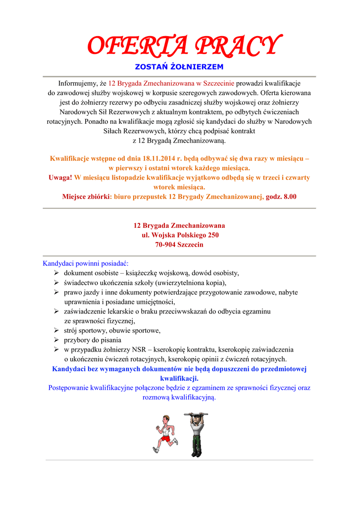 OFERTA PRACY ZOSTAŃ ŻOŁNIERZEM Informujemy, że 12 Brygada Zmechanizowana w Szczecinie prowadzi kwalifikacje do zawodowej służby wojskowej w korpusie szeregowych zawodowych. Oferta kierowana jest do żołnierzy rezerwy po odbyciu zasadniczej służby wojskowej oraz żołnierzy Narodowych Sił Rezerwowych z aktualnym kontraktem, po odbytych ćwiczeniach rotacyjnych. Ponadto na kwalifikacje mogą zgłosić się kandydaci do służby w Narodowych Siłach Rezerwowych, którzy chcą podpisać kontrakt z 12 Brygadą Zmechanizowaną. Kwalifikacje wstępne od dnia 18.11.2014 r. będą odbywać się dwa razy w miesiącu – w pierwszy i ostatni wtorek każdego miesiąca. Uwaga! W miesiącu listopadzie kwalifikacje wyjątkowo odbędą się w trzeci i czwarty wtorek miesiąca. Miejsce zbiórki: biuro przepustek 12 Brygady Zmechanizowanej, godz. 8.00 12 Brygada Zmechanizowana ul. Wojska Polskiego 250 70-904 Szczecin Kandydaci powinni posiadać: dokument osobiste – książeczkę wojskową, dowód osobisty, świadectwo ukończenia szkoły (uwierzytelniona kopia), prawo jazdy i inne dokumenty potwierdzające przygotowanie zawodowe, nabyte uprawnienia i posiadane umiejętności, zaświadczenie lekarskie o braku przeciwwskazań do odbycia egzaminu ze sprawności fizycznej, strój sportowy, obuwie sportowe, przybory do pisania w przypadku żołnierzy NSR – kserokopię kontraktu, kserokopię zaświadczenia o ukończeniu ćwiczeń rotacyjnych, kserokopię opinii z ćwiczeń rotacyjnych. Kandydaci bez wymaganych dokumentów nie będą dopuszczeni do przedmiotowej kwalifikacji. Postępowanie kwalifikacyjne połączone będzie z egzaminem ze sprawności fizycznej oraz rozmową kwalifikacyjną. Szczegółowe informacje dotyczące postępowania kwalifikacyjnego można uzyskać w WKU w Garwolinie w pokoju nr 9 pod nr tel. (25) 682 23 15 w. 222 oraz na oficjalnej stronie 12 Brygady Zmechanizowanej www.12bz.wp.mil.pl Uwaga: przed udaniem się na kwalifikacje należy upewnić się telefonicznie o celowości wyjazdu.
