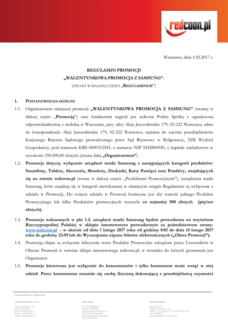 Warszawa, dnia 1.02.2017 r. REGULAMIN PROMOCJI „WALENTYNKOWA PROMOCJA Z SAMSUNG”. (ZWANY W DALSZEJ CZĘŚCI „REGULAMINEM”) 1. POSTANOWIENIA OGÓLNE 1.1. Organizatorem niniejszej promocji „WALENTYNKOWA PROMOCJA Z SAMSUNG” (zwanej w dalszej części „Promocją”) oraz fundatorem nagród jest redcoon Polska Spółka z ograniczoną odpowiedzialnością z siedzibą w Warszawie, przy ulicy Aleje Jerozolimskie 179, 02-222 Warszawa, adres do korespondencji: Aleje Jerozolimskie 179, 02-222 Warszawa, wpisana do rejestru przedsiębiorców Krajowego Rejestru Sądowego prowadzonego przez Sąd Rejonowy w Bydgoszczy, XIII Wydział Gospodarczy, pod numerem KRS 0000312543, o numerze NIP 5542806920, o kapitale zakładowym w wysokości 350.000,00 złotych (zwana dalej „Organizatorem”). 1.2. Promocja dotyczy wyłącznie urządzeń marki Samsung z następujących kategorii produktów: Smartfony, Tablety, Akcesoria, Monitory, Drukarki, Karty Pamięci oraz Pendrivy, znajdujących się na stronie redcoon.pl (zwane w dalszej części: „Produktami Promocyjnymi”), (urządzenia marki Samsung, które znajdują się w kategorii niewskazanej w niniejszym ustępie Regulaminu są wyłączone z udziału w Promocji). Do wzięcie udziału w Promocji konieczne jest aby wartość jednego Produktu Promocyjnego lub kilku Produktów promocyjnych wynosiła co najmniej 500 złotych (pięćset złotych). 1.3. Promocja wskazanych w pkt 1.2. urządzeń marki Samsung będzie prowadzona na terytorium Rzeczypospolitej Polskiej w sklepie internetowym prowadzonym za pośrednictwem strony: www.redcoon.pl - w okresie od dnia 1 lutego 2017 roku od godziny 0:01 do dnia 14 lutego 2017 roku do godziny 23:59 lub do Wyczerpania zapasu biletów elektronicznych („Okres Promocji”). 1.4. Promocją objęte są wyłącznie fabrycznie nowe Produkty Promocyjne zakupione przez Uczestników w Okresie Promocji w serwisie sklepu internetowego redcoon.pl, w stosunku do których gwarantem jest Organizator. 1.5. Promocja kierowana jest wyłącznie do konsumentów i tylko konsument może wziąć w niej udział. Przez konsumenta rozumie się osobę fizyczną dokonującą z przedsiębiorcą czynności www.redcoon.pl | redcoon.com redcoon Polska Sp. z o. o. Dane firmy: Konto bankowe: Aleje Jerozolimskie 179 02-222 Warszawa Infolinia: 799 350 050 Telefon: (22) 888 43 21: E-Mail: [email protected] NIP: PL5542806920 REGON: 340484003 Sąd Rejonowy W Bydgoszczy XIII Wydział Gospodarczy Krajowego Rejestru Sądowego KRS: 0000312543 Bank Pekao SA Redcoon Polska Sp. z o. o. IBAN: PL 11 1240 3493 1111 0010 2054 7397 BIC: PKOPPLPW Kapitał zakładowy 350 000, 00 zł. prawnej niezwiązanej bezpośrednio z jej działalnością gospodarczą lub zawodową (art. 22¹ kodeksu cywilnego). 1.6. Osoby biorące udział w Promocji potwierdzają zapoznanie się z postanowieniami niniejszego Regulaminu. 2. ZASADY UDZIAŁU W PROMOCJI 2.1. Uczestnikiem Promocji może być jedynie osoba fizyczna, która ukończyła 18 lat, zamieszkała na terytorium Rzeczypospolitej Polskiej, posiadająca pełną zdolność do czynności prawnych, która dokonała w Okresie Promocji zakupu w serwisie sklepu internetowego redcoon.pl Produktu Promocyjnego objętego niniejszą Promocją jako konsument w rozumieniu art. 22¹ kodeksu cywilnego, spełniająca jednocześnie łącznie następujące warunki: (zwany w dalszej części „Uczestnikiem”): a) w Okresie Promocji dokona zakupu Produktu Promocyjnego lub kilku Produktów Promocyjnych za pośrednictwem sklepu internetowego redcoon Polska: www.redcoon.pl, z zastrzeżeniem, że łączna wartość jednego Produktu Promocyjnego lub kilku Produktów Promocyjnych przekroczy kwotę 500 zł (pięćset złotych) w koszyku zakupowym. Organizator jednocześnie zastrzega i doprecyzowuje, że w zdaniu powyżej nie chodzi o wartość koszyka zakupowego a o łączną wartość Produktów Promocyjnych znajdujących się w koszyku; b) spełni warunki wskazane w pkt 2.2 -2.14. Regulaminu, c) w Okresie Promocji zgłosi się po odbiór gwarantowanej nagrody w postaci 2 (słownie: dwóch) biletów do kina za pośrednictwem wiadomości e-mail, przesłanej na adres: [email protected]. 2.2. W Promocji nie mogą brać udziału: a) pracownicy Organizatora i Współorganizatora oraz pracownicy podmiotów współpracujących przy przygotowaniu i realizacji Promocji, b) współpracownicy podmiotów wymienionych pod lit. a) tj. osoby i jednostki organizacyjne współdziałające na podstawie umów cywilnoprawnych, ani też członkowie organów podmiotów wskazanych pod lit. a), c) inne osoby biorące udział w jakikolwiek sposób w organizacji i przeprowadzeniu Promocji, d) osoby najbliższe wobec osób wymienionych pod lit. a-c) powyżej, przez które rozumie się małżonków, dzieci, rodziców, teściów oraz rodzeństwo. www.redcoon.pl | redcoon.com redcoon Polska Sp. z o. o. Dane firmy: Konto bankowe: Aleje Jerozolimskie 179 02-222 Warszawa Infolinia: 799 350 050 Telefon: (22) 888 43 21: E-Mail: [email protected] NIP: PL5542806920 REGON: 340484003 Sąd Rejonowy W Bydgoszczy XIII Wydział Gospodarczy Krajowego Rejestru Sądowego KRS: 0000312543 Bank Pekao SA Redcoon Polska Sp. z o. o. IBAN: PL 11 1240 3493 1111 0010 2054 7397 BIC: PKOPPLPW Kapitał zakładowy 350 000, 00 zł. 2.3. Uczestnictwo w Promocji jest dobrowolne. 2.4. Każdy Uczestnik może wziąć udział w Promocji tylko jeden raz niezależnie od liczby zakupionych Produktów Promocyjnych. 2.5. Nagroda, o której mowa w pkt 2.6. poniżej nie przysługuje w przypadku odstąpienia przez Uczestnika od umowy sprzedaży Produktu na podstawie przepisów ustawy z dnia 30 maja 2014 r. o prawach konsumenta. Jeśli mimo skutecznego odstąpienia od umowy sprzedaży Produktu przez Uczestnika Nagroda została przekazana Uczestnikowi, to podlega ona zwrotowi na rzecz Organizatora. 2.6. Uczestnik Promocji, który w Okresie Promocji zakupi w serwisie sklepu internetowego redcoon.pl Produkt Promocyjny i spełni