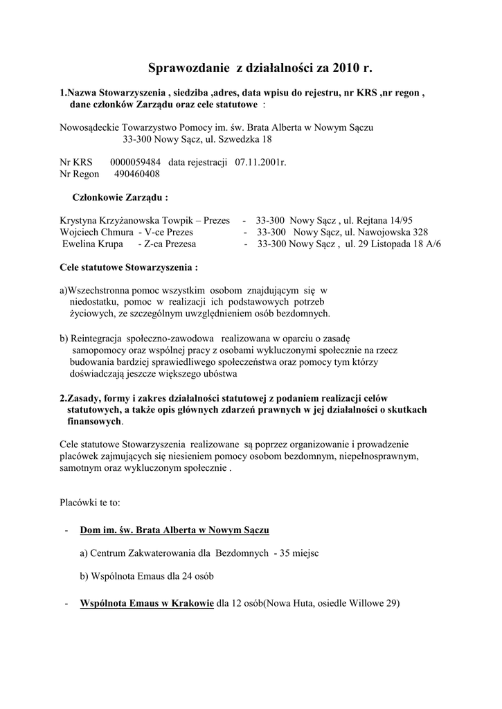 Sprawozdanie z działalności za 2010 r. 1.Nazwa Stowarzyszenia , siedziba ,adres, data wpisu do rejestru, nr KRS ,nr regon , dane członków Zarządu oraz cele statutowe : Nowosądeckie Towarzystwo Pomocy im. św. Brata Alberta w Nowym Sączu 33-300 Nowy Sącz, ul. Szwedzka 18 Nr KRS Nr Regon 0000059484 data rejestracji 07.11.2001r. 490460408 Członkowie Zarządu : Krystyna Krzyżanowska Towpik – Prezes Wojciech Chmura - V-ce Prezes Ewelina Krupa - Z-ca Prezesa - 33-300 Nowy Sącz , ul. Rejtana 14/95 - 33-300 Nowy Sącz, ul. Nawojowska 328 - 33-300 Nowy Sącz , ul. 29 Listopada 18 A/6 Cele statutowe Stowarzyszenia : a)Wszechstronna pomoc wszystkim osobom znajdującym się w niedostatku, pomoc w realizacji ich podstawowych potrzeb życiowych, ze szczególnym uwzględnieniem osób bezdomnych. b) Reintegracja społeczno-zawodowa realizowana w oparciu o zasadę samopomocy oraz wspólnej pracy z osobami wykluczonymi społecznie na rzecz budowania bardziej sprawiedliwego społeczeństwa oraz pomocy tym którzy doświadczają jeszcze większego ubóstwa 2.Zasady, formy i zakres działalności statutowej z podaniem realizacji celów statutowych, a także opis głównych zdarzeń prawnych w jej działalności o skutkach finansowych. Cele statutowe Stowarzyszenia realizowane są poprzez organizowanie i prowadzenie placówek zajmujących się niesieniem pomocy osobom bezdomnym, niepełnosprawnym, samotnym oraz wykluczonym społecznie . Placówki te to: - Dom im. św. Brata Alberta w Nowym Sączu a) Centrum Zakwaterowania dla Bezdomnych - 35 miejsc b) Wspólnota Emaus dla 24 osób - Wspólnota Emaus w Krakowie dla 12 osób(Nowa Huta, osiedle Willowe 29) Centrum Zakwaterowania dla Bezdomnych zapewnia osobom bezdomnym dostęp do pierwszej pomocy socjalnej i godnych warunków egzystencji na poziomie bezpieczeństwa socjalnego . Dodatkowo świadczymy usługi z zakresu pomocy społecznej oraz realizuje pracę socjalną przy współpracy z ośrodkami pomocy społecznej. Centrum dysponuje liczbą 35 miejsc, natomiast w okresie jesienno-zimowych zdarza się, iż przyjmowana jest większa liczba osób z uwagi na konieczność prowadzenia działań chroniących zdrowie i życie osób bezdomnych. (maks. 55 osób) W roku 2010 z pomocy Centrum Zakwaterowania skorzystało 127 osób. Wspólnota Emaus włącza osoby bezdomne w działania aktywizujące zawodowe i społeczne mające na celu przygotowanie tych osób do pełnienia właściwych ról społeczno- zawodowych w perspektywie wychodzenia z bezdomności. Wspólnoty dają szansę jej członkom na rozwój osobowy, społeczny i zawodowy poprzez wspólne życie i pracę, jak również udzielanie pomocy dla najuboższych osób oraz rodzin poprzez nieodpłatne przekazywanie mebli, odzieży itp. Członkowie wspólnoty pracują przy zbiórce, naprawie i sprzedaży używanych przedmiotów pozyskiwanych w ramach zbiórki publicznej. Środki finansowe pozostające po pokryciu kosztów funkcjonowania Wspólnoty stanowią źródło dofinansowania kosztów działalności Centrum Zakwaterowania dla Bezdomnych oraz podejmowanych licznych akcji solidarnościowych . Stowarzyszenie od 2003 roku jest członkiem międzynarodowego ruchu - stowarzyszenia „Emmaus International” skupiającego ponad 400 wspólnot i organizacji z całego świata działających na rzecz osób wykluczonych społecznie oraz przeciwdziałania przyczynom ubóstwa. We Wspólnotach w Nowym Sączu oraz w Krakowie w 2010 mieszkało i pracowało wolontarystycznie 56 osób. W ramach akcji solidarnościowych na rzecz innych Wspólnot oraz społeczności lokalnych podjęto i zrealizowano następujące działania : - przekazanie kwoty 2080,25 na fundusz solidarności Emmaus International - zakup paczek mikołajkowych na rzecz dzieci z rodzin cierpiących niedostatek w Nowym Sączu na kwotę 3178,62– 91 paczek. - realizacji programu „Patrol Emaus” – pomoc dla osób bezdomnych żyjących na dworcach Nowego Sącza w okresie zimowym grudzień 2010 - marzec 2011. - nieodpłatna dystrybucja żywności na rzecz ubogich rodzin ze środowisk w których funkcjonują nasze Wspólnoty : Nowy Sącz ,Chełmiec łącznie sprowadziliśmy z Banku Żywności w Krakowie w ramach programu PAED i rozdysponowaliśmy dla 176 rodzin ( 840 osób) żywność w postaci : mąki, mleka, sera, makaronu, cukru, ryżu itp. w ilości : 42 810 kg Działania w tym zakresie prowadzimy w ścisłej współpracy z MOPS w Nowym Sączu oraz Zarządem Rejonowym PCK w Nowy Sączu - przekazanie pomocy żywnościowej dla ofiar klęsk żywiołowych na terenie Sądecczyzny Kłodne oraz Gmina Chełmiec 4 200 kg W obszarze naszej aktywności w roku 2010 były działania zmierzające do wprowadzenia wrocławskiej grupy Emaus do grona Wspólnot w Polsce i na świecie. Działaniem które sobie cenimy bardzo był udział naszej grupy w „Salonie Emmaus” w Paryżu – będącym wielkim spotkaniu grup europejskich i ze świata, demonstracją solidarności oraz sposobem gromadzenia środków finansowych na realizację projektów ważnych i priorytetowych dla Ruchu. 3. Stowarzyszenie nie prowadzi działalności gospodarczej. 4. Uchwały Zarządu Stowarzyszenia . Posiedzenie Zarządu w dniu 07.01.2010r. Uchwała nr 01/01/2010 Zarząd Stowarzyszenia podejmuje uchwałę o podpisaniu umowy z TP SA na świadczenie usługi Neostrada. Uchwała nr 02/01/2010 Zarząd Stowarzyszenia podejmuje uchwałę o podpisaniu umowy z MOPS w Nowym Sączu na świadczenie usług w zakresie zapewniania noclegu oraz gorącego posiłku osobom bezdomnym kierowanych przez Ośrodek w roku 2010. Uchwała nr 03/01/2010 Zarząd Stowarzyszenia podejmuje uchwałę o podpisaniu umowy z MOPS w Limanowej na świadczenie usług w zakresie zapewniania noclegu oraz gorącego posiłku osobom bezdomnym kierowanych przez Ośrodek w roku 2010. Posiedzenie Zarządu w dniu 09.03.2010r. Uchwała nr 01/03/2010 Zarząd Stowarzyszenia podejmuje uchwałę o przekazania kwoty 9917,58 tytułem składki roczn