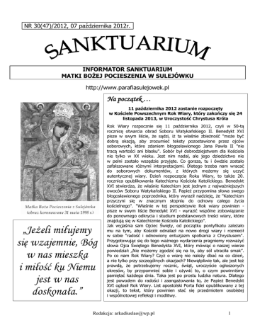 NR 30(47)/2012, 07 października 2012r. INFORMATOR SANKTUARIUM MATKI BOŻEJ POCIESZENIA W SULEJÓWKU http://www.parafiasulejowek.pl Na początek … 11 października 2012 zostanie rozpoczęty w Kościele Powszechnym Rok Wiary, który zakończy się 24 listopada 2013, w Uroczystość Chrystusa Króla „Jeżeli miłujemy się wzajemnie, Bóg w nas mieszka i miłość ku Niemu jest w nas doskonała.” Rok Wiary rozpocznie się 11 października 2012, czyli w 50-tą rocznicę otwarcia obrad Soboru Watykańskiego II. Benedykt XVI pisze w swym liście, że sądzi, iż ta właśnie zbieżność "może być dobrą okazją, aby zrozumieć teksty pozostawione przez ojców soborowych, które zdaniem błogosławionego Jana Pawła II "nie tracą wartości ani blasku". Sobór był dobrodziejstwem dla Kościoła nie tylko w XX wieku. Jest nim nadal, ale jego dziedzictwo nie w pełni zostało wszędzie przyjęte. Co gorsza, tu i ówdzie zostało zafałszowane różnymi interpretacjami. Dlatego trzeba nam wracać do soborowych dokumentów, z których możemy się uczyć autentycznej wiary. Dzień rozpoczęcia Roku Wiary, to także 20. rocznica opublikowania Katechizmu Kościoła Katolickiego. Benedykt XVI stwierdza, że właśnie Katechizm jest jednym z najważniejszych owoców Soboru Watykańskiego II. Papież przypomina słowa swego błogosławionego poprzednika, który wyraził nadzieję, że "Katechizm przyczyni się w znacznym stopniu do odnowy całego życia kościelnego". "Właśnie w tej perspektywie Rok wiary powinien pisze w swym liście Benedykt XVI - wyrazić wspólne zobowiązanie do ponownego odkrycia i studium podstawowych treści wiary, które znajdują się w Katechizmie Kościoła Katolickiego”. Jak wyjaśnia sam Ojciec Święty, od początku pontyfikatu zależało mu na tym, aby Kościół odnalazł na nowo drogi wiary i rozniecił w sobie "radość i odnowiony entuzjazm spotkania z Chrystusem". Przygotowując się do tego ważnego wydarzenia pragniemy rozważyć słowa Ojca Świętego Benedykta XVI, który mówiąc o naszej wierze powiedział: „Nie możemy zgodzić się na to, aby sól utraciła smak”. Po co nam Rok Wiary? Czyż o wiarę nie należy dbać na co dzień, a nie tylko przy szczególnych okazjach? Niewątpliwie tak, ale jest też prawdą, że potrzebujemy rocznic, świąt, uroczyście ogłoszonych okresów, by przypomnieć sobie i ożywić to, o czym powinniśmy pamiętać każdego dnia. Taka jest po prostu ludzka natura. Dlatego jest powodem do radości i zaangażowania to, że Papież Benedykt XVI ogłosił Rok Wiary. List apostolski Porta fidei opublikowany z tej okazji, to tekst, który powinien stać się przedmiotem osobistej i wspólnotowej refleksji i modlitwy. Redakcja: [email protected] 1 EWANGELIA 27 NIEDZIELA ZWYKŁA Mk 10, 2-16 Faryzeusze przystąpili do Jezusa i chcąc Go wystawić na próbę, pytali Go, czy wolno mężowi oddalić żonę. Odpowiadając zapytał ich: "Co wam nakazał Mojżesz?" Oni rzekli: "Mojżesz pozwolił napisać list rozwodowy i oddalić". Wówczas Jezus rzekł do nich: "Przez wzgląd na zatwardziałość serc waszych napisał wam to przykazanie. Lecz na początku stworzenia Bóg stworzył ich jako mężczyznę i kobietę: dlatego opuści człowiek ojca swego i matkę i złączy się ze swoją żoną, i będą oboje jednym ciałem. A tak już nie są dwoje, lecz jedno ciało. Co więc Bóg złączył, tego człowiek niech nie rozdziela!" W domu uczniowie raz jeszcze pytali Go o to. Powiedział im: "Kto oddala żonę swoją, a bierze inną, popełnia cudzołóstwo względem niej. I jeśli żona opuści swego męża, a wyjdzie za innego, popełnia cudzołóstwo". Przynosili Mu również dzieci, żeby ich dotknął; lecz uczniowie szorstko zabraniali im tego. A Jezus, widząc to, oburzył się i rzekł do nich: "Pozwólcie dzieciom przychodzić do Mnie, nie przeszkadzajcie im; do takich bowiem należy królestwo Boże. Zaprawdę, powiadam wam: Kto nie przyjmie królestwa Bożego jak dziecko, ten nie wejdzie do niego". I biorąc je w objęcia, kładł na nie ręce i błogosławił je. OGŁOSZENIA PARAFIALNE 1. Dziś 27 Niedziela Zwykła. Wspominamy Matkę Bożą Różańcową. Msze św. o godz. 7:00, 9:00, 9:00 w dolnym kościele, 10:30, 10:30 w dolnym kościele, 12:00 i 18:00, zaś o godz. 17:20 Różaniec w kaplicy Matki Bożej. Po Mszy św. o godz. 12:00 adoracja i procesja eucharystyczna. Również dziś, o godz. 19:00 w kaplicy Matki Bożej, odbędzie się spotkanie rodziców kandydatów do bierzmowania, którzy przez cały ubiegły rok przygotowywali się do tego sakramentu. 2. Do nabycia prasa katolicka, tygodniki: Idziemy, Niedziela, Gość Niedzielny. 3. Nabożeństwa różańcowe w naszej parafii codziennie o godz. 17:30, w niedzielę o godz. 17:20. W poniedziałki i czwartki Różaniec z udziałem dzieci. 4. We wtorek 9 października wspomnienie bł. Wincentego Kadłubka, biskupa. 5. W środę 10 października o godz. 18:00 modlitwy do Matki Bożej Pocieszenia, a po nich Msza św. zbiorowa. 6. W czwartek 11 października rozpoczynamy w Kościele Katolickim „Rok Wiary”, o godz. 15:00 Koronka do Bożego Miłosierdzia i adoracja Najświętszego Sakramentu do godz. 17:00, po czym nastąpi Msza św. i Różaniec o godz. 17:30. 7. W sobotę 13 października wspomnienie bł. Honorata Koźmińskiego, prezbitera. W tym dniu po Mszy św. o godz. 18:00 Różaniec fatimski i procesja ze świecami. Msze św. w tym dniu o godz. 7:00, 17:30 i 18:00. 8. W niedzielę 14 października odbędzie się spotkanie dla rodziców i dzieci z klas II, przygotowujących się do I Komunii św. Zapraszamy na godz. 17:30 do kaplicy Matki Bożej. Najpierw będzie konferencja dla rodziców, potem Msza św. o godz. 16:00, a po niej poświęcenie różańców. 9. W niedzielę 14 października, o godz. 19:00 w górnym kościele, odbędzie się spotkanie dla kandydatów, którzy 21 listopada przyjmą sakrament bierzmowania. Natomiast w niedzielę 28 paźd