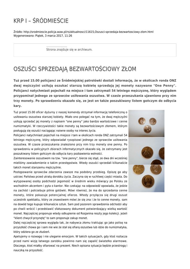 KRP I – ŚRÓDMIEŚCIE Źródło: http://srodmiescie.policja.waw.pl/rs/aktualnosci/11615,Oszusci-sprzedaja-bezwartosciowy-zlom.html Wygenerowano: Piątek, 3 marca 2017, 11:26 Strona znajduje się w archiwum. OSZUŚCI SPRZEDAJĄ BEZWARTOŚCIOWY ZŁOM Tuż przed 15.00 policjanci ze Śródmiejskiej patrolówki dostali informację, że w okolicach ronda ONZ dwaj mężczyźni usiłują oszukać starszą kobietę sprzedają jej monety nazywane "One Penny". Policjanci natychmiast pojechali na miejsce i tam zatrzymali 54 letniego mężczyznę, który wyglądem przypominał jednego ze sprawców usiłowania oszustwa. W czasie przeszukania ujawniono przy nim trzy monety. Po sprawdzeniu okazało się, ze jest on także poszukiwany listem gończym do odbycia kary. Tuż przed 15.00 oficer dyżurny z naszej komendy otrzymał informację telefoniczną o usiłowaniu oszustwa starszej kobiety. Miało ono polegać na tym, że dwaj mężczyźni usiłują sprzedać jej monety z napisem "one penny" jako bardzo wartościowe i cenne numizmatyki. W rzeczywistości takie monety są bezwartościowym złomem, którym posługują się oszuści naciągając naiwne osoby na interes życia. Policjanci natychmiast pojechali na miejsce i tam w okolicach ronda ONZ zatrzymali 54 letniego mężczyznę, który odpowiadał rysopisowi jednego ze sprawców usiłowania oszustwa. W czasie przeszukania znaleziono przy nim trzy monety one penny. Po sprawdzeniu w policyjnych zbiorach informatycznych okazało się, że zatrzymany jest poszukiwany listem gończym do odbycia kary pozbawienia wolności. Zainteresowanie oszustwem na tzw. "one penny", bierze się stąd, ze dwa dni wcześniej mieliśmy zawiadomienie o takim przestępstwie. Wtedy oszuści sprzedali kilkanaście takich monet starszemu mężczyźnie. Postępowanie sprawców zdarzenia zawsze ma podobny przebieg. Opiszę go aby ustrzec Państwa przed utratą dorobku życia. Zaczyna się w ruchliwej części miasta. Do wytypowanej osoby podchodzi jegomość w średnim wieku mówiący po Polsku ze wschodnim akcentem i pyta o kantor. Nie czekając na odpowiedź opowiada, że jedzie na zachód i potrzebuje pilnie gotówki. Mówi również, że ma do sprzedania cenne monety, które pokazuje potencjalnej ofierze. Wtedy przyłącza się drugi oszust uczestnik spektaklu, który ze znawstwem mówi że się zna i że to cenne monety. sam na dowód tego kupuje kilkanaście sztuk. Sam pod pozorem sprawdzenia odchodzi aby po chwili wrócić i przedstawić sfałszowany dokument potwierdzający wielką wartość monet. Najczęściej proponuje wtedy odkupienie od Rosjanina reszty jego kolekcji. jeżeli "klient chwycił przynętę" to sam proponuje zakup monet. Dalej najczęściej sprawa wygląda tak, że nabywca złomu traktując go jako polisę na przyszłość chowa go i sam nie wie że stał się ofiarą oszustwa lub idzie do numizmatyka, który odziera go ze złudzeń. Apelujemy o rozwagę i nie uleganie emocjom. W takich sytuacjach, gdy ktoś roztacza przed nami wizję łatwego zarobku powinno nam się zapalić światełko alarmowe. Dlaczego, ktoś miałby ofiarować na prezent. Niech opisana sytuacja będzie przestrogą i nauczką na przyszłość. Ocena: 0/5 (0) Tweetnij