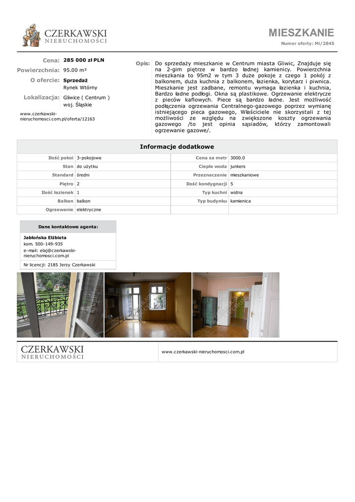MIESZKANIE Numer oferty: Mi/2845 Cena: 285 000 zł PLN Powierzchnia: 95.00 m² O ofercie: Sprzedaż Rynek Wtórny Lokalizacja: Gliwice ( Centrum ) woj. Śląskie www.czerkawskinieruchomosci.com.pl/oferta/12163 Opis: Do sprzedaży mieszkanie w Centrum miasta Gliwic, Znajduje się na 2-gim piętrze w bardzo ładnej kamienicy. Powierzchnia mieszkania to 95m2 w tym 3 duże pokoje z czego 1 pokój z balkonem, duża kuchnia z balkonem, łazienka, korytarz i piwnica. Mieszkanie jest zadbane, remontu wymaga łazienka i kuchnia, Bardzo ładne podłogi. Okna są plastikowe. Ogrzewanie elektrycze z pieców kaflowych. Piece są bardzo ładne. Jest możliwość podłączenia ogrzewania Centralnego-gazowego poprzez wymianę istniejącego pieca gazowego, Właściciele nie skorzystali z tej możliwości ze względu na zwiększone koszty ogrzewania gazowego /to jest opinia sąsiadów, którzy zamontowali ogrzewanie gazowe/. Informacje dodatkowe Ilość pokoi 3-pokojowe Stan do użytku Standard średni Piętro 2 Ilość łazienek 1 Balkon balkon Cena za metr 3000.0 Ciepła woda junkers Przeznaczenie mieszkaniowe Ilość kondygnacji 5 Typ kuchni widna Typ budynku kamienica Ogrzewanie elektryczne Dane kontaktowe agenta: Jabłońska Elżbieta kom. 500-149-935 e-mail: [email protected] Nr licencji: 2185 Jerzy Czerkawski www.czerkawski-nieruchomosci.com.pl