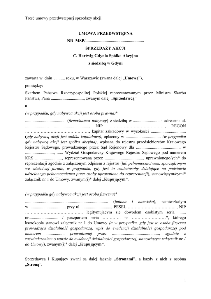 Treść umowy przedwstępnej sprzedaży akcji: UMOWA PRZEDWSTĘPNA NR MSP/....................................................... SPRZEDAŻY AKCJI C. Hartwig Gdynia Spółka Akcyjna z siedzibą w Gdyni zawarta w dniu .......... roku, w Warszawie (zwana dalej „Umową”), pomiędzy: Skarbem Państwa Rzeczypospolitej Polskiej reprezentowanym przez Ministra Skarbu Państwa, Pana ..............................., zwanym dalej „Sprzedawcą” a (w przypadku, gdy nabywcą akcji jest osoba prawna)* ...................................... (firma/nazwa nabywcy) z siedzibą w ......................... i adresem: ul. ....................., ................................., NIP …………………………………., REGON ………………………………………, kapitał zakładowy w wysokości ................................. (gdy nabywcą akcji jest spółka kapitałowa), opłacony w ................................. (w przypadku gdy nabywcą akcji jest spółka akcyjna), wpisaną do rejestru przedsiębiorców Krajowego Rejestru Sądowego, prowadzonego przez Sąd Rejonowy dla .......................................... w ..........................., ...... Wydział Gospodarczy Krajowego Rejestru Sądowego pod numerem KRS ........................., reprezentowaną przez ...................................., uprawnionego/ych* do reprezentacji zgodnie z załączonym odpisem z rejestru (lub pełnomocnictwem, sporządzonym we właściwej formie, w przypadku, gdy jest to osoba/osoby działające na podstawie udzielonego pełnomocnictwa przez osoby uprawnione do reprezentacji), stanowiącym/cymi* załącznik nr 1 do Umowy, zwanym(i)* dalej „Kupującym”. (w przypadku gdy nabywcą akcji jest osoba fizyczna)* .............................................................................. (imiona i nazwisko), zamieszkałym w .................................. przy ul.............................., PESEL …………………………….., NIP …………………………………., legitymującym się dowodem osobistym seria ....... nr............................ / paszportem seria …………. nr ……………………*, którego kserokopia stanowi załącznik nr 1 do Umowy (a w przypadku, gdy jest to osoba fizyczna prowadząca działalność gospodarczą, wpis do ewidencji działalności gospodarczej pod numerem ................. prowadzonej przez ............................................, zgodnie z zaświadczeniem o wpisie do ewidencji działalności gospodarczej, stanowiącym załącznik nr 1 do Umowy), zwanym(i)* dalej „Kupującym”. Sprzedawca i Kupujący zwani są dalej łącznie „Stronami”, a każdy z nich z osobna „Stroną”. 1 Z uwagi na to, że: 1) Sprzedawca jest właścicielem 30.301 (słownie: trzydzieści tysięcy trzysta jeden) akcji imiennych uprzywilejowanych – serii: „A” o numerach: od 000225253 do 000225287, od 000227188 do 000227237, od 000233463 do 000233527, od 000234568 do 000234632, od 000247039 do 000247124, od 000270001 do 000300000, o wartości nominalnej 10,00 (słownie: dziesięć) złotych każda, stanowiących w zaokrągleniu 10,1 % kapitału zakładowego spółki pod firmą C. Hartwig Gdynia Spółka Akcyjna z siedzibą w Gdyni, wpisanej do rejestru przedsiębiorców prowadzonego przez Sąd Rejonowy w GdańskPółnoc w Gdańsku, VIII Wydział Gospodarczy Krajowego Rejestru Sądowego pod numerem KRS 0000024354, zwanej dalej „Spółką”. Odpis z rejestru przedsiębiorców Spółki stanowi załącznik nr 2 do Umowy; 2) Sprzedawca oświadcza, że, zgodnie z jego najlepszą wiedzą, sprzedawane przez niego Akcje, o których mowa w pkt. 3, są wolne od jakichkolwiek ograniczeń w zbywaniu lub innych obciążeń oraz nie są przedmiotem roszczeń jakichkolwiek osób trzecich; 3) W dniu … marca 2012 roku w dzienniku Gazeta Wyborcza, na podstawie art. 70 ¹ i nast. ustawy z dnia 23 kwietnia 1964 r. Kodeks cywilny (Dz. U. Nr 16, poz. 93, z późn. zm.) zgodnie z art. 33 ust. 5 pkt. 2 ustawy z dnia 30 sierpnia 1996 roku o komercjalizacji i prywatyzacji (Dz. U. z 2002 r. Nr 171, poz. 1397, z późn. zm.) zostało ogłoszone zaproszenie do wzięcia udziału w aukcji dotyczącej zbycia 30.301 (słownie: trzydzieści tysięcy trzysta jeden) należących do Skarbu Państwa akcji, stanowiących w zaokrągleniu 10,1 % kapitału zakładowego Spółki, zwanych dalej „Akcjami”; 4) Do zawarcia Umowy dochodzi w następstwie przeprowadzonej w dniu ……………….. aukcji nr …, przedmiotem której było zbycie Akcji, o którym mowa w pkt. 3, w wyniku której, Kupujący zaoferował najwyższą cenę. Strony zgodnie postanawiają co następuje: §1 1. Na zasadach określonych w Umowie Strony zobowiązują się do zawarcia umowy sprzedaży Akcji, zwanej dalej „Umową Przyrzeczoną”, na mocy której Sprzedawca sprzeda, a Kupujący kupi Akcje. 2. Umowa Przyrzeczona zostanie zawarta, o ile przed jej zawarciem: 1) Zarząd Spółki wyrazi zgodę na zbycie Akcji, o której mowa w § 10 ust. 3 i nast. statutu Spółki w brzmieniu obowiązującym na dzień zawarcia Umowy albo upłynie termin, o którym mowa w § 10 ust. 6 statutu Spółki w brzmieniu obowiązującym na dzień zawarcia Umowy, oraz 2) Kupujący dokona wpłaty całkowitej ceny wszystkich Akcji, o której mowa w § 2 ust. 2, pomniejszonej o kwotę wpłaconego przez Kupującego wadium, o którym mowa w § 3 ust. 1, w terminie 7 (siedmiu) dni od dnia powiadomienia Kupującego przez Sprzedawcę o ziszczeniu się warunku, o którym mowa w pkt. 1. 2 3. W przypadku niezawarcia Umowy Przyrzeczonej w terminie do dnia 31 lipca 2012 roku, zobowiązanie Stron do zawarcia Umowy Przyrzeczonej wygasa. 4. Jeżeli w terminie, o którym mowa w ust. 3, do zawarcia Umowy Przyrzeczonej nie dojdzie z przyczyn leżących po stronie Kupującego, a w szczególności wskutek uchylania się Kupującego od zawarcia Umowy Przyrzeczonej, bądź z powodu niedokonania przez Kupującego wpłaty, o której mowa w ust. 2 p