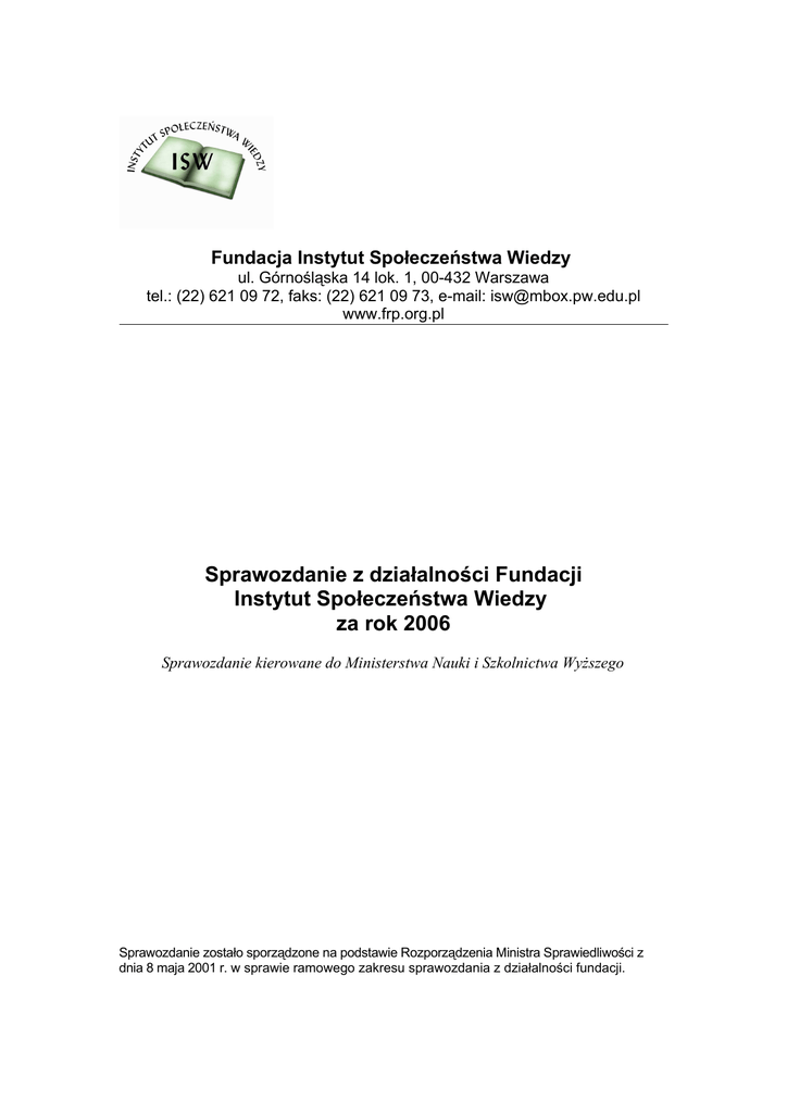 Fundacja Instytut Społeczeństwa Wiedzy ul. Górnośląska 14 lok. 1, 00-432 Warszawa tel.: (22) 621 09 72, faks: (22) 621 09 73, e-mail: [email protected] www.frp.org.pl Sprawozdanie z działalności Fundacji Instytut Społeczeństwa Wiedzy za rok 2006 Sprawozdanie kierowane do Ministerstwa Nauki i Szkolnictwa Wyższego Sprawozdanie zostało sporządzone na podstawie Rozporządzenia Ministra Sprawiedliwości z dnia 8 maja 2001 r. w sprawie ramowego zakresu sprawozdania z działalności fundacji. Punkt I. Fundacja Instytut Społeczeństwa Wiedzy Siedziba i adres: ul. Górnośląska 14 lok. 1, 00-432 Warszawa Data wpisu w Krajowym Rejestrze Sądowym – 1 sierpnia 2003 r. Numer KRS: 0000169429 REGON: 015551116 Zarządu Fundacji ISW: - Prezes -Dyrektor Instytutu - prof. Jerzy Woźnicki ul. Jodłowa 10 05-110 Jabłonna Celami statutowymi Fundacji ISW są: 1. Działania na rzecz kształtowania się społeczeństwa wiedzy oraz tworzenia podstaw dla rozwoju gospodarki opartej na wiedzy w Polsce, a także na rzecz integracji systemu szkolnictwa wyższego i badań naukowych a w tym konwergencji sektorów państwowego i niepaństwowego w szkolnictwie wyższym, oraz integracji pionów instytucjonalnych występujących w systemie badań naukowych. 2. Prowadzenie studiów i badań nad szkolnictwem wyższym i systemem badań naukowych oraz polityką edukacyjną, naukową i proinnowacyjną państwa, a także wspomaganie procesu kształtowania się i rozwoju społeczeństwa informacyjnego, a w szczególności: a) merytoryczne wspieranie procesu rozwoju i doskonalenia systemu edukacji narodowej w Polsce, a w tym zwłaszcza systemu szkolnictwa wyższego. b) działania na rzecz doskonalenia oraz wspomaganie rozwoju systemu badań naukowych, zwłaszcza w aspektach szczególnie istotnych dla przyśpieszania społecznego, gospodarczego i cywilizacyjnego rozwoju kraju. c) poszukiwanie źródeł finansowania oraz finansowanie lub współfinansowanie ekspertyz, badań, studiów i analiz prowadzonych w obszarze działania Fundacji. Punkt II. Fundacja realizuje swoje cele poprzez: a) prowadzenie działalności badawczej i publikowanie jej wyników, b) gromadzenie środków finansowych i materialnych, c) prowadzenie działalności szkoleniowej i eksperckiej, d) organizowanie konferencji i seminariów naukowych, spotkań dyskusyjnych, warsztatów badawczych i dydaktycznych, e) gromadzenie i wymianę informacji naukowych i edukacyjnych w postaci skomputeryzowanych baz danych, f) organizowanie imprez publicznych, kampanii, zbiórek lub konkursów, g) współpracę międzynarodową z instytucjami i organizacjami naukowymi i dydaktycznymi, uczelniami, instytutami badawczymi i innymi organizacjami działającymi w zakresie celów statutowych Fundacji, h) prowadzenie działalności gospodarczej służącej realizacji celów Fundacji, a w szczególności działalności konsultingowej, wydawniczej, reklamowej handlowej, usługowej i produkcyjnej w zakresie, o którym mowa w § 9. W sierpniu 2004 Fundacja Instytut Społeczeństwa Wiedzy uzyskała status organizacji pożytku publicznego. W 2006 roku Fundacja realizowała cele statutowe poprzez następujące działania: 1. Projekt „Kodeks Partnerstwa Nauki i Gospodarki” (przedsięwzięcie w trakcie realizacji, realizowane w ramach statutowej działalności gospodarczej) a) instytucje, z którymi ISW współdziałał: Krajowa Izba Gospodarcza, Państwowa Agencja Rozwoju Przedsiębiorczości. b) rola ISW: koordynowanie przez prof. Jerzego Woźnickiego, Dyrektora ISW, prac zespołu ekspertów, pełnienie przez Mariusza Luterka, asystenta w ISW, funkcji sekretarza zespołu, zapewnienie w siedzibie Instytutu warunków do prowadzenia prac przygotowawczych, organizacyjnych i konsultacyjnych, przygotowanie, wydanie i nieodpłatna dystrybucja raportu kończącego pierwszy etap projektu pt: „Regulacje prawne, dobre wzorce i praktyki dotyczące korzystania przez podmioty gospodarcze z wyników prac badawczych i innych osiągnięć intelektualnych instytucji akademickich i naukowych”, Projekt kontynuowany w 2007 r. 1. Zorganizowanie Seminarium „Korzystanie przez podmioty gospodarcze z wyników prac badawczych”, (przedsięwzięcie zakończone w dniu 6 lipca 2006 r. realizowane w ramach statutowej działalności gospodarczej) a) instytucje, z którymi ISW współdziałał: Fundacja Rektorów Polskich Krajowa Izba Gospodarcza, b) rola ISW: opracowanie koncepcji seminarium, przygotowanie materiałów konferencyjnych, przedstawienie referatu przez Dyrektora ISW zapewnienie obsługi biurowej i techniczno-organizacyjnej Seminarium przez Biuro Fundacji ISW 2. Przygotowanie ekspertyzy pn. „Określenie istoty pojęć: innowacji i innowacyjności, ze wskazaniem aktualnych uwarunkowań i odniesień do polityki proinnowacyjnej – podejście interdyscyplinarne” (przedsięwzięcie zakończone, realizowane w ramach statutowej działalności gospodarczej) a) instytucje, z którymi ISW współdziałał: Krajowa Izba Gospodarcza – Biuro KIGNET , b) rola ISW: koordynowanie przez prof. Jerzego Woźnickiego, Dyrektora ISW, prac zespołu ekspertów, zapewnienie w siedzibie Instytutu warunków do prowadzenia prac przygotowawczych i konsultacyjnych, opracowanie ekspertyzy pod redakcją Dyrektora ISW i przekazanie jej treści Zamawiającemu dla potrzeb projektu „KIGNET – izbowy system wsparcia konkurencyjności polskich przedsiębiorstw”. 3. Seminarium dla doktorantów zajmujących się zagadnieniami szkolnictwa wyższego, badań naukowych i społeczeństwa wiedzy pn. Rola szkolnictwa wyższego w kształtowaniu społeczeństwa wiedzy (przedsięwzięcie w fazie realizacji, realizowane w ramach nieodpłatnej działalności pożytku publicznego) a) instytucje, z którymi ISW współdziała: Fundacja Rektorów Polskich uczelnie delegujące uczestników seminarium, b) rola ISW: opracowanie koncepcji seminarium, organizacja i finansowanie seminariów, zapewnianie w siedzibie ISW warunków dla 