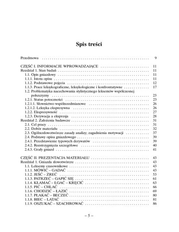 Spis treÊci Przedmowa . . . . . . . . . . . . . . . . . . . . . . . . . . . . . . . . . . . . . . . . . . . . . . . . . . . . . . . 9 CZ¢Âå I. INFORMACJE WPROWADZAJÑCE . . . . . . . . . . . . . . . . . . . . . . . . . Rozdzia∏ 1. Stan badaƒ . . . . . . . . . . . . . . . . . . . . . . . . . . . . . . . . . . . . . . . . . . . . . . . 1.1. Opis gniazdowy . . . . . . . . . . . . . . . . . . . . . . . . . . . . . . . . . . . . . . . . . . . . . . . 1.1.1. Istota opisu . . . . . . . . . . . . . . . . . . . . . . . . . . . . . . . . . . . . . . . . . . . . . . . . . 1.1.2. Podstawowe poj´cia . . . . . . . . . . . . . . . . . . . . . . . . . . . . . . . . . . . . . . . . . . 1.1.3. Prace leksykograficzne, leksykologiczne i konfrontatywne . . . . . . . . . . . . . 1.2. Problematyka nacechowania stylistycznego leksemów wspó∏czesnej polszczyzny . . . . . . . . . . . . . . . . . . . . . . . . . . . . . . . . . . . . . . . . . . . . . . . . . . 1.2.1. Status potocznoÊci . . . . . . . . . . . . . . . . . . . . . . . . . . . . . . . . . . . . . . . . . . . 1.2.1.1. S∏ownictwo wspólnoodmianowe . . . . . . . . . . . . . . . . . . . . . . . . . . . . . . . 1.2.1.2. Leksyka ekspresywna . . . . . . . . . . . . . . . . . . . . . . . . . . . . . . . . . . . . . . . 1.2.2. EkspresywnoÊç . . . . . . . . . . . . . . . . . . . . . . . . . . . . . . . . . . . . . . . . . . . . . . 1.2.3. Derywacja a ekspresja . . . . . . . . . . . . . . . . . . . . . . . . . . . . . . . . . . . . . . . . Rozdzia∏ 2. Za∏o˝enia badawcze . . . . . . . . . . . . . . . . . . . . . . . . . . . . . . . . . . . . . . . . 2.1. Cel pracy . . . . . . . . . . . . . . . . . . . . . . . . . . . . . . . . . . . . . . . . . . . . . . . . . . . . 2.2. Dobór materia∏u . . . . . . . . . . . . . . . . . . . . . . . . . . . . . . . . . . . . . . . . . . . . . . 2.3. Ogólnos∏owotwórcze zasady analizy; zagadnienia motywacji . . . . . . . . . . . . 2.4. Podstawy opisu gniazdowego . . . . . . . . . . . . . . . . . . . . . . . . . . . . . . . . . . . . . 2.4.1. Przedstawienie typowych derywatów . . . . . . . . . . . . . . . . . . . . . . . . . . . . . 2.4.2. Rozstrzygni´cia szczegó∏owe . . . . . . . . . . . . . . . . . . . . . . . . . . . . . . . . . . . 2.4.3. Grafy gniazd . . . . . . . . . . . . . . . . . . . . . . . . . . . . . . . . . . . . . . . . . . . . . . . . 11 11 11 11 12 17 23 23 26 26 27 28 31 31 32 37 39 39 40 41 CZ¢Âå II. PREZENTACJA MATERIA¸U . . . . . . . . . . . . . . . . . . . . . . . . . . . . . . Rozdzia∏ 1. Gniazda s∏owotwórcze . . . . . . . . . . . . . . . . . . . . . . . . . . . . . . . . . . . . . . 1.1. Leksemy czasownikowe . . . . . . . . . . . . . . . . . . . . . . . . . . . . . . . . . . . . . . . . . 1.1.1. MÓWIå – GADAå . . . . . . . . . . . . . . . . . . . . . . . . . . . . . . . . . . . . . . . . . . 1.1.2. JEÂå – ˚REå . . . . . . . . . . . . . . . . . . . . . . . . . . . . . . . . . . . . . . . . . . . . . . 1.1.3. PATRZEå – GAPIå SI¢ . . . . . . . . . . . . . . . . . . . . . . . . . . . . . . . . . . . . . . 1.1.4. K¸AMAå – ¸GAå – KR¢CIå . . . . . . . . . . . . . . . . . . . . . . . . . . . . . . . . . 1.1.5. PIå – CHLAå . . . . . . . . . . . . . . . . . . . . . . . . . . . . . . . . . . . . . . . . . . . . . . 1.1.6. CHODZIå – ¸AZIå . . . . . . . . . . . . . . . . . . . . . . . . . . . . . . . . . . . . . . . . . 1.1.7. P¸AKAå – BECZEå . . . . . . . . . . . . . . . . . . . . . . . . . . . . . . . . . . . . . . . . . 1.1.8. BIEC – LATAå . . . . . . . . . . . . . . . . . . . . . . . . . . . . . . . . . . . . . . . . . . . . . 1.1.9. OSZUKAå – SZACHROWAå . . . . . . . . . . . . . . . . . . . . . . . . . . . . . . . . . 43 43 43 43 53 61 63 66 69 80 81 86 –5– 1.2. Leksemy rzeczownikowe . . . . . . . . . . . . . . . . . . . . . . . . . . . . . . . . . . . . . . . . 1.2.1. G¸OWA – ¸EB . . . . . . . . . . . . . . . . . . . . . . . . . . . . . . . . . . . . . . . . . . . . . 1.2.2. KOBIETA – BABA . . . . . . . . . . . . . . . . . . . . . . . . . . . . . . . . . . . . . . . . . . 1.2.3. R¢KA – ¸APA . . . . . . . . . . . . . . . . . . . . . . . . . . . . . . . . . . . . . . . . . . . . . . 1.2.4. DOM- CHA¸UPA . . . . . . . . . . . . . . . . . . . . . . . . . . . . . . . . . . . . . . . . . . . 1.2.5. KOLEGA – KUMPEL . . . . . . . . . . . . . . . . . . . . . . . . . . . . . . . . . . . . . . . . 1.2.6. TWARZ – MORDA . . . . . . . . . . . . . . . . . . . . . . . . . . . . . . . . . . . . . . . . . . 1.2.7. USTA – PYSK . . . . . . . . . . . . . . . . . . . . . . . . . . . . . . . . . . . . . . . . . . . . . . 1.2.8. ZWIERZ¢ – BYDL¢ . . . . . . . . . . . . . . . . . . . . . . . . . . . . . . . . . . . . . . . . 1.2.9. GA¸GAN – SZMATA . . . . . . . . . . . . . . . . . . . . . . . . . . . . . . . . . . . . . . . . Rozdzia∏ 2. Analiza gniazd s∏owotwórczych . . . . . . . . . . . . . . . . . . . . . . . . . . . . . . . 2.1. Charakterystyka iloÊciowa . . . . . . . . . . . . . . . . . . . . . . . . . . . . . . . . . . . . . . 2.2. Opis gniazd odczasownikowych . . . . . . . . . . . . . . . . . . . . . . . . . . . . . . . . . . 2.2.1. MÓWIå – GADAå . . . . . . . . . . . . . . . . . . . . . . . . . . . . . . . . . . . . . . . . . 2.2.2. CHODZIå – ¸AZIå . . . . . . . . . . . . . . . . . . . . . . . . . . . . . . . . . . . . . . . . 2.2.3. BIEC – LATAå . . . . . . . . . . . . . . . . . . . . . . . . . . . . . . . . . . . . . . . . . . . . . 2.2.4. JEÂå – ˚REå . . . . . . . . . . . . . . . . . . . . . . . . . . . . . . . . . . . . . . . . . . . . . . 2.2.5. PIå – CHLAå . . . . . . . . . . . . . . . . . . . . . . . . . . . . . . . . . . . . . . . . . . . . . . 2.2.6. PATRZEå – GAPIå SI¢ . . . . . . . . . . . . . . . . . . . . . . . . . . . . . . . . . . . . . 2.2.7. P¸AKAå – BECZEå . . . . . . . . . . . . . . . . . . . . . . . . . . . . . . . . . . . . . . . . . 2.2.8. K¸AMAå – ¸GAå 