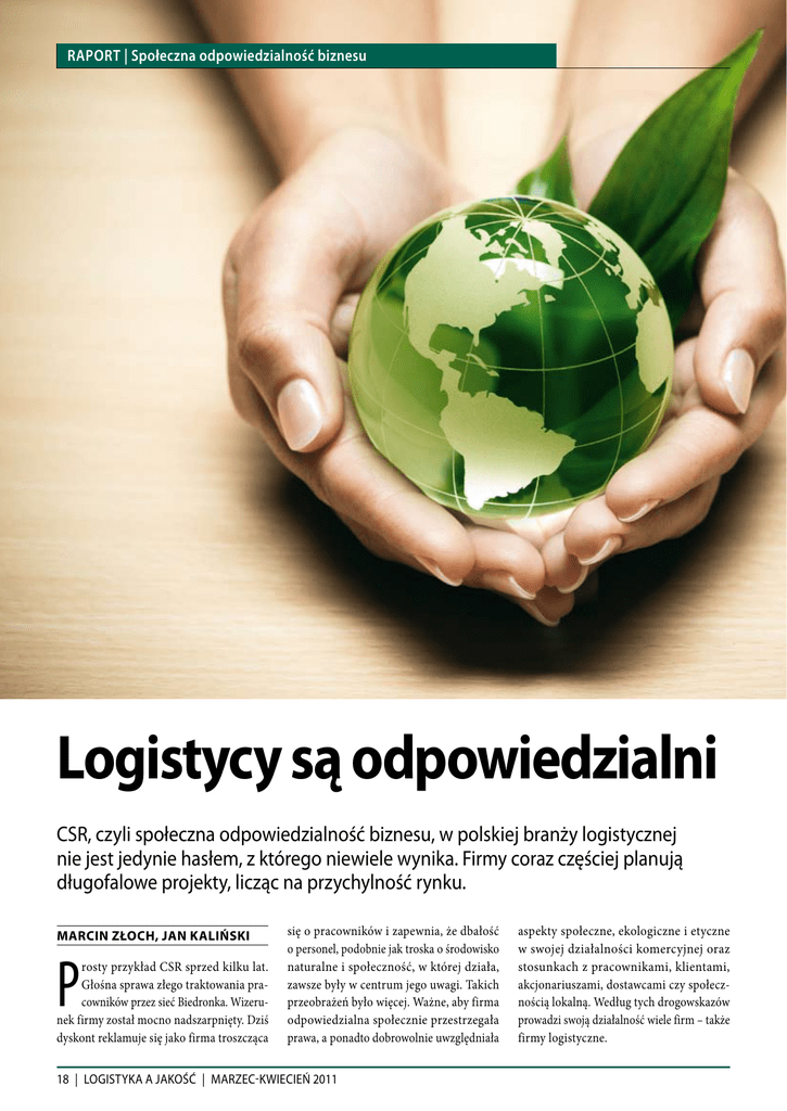 RAPORT | Społeczna odpowiedzialność biznesu Logistycy są odpowiedzialni CSR, czyli społeczna odpowiedzialność biznesu, w polskiej branży logistycznej nie jest jedynie hasłem, z którego niewiele wynika. Firmy coraz częściej planują długofalowe projekty, licząc na przychylność rynku. Marcin Złoch, Jan Kaliński P rosty przykład CSR sprzed kilku lat. Głośna sprawa złego traktowania pracowników przez sieć Biedronka. Wizerunek firmy został mocno nadszarpnięty. Dziś dyskont reklamuje się jako firma troszcząca się o pracowników i zapewnia, że dbałość o personel, podobnie jak troska o środowisko naturalne i społeczność, w której działa, zawsze były w centrum jego uwagi. Takich przeobrażeń było więcej. Ważne, aby firma odpowiedzialna społecznie przestrzegała prawa, a ponadto dobrowolnie uwzględniała 18 | LOGISTYKA A JAKOŚĆ | marzec-kwiecień 2011 aspekty społeczne, ekologiczne i etyczne w swojej działalności komercyjnej oraz stosunkach z pracownikami, klientami, akcjonariuszami, dostawcami czy społecznością lokalną. Według tych drogowskazów prowadzi swoją działalność wiele firm – także firmy logistyczne. Społeczna odpowiedzialność biznesu | RAPORT zachowaniu efektywności finansowej. Trzeci dotyczy naszego zaangażowania w społeczne akcje edukacyjne na rzecz poprawy bezpieczeństwa na drogach i przeciwdziałania zmianom klimatycznym – wylicza Anna Mazurek z DHL Express (Poland). Budowa marki – Kierujemy się strategią społecznej odpowiedzialności biznesu. Dzięki temu pozostajemy w zgodzie ze środowiskiem i naszym otoczeniem, przy jednoczesnym wzroście konkurencyjności. Deutsche Post DHL, którego jesteśmy częścią, wyznaczył globalne zasady strategii CSR dla całej grupy, obowiązują one w każdym z ponad 220 krajów na całym świecie, gdzie jesteśmy obecni. Na tej podstawie opracowaliśmy zasady strategii lokalnej, opierającej się na trzech głównych obszarach. Pierwszy odnosi się do naszych pracowników. Inwestujemy w ich rozwój, tak aby byli dobrze przygotowani do codziennych wyzwań biznesowych. Drugi obszar lokalnej strategii CSR jest związany z doskonaleniem naszych usług i działań w celu ograniczenia ich wpływu na środowisko naturalne, przy jednoczesnym Według definicji firma zasługuje na miano „społecznie odpowiedzialnej”, jeśli realizuje politykę zrównoważonego rozwoju gospodarczego, a jej celem jest osiągnięcie równowagi pomiędzy efektywnością i dochodowością a interesem społecznym. Na szczęście w Polsce CSR zaczyna być traktowany jako całościowa strategia działalności, a nie jako doraźne działanie PR-owe i marketingowe. Potwierdza to badanie „Menedżerowie 500/Lider CSR – Spowiedź Praktyków”. Jest to kontynuacja badania „Menedżerowie 500 i odpowiedzialny biznes: wiedza – podstawy – praktyka”, przeprowadzonego przez Forum Odpowiedzialnego Biznesu wspólnie z Akademią Filantropii oraz Bankiem Światowym w 2003 r. Dzięki temu, że część pytań w obydwu badaniach była tożsama, w nowszym raporcie znaleźć można m.in. analizę porównawczą najważniejszych zmian, jakie zaszły w obszarze świadomości na temat CSR w ciągu siedmiu lat. Potrzeba budowania marki oraz wizerunku firmy wciąż pozostaje głównym motywem angażowania się firm w CSR – takie odpowiedzi wskazało 76% badanych, podczas gdy w 2003 r. liczba ta wynosiła 72%. Pocieszający jest fakt, że równie ważnym motywatorem jest obecnie potrzeba budowania lepszych relacji ze społecznością lokalną – wzrost motywacji w tym obszarze wyniósł ponad jedną trzecią, tj. z 42% w 2003 r. do 74% w roku 2010. W porównaniu ze stanem sprzed siedmiu lat wzmocniło się także przekonanie, że długofalowa opłacalność CSR jest jednym z głównych motywów angażowania się firm w działania na rzecz biznesu odpowiedzialnego społecznie – tak twierdzi obecnie 56% w porównaniu z 30% w 2003 r. Niestety, pomimo starań menedżerów, jak wynika z badań rynkowych, odpowiedzialny biznes to termin ciągle enigmatyczny dla klientów. Jak wynika z badania przeprowadzonego w październiku 2010 r. przez MillwardBrown SMG/KRC, tylko 3% Polaków spotkało się z pojęciem CSR, z czego 40% nie potrafi wy- Dobre praktyki w branży transportowo-logistycznej Rozwój zasobów ludzkich – PKP CARGO Celem projektów edukacyjnych PKP CARGO jest rozwój zasobów ludzkich, aby stale dopasowywać kompetencje pracowników do aktualnych potrzeb. W czasie restrukturyzacji firmy, rozwój i szkolenia liderów zmian są szczególnie istotne, ponieważ wiedza kadry zarządzającej jest niezbędna do wprowadzania przekształceń w sposób optymalizujący koszty i czas. Liczba pracowników objętych programem polepszania poziomu wykształcenia w 2007 i 2008 r. wynosi: poprzez uczestnictwo w studiach wyższych – 775; podyplomowych, w tym studiach dofinansowanych z EFS oraz MBA – 347; kompleksowe projekty szkoleniowe dla kadry zarządzającej; studia MBA, 2007 r. – 19 osób i studia podyplomowe dofinansowywane z EFS w roku akademickim 2006/2007 – 146 osób; laboratorium menedżerskie – 39; podyplomowe Studia Menedżerskie „Europejski Model Zarządzania” – 32; podyplomowe Studia Zarządzania Projektami według metodyki Prince 2 – 21; staże zawodowe w Przedstawicielstwie PKP SA w Brukseli – 8; szkolenia językowe w czasie pracy – 190. Projekt przyczynił się do wzrostu motywacji i zaangażowania pracowników. Jego założeniem było zmniejszenie fluktuacji kluczowych pracowników, co ma szczególne znaczenie w okresie reorganizacji. Prawie wszyscy pracownicy uczestniczący w podnoszeniu kwalifikacji na studiach magisterskich i podyplomowych nadal pracują w spółce. W okresie reorganizacji nie było fluktuacji kadr na znaczących stanowiskach. Poszerzenie zasobu wiedzy pozwoliło kadrze zarządzającej na lepsze zrozumienie procesów zmian i zmniejszenie kosztów ich wprowadzania
