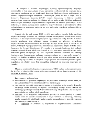 W związku z aktualną niepokojącą sytuacją epidemiologiczną dotyczącą poliomyelitis w Azji oraz Afryce, pragnę uprzejmie poinformować, że opierając się na zaleceniach zwołanego na tę okoliczność Komitetu Nadzwyczajnego, działającego w ramach Międzynarodowych Przepisów Zdrowotnych (IHR), w dniu 5 maja 2014 r. Światowa Organizacja Zdrowia (WHO) wydała komunikat, w którym określiła transgraniczne rozprzestrzenianie się dzikiego wirusa polio w roku 2014 jak wydarzenie nadzwyczajne stanowiące międzynarodowe zagrożenie dla zdrowia publicznego. WHO podkreśla, że obecna sytuacja może skutkować niepowodzeniem w prowadzonym od lat ogólnoświatowym programie mającym na celu całkowitą eradykację poliomyelitis na całym świecie. Szacuje się, że pod koniec 2013 r., 60% przypadków choroby było wynikiem międzynarodowego szerzenia się dzikiego szczepu wirusa polio i istnieje coraz więcej dowodów, że do rozprzestrzenienia przyczynili się podróżujące osoby dorosłe. W trakcie obecnie trwającego tzw. niskiego sezonu szerzenia się choroby, stwierdzono międzynarodowe rozprzestrzenianie się dzikiego szczepu wirusa polio z trzech na 10 państw, w których występuje choroba: Z Pakistanu do Afganistanu, z Syrii do Iraku oraz z Kamerunu do Gwinei Równikowej. W związku z tą sytuacją konieczne jest podjęcie skoordynowanych działań międzynarodowych w celu przerwania transmisji wirusa polio, zwłaszcza przed zbliżającym się tzw. wysokim sezonem szerzenia się choroby (maj/czerwiec). Konsekwencje dalszego rozprzestrzeniania się wirusa polio mogą być szczególnie dotkliwe w obliczu sytuacji, gdy wiele państw wolnych od choroby, ale w których toczą się konflikty, w związku z czym poziom zaszczepienia przeciwko polio niepokojąco się obniżył może być szczególnie podatnych na ponowne pojawienie się choroby. Mając na uwadze aktualną niepokojącą sytuację, WHO wydało następujące zalecenia dla krajów, z których dziki wirus polio rozprzestrzenia się do innych państw, tj. dla Pakistanu, Kamerunu i Syrii. Powyższe trzy kraje powinny: ■ zadeklarować na poziomie rządowym, że przerwanie transmisji wirusa polio jest najwyższym krajowym priorytetem zdrowia publicznego; ■ zapewnić, że wszystkie osoby przebywające na terytorium kraju powyżej 4 tygodni otrzymają dawkę doustnej szczepionki zawierającej żywego wirusa (OPV) lub zawierającej zabitego wirusa (IPV) w okresie między 4 tygodniami a 12 miesiącami poprzedzającymi podróż międzynarodową; ■ zapewnić, że w przypadku podejmowania podróży w okresie poniżej 4 tygodni, osoby które nie zostały zaszczepione w ciągu ostatnich 12 miesięcy, otrzymają dawkę szczepionki najpóźniej w dniu wyjazdu, co nadal stanowi korzyść zwłaszcza dla osób często podróżujących; ■ zapewnić, że podróżni są zaopatrzeni w Międzynarodową Książeczkę Szczepień (ang. International Certificate of Vaccination), w której zostało poświadczone szczepienie przeciwko polio, stanowiące dowód szczepienia; ■ utrzymać powyższe środki aż do czasu spełnienia następujących kryteriów: (i) upłynęło co najmniej 6 miesięcy od ostatniej transmisji wirusa poza granice kraju oraz (ii) istnieje dokumentacja potwierdzająca pełne wdrożenie działań w zakresie eradykacji polio we wszystkich obszarach zakażonych oraz wysokiego ryzyka; w przypadku braku stosownej dokumentacji, środki o których mowa powyżej powinny zostać utrzymane co najmniej przez okres 12 miesięcy od daty ostatniego przypadku transmisji wirusa poza granice kraju. W przypadku spełnienia kryteriów, o których mowa wyżej, państwa powinny zostać ocenione jako te, które nie rozprzestrzeniają wirusa polio poza granice swojego terytorium oraz powinny zostać zaliczone do kategorii tzw. krajów zakażonych. Zgodnie z aktualnie posiadanymi informacjami, władze Pakistanu zamierzają począwszy od 1 czerwca 2014 r. wymagać od wszystkich osób wyjeżdżających z kraju zaszczepienia przeciwko poliomyelitis. Planowane jest w tym celu zorganizowanie punktów szczepień na wszystkich przejściach granicznych, lotniskach i portach morskich. WHO wystosowało również rekomendacji dla 7 krajów, w których występują przypadki poliomyelitis (tzw. krajów zakażonych), ale z których nie stwierdzono rozprzestrzeniania choroby do innych państw, tj. dla Afganistanu, Gwinei Równikowej, Etiopii, Iraku, Izraela, Somalii i Nigerii. Zgodnie z zaleceniami WHO, powyższe państwa powinny: zadeklarować na poziomie rządowym, że przerwanie transmisji wirusa polio jest najwyższym krajowym priorytetem zdrowia publicznego; zachęcać, by wszystkie osoby przebywające na terytorium kraju powyżej 4 tygodni otrzymają dawkę doustnej szczepionki zawierającej żywego wirusa (OPV) lub zawierającej zabitego wirusa (IPV) w okresie między 4 tygodniami a 12 miesiącami poprzedzającymi podróż międzynarodową; zachęcać, by w przypadku podejmowania podróży w okresie poniżej 4 tygodni, osoby które nie zostały zaszczepione w ciągu ostatnich 12 miesięcy, zaszczepiły się najpóźniej w dniu wyjazdu; zapewnić, że podróżni, którzy zostali zaszczepieni mają dostęp do odpowiedniego dokumentu poświadczającego szczepienia przeciwko polio; utrzymać powyższe środki, aż do czasu spełnienia następujących kryteriów; (i) upłynęło co najmniej 6 miesięcy od ostatniej transmisji wirusa na terytorium kraju oraz (ii) istnieje dokumentacja potwierdzająca pełne wdrożenie działań w zakresie eradykacji polio we wszystkich obszarach zakażonych oraz wysokiego ryzyka; w przypadku braku stosownej dokumentacji, środki o których mowa powyżej powinny zostać utrzymane co najmniej przez okres 12 miesięcy od daty ostatniego przypadku 2 transmisji wirusa. Poniżej, została pokrótce opisana sytuacja epidemiologiczna w zakresie poliomyelitis w krajach, o których mowa w komunikacie WHO. Pakistan W 2014 r. stwi