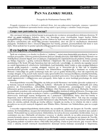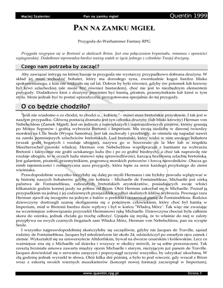 Maciej Szaleniec Pan na zamku mgieł Quentin 1999 PAN NA ZAMKU MGIEŁ Przygoda do Warhammer Fantasy RPG Przygoda rozgrywa się w Bretonii w okolicach Brion. Jest ona połączeniem kryminału, romansu i opowieści szpiegowskiej. Dodatkowo wprowadza bardzo ważny wątek w życie jednego z członków Twojej drużyny. Czego nam potrzeba by zacząć? Aby zawiązać intrygę na której bazuje ta przygoda nie wystarczy przypadkowo dobrana drużyna. W skład jej musi wchodzić bohater, który ma dorosłego syna, ewentualnie kogoś bardzo blisko spokrewnionego, z kim nie widziało się od lat. Dobrze by było również, gdyby ów potomek lub krewny był krwi szlacheckiej (ale może być również bastardem), choć nie jest to niezbędnym elementem przygody. Dodatkowo ktoś z drużyny powinien być banitą, piratem, przemytnikiem lub kimś w tym stylu. Może jednak być to postać epizodyczna, przygotowana specjalnie do tej przygody. O co będzie chodziło? "Jeśli nie wiadomo o co chodzi, to chodzi o... kobietę." - mówi stare bretońskie przysłowie. I tak jest w naszym przypadku. Główną postacią dramatu jest syn członka drużyny (lub bliski krewny) Herman von Nebelschloss (Zamek Mgieł). Jest on jednym z największych i najstraszliwszych piratów, którzy grasują po Morzu Szponów i grabią wybrzeża Bretonii i Imperium. Ma swoją siedzibę w dawnej twierdzy morskiej na L'Île Seule (Wyspa Samotna). Jest tak zuchwały i przebiegły, że ośmiela się napadać nawet na zamki pomniejszych szlachciców bretońskich. Lud bretoński, który widzi w nim swojego bohatera (wszak grabi bogatych i rozdaje ubogim), nazywa go w Souverain de la Mer lub w respiklu Meerherrscher (morski władca). Herman von Nebelschloss współpracuje z banitami na wybrzeżu Bretonii i faktycznie nie grabi uciskanego ludu (bo i po co grabić biednych), a choć tak naprawdę nie rozdaje ubogim, to w oczach ludu stanowi rękę sprawiedliwości, karzącą bezlitosną szlachtę bretońską. Jest galantem, piratem, przemytnikiem, pogromcą morskich potworów i łowcą niewolników. Otacza go nimb tajemniczości i romantyczna aura przygody, która łapie za serce każdego przykutego do ziemi wieśniaka. Prawdopodobnie wszystko toczyłoby się dalej po myśli Hermana i nie byłoby powodu wplątywać w tę historię naszych bohaterów gdyby nie kobieta - Michaelle de Fontainebleau. Michaelle jest córką państwa de Fontainebleau, zubożałych bretońskich arystokratów, posiadających swoje włości kilkanaście godzin konnej jazdy na północ od Brion. Otóż Herman zakochał się w Michaelle. Poznał ją przypadkiem na jednej z jej codziennych przejażdżek wzdłuż skalistych klifów wybrzeża. Pewnego razu Herman zjawił się incognito na jednym z balów u prefekta i oczarował panią de Fontainebleau. Rodzice dziewczyny dostrzegli szansę skoligacenia się z potężnym człowiekiem, który choć był banitą w Imperium, miał w Bretonii bardzo duże wpływy i był w końcu "Władcą Mórz". Tak więc nie zważając na wcześniejsze zobowiązania przyrzekli Hermanowi rękę Michaelle. Dziewczyna chociaż była całkiem skora do ożenku, jednak chciała go trochę odłożyć. Upajała się myślą, że to właśnie do niej w zaloty przypływa na swych czarnych fregatach sam Władca Mórz, Herman von Nebelschloss, pan na wyspie Seule. I wszystko najprawdopodobniej skończyłoby się szczęśliwie, gdyby nie Jacques de Traville, sąsiad rodziny de Fontainebleau. Jacques był młodzieńcem lat około 24, odziedziczył po zmarłym ojcu zamek i ziemie. Wykształcił się na uniwersytecie Altdorfskim, bywał na dworze cesarskim i królewskim. Lecz co ważniejsze zna się z Michaelle od dziecka i wszyscy w okolicy mówili, że są sobie przeznaczeni. Tak zresztą brzmiała umowa zawarta między ojcem Michaelle i starym, nieżyjącym już panem de Traville. Jacques dowiedział się o zerwaniu zaręczyn i poprzysiągł uczynić wszystko, by odzyskać ukochaną. W złą godzinę jednak wyrzekł te słowa. Otóż kilka dni później, a było to pod wieczór, gdy wracał z Brion wraz z eskortą swoich wiernych muszkieterów (koncept nowej formacji zaczerpnął w Imperium), www.quentin.rpg.pl Strona 1 Maciej Szaleniec Pan na zamku mgieł Quentin 1999 ogarnęła go nagle dziwna mgła. Jacques zdał sobie sprawę, że musi być w okolicy jednej ze swych wsi Winnej Zagrody. Wtem usłyszał głośne ujadania psów. Z kłębów mgły wynurzyły się szkaradne kształty fimirów. Młody szlachcic nie zwlekając zaatakował. Huknęła salwa muszkietów, zasyczały szpady dzielnych muszkieterów. Rajd został rozbity. Jacques wziął do niewoli jednego ze szkaradnych stworów, jak mu się słusznie wydawało przywódcę niedoszłego napadu. Jakie zdziwienie ogarnęło młodzieńca, gdy istota owa przemówiła łamanym bretońskim i zaoferowała mu w zamian za życie odzyskanie Michaelle. Jacques bez wahania się zgodził. W kilka dni później Michaelle została porwana. Jak stwierdzili naoczni świadkowie, "porwania dokonał Herman von Nebelschloss, pirat i banita. Następnego dnia został on ujęty na zamku w Fontainebleau, gdy przybył do rodziców porwanej" Herman został osadzony w La Tour Noir (Czarnej Wieży). Ponieważ sprawa dotyczyła szlacheckiej córki, śledztwem i wyrokiem nie mógł się zająć byle urzędniczyna. Posłano więc po królewskiego bajlifa. Jedynie dzięki szybkiej łapówce bosmana i zastępcy Hermana bajlif udał się w objazd prowincji, zanim dotarł do niego list wzywający do stawienia się w Fontainebleau. Bajlif obiecał zwlekać miesiąc czasu, może trochę dłużej. Później jednak będzie musiał przybyć i rozpocząć śledztwo. W tym czasie bosman - Pierre Kaprawy - wysłał posłańca z przemyconym z La Tour Noir listem od Hermana do jego ukochanego ojca (matki, wuja, ciotki... niepotrzebne skreślić) z prośbą o ratunek. W liście owym Herman składał los swój w ręce członka rodziny i zaklina