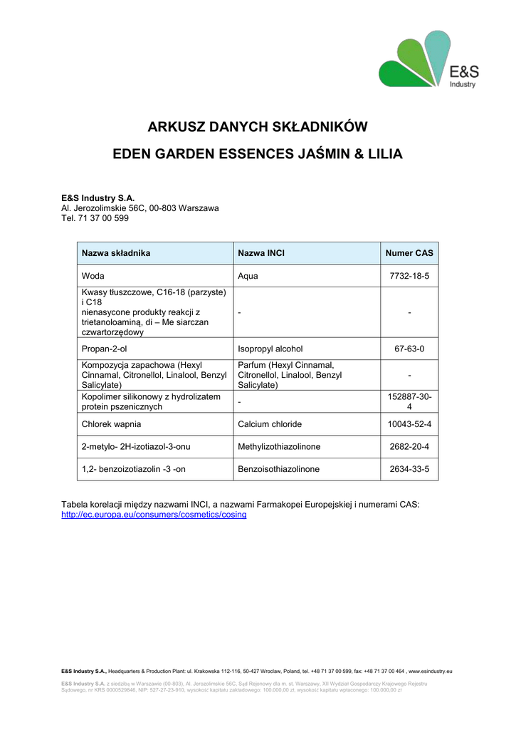 ARKUSZ DANYCH SKŁADNIKÓW EDEN GARDEN ESSENCES JAŚMIN & LILIA E&S Industry S.A. Al. Jerozolimskie 56C, 00-803 Warszawa Tel. 71 37 00 599 Nazwa składnika Nazwa INCI Woda Aqua Kwasy tłuszczowe, C16-18 (parzyste) i C18 nienasycone produkty reakcji z trietanoloaminą, di – Me siarczan czwartorzędowy - Propan-2-ol Isopropyl alcohol Kompozycja zapachowa (Hexyl Cinnamal, Citronellol, Linalool, Benzyl Salicylate) Kopolimer silikonowy z hydrolizatem protein pszenicznych Parfum (Hexyl Cinnamal, Citronellol, Linalool, Benzyl Salicylate) - 152887-304 Chlorek wapnia Calcium chloride 10043-52-4 2-metylo- 2H-izotiazol-3-onu Methylizothiazolinone 2682-20-4 1,2- benzoizotiazolin -3 -on Benzoisothiazolinone 2634-33-5 Numer CAS 7732-18-5 - 67-63-0 - Tabela korelacji między nazwami INCI, a nazwami Farmakopei Europejskiej i numerami CAS: http://ec.europa.eu/consumers/cosmetics/cosing E&S Industry S.A., Headquarters & Production Plant: ul. Krakowska 112-116, 50-427 Wroclaw, Poland, tel. +48 71 37 00 599, fax: +48 71 37 00 464 , www.esindustry.eu E&S Industry S.A. z siedzibą w Warszawie (00-803), Al. Jerozolimskie 56C, Sąd Rejonowy dla m. st. Warszawy, XII Wydział Gospodarczy Krajowego Rejestru Sądowego, nr KRS 0000529846, NIP: 527-27-23-910, wysokość kapitału zakładowego: 100.000,00 zł, wysokość kapitału wpłaconego: 100.000,00 zł