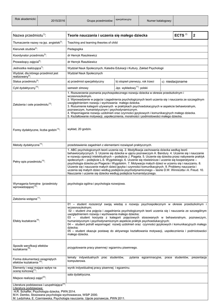 Rok akademicki: Grupa przedmiotów: 2015/2016 specjalizacyjny Numer katalogowy: Teorie nauczania i uczenia się małego dziecka Nazwa przedmiotu1): 3) Tłumaczenie nazwy na jęz. angielski : Teaching and learning theories of child Kierunek studiów4): Pedagogika 5) Koordynator przedmiotu : dr Henryk Raszkiewicz Prowadzący zajęcia6): dr Henryk Raszkiewicz 7) ECTS 2) Jednostka realizująca : Wydział Nauk Społecznych, Katedra Edukacji i Kultury, Zakład Psychologii Wydział, dla którego przedmiot jest realizowany8): Wydział Nauk Społecznych Status przedmiotu9): a) przedmiot specjalistyczny 10) b) stopień pierwszy, rok trzeci 2 c) niestacjonarne 11) Jęz. wykładowy : polski Cykl dydaktyczny : semestr zimowy Założenia i cele przedmiotu12): 1. Rozszerzenie poznania psychospołecznego rozwoju dziecka w okresie przedszkolnym i wczesnoszkolnym. 2. Wprowadzenie w pojęcia i zagadnienia psychologicznych teorii uczenia się i nauczania ze szczególnym uwzględnieniem rozwoju i wychowania małego dziecka. 3. Rozumienie kategorii używanych w praktykach psychoedukacyjnych w aspekcie behawioralnym, poznawczym, humanistycznym i psychodynamicznym. 4. Wspomaganie rozwoju uzdolnień oraz czynności językowych i komunikacyjnych małego dziecka. 5. Kształtowanie motywacji, uspołecznienia, moralności i podmiotowości małego dziecka. Formy dydaktyczne, liczba godzin13): wykład, 20 godzin. Metody dydaktyczne14): przedstawienie zagadnień z elementami rozwiązań praktycznych. Pełny opis przedmiotu15): 1. ABC psychologicznych teorii uczenia się. 2. Modyfikacja zachowania dziecka według teorii behawiorystycznych. 3. Uczenie się dziecka w ujęciu poznawczym A. Bandury. 4. Uczenie się i nauczanie w rozwoju operacji intelektualnych – podejście J. Piageta. 5. Uczenie się dziecka przez nabywanie praktyk społecznych – podejście L.S. Wygotskiego. 6. Uczenie się rówieśnicze i uczenie się kooperatywne – psychologia dziecka po Piagecie i Wygotskim. 7. Motywacja małych dzieci w uczeniu się i nauczaniu. 8. Uczenie się i nauczanie małych dzieci języka i czynności komunikacyjnych. 9. Problemy nauczania i uczenia się małych dzieci według podejścia psychodynamicznego – teorie D.W. Winnicotta i A. Freud. 10. Nauczanie i uczenie się dziecka według podejścia humanistycznego. Wymagania formalne (przedmioty wprowadzające)16): psychologia ogólna i psychologia rozwojowa. Założenia wstępne17): Efekty kształcenia18): Sposób weryfikacji efektów kształcenia19): Forma dokumentacji osiągniętych efektów kształcenia 20): Elementy i wagi mające wpływ na ocenę końcową21): Miejsce realizacji zajęć22): 01 – student rozszerzył swoją wiedzę o rozwoju psychospołecznym w okresie przedszkolnym i wczesnoszkolnym; 02 – student zna pojęcia i zagadnienia psychologicznych teorii uczenia się i nauczania ze szczególnym uwzględnieniem rozwoju i wychowania małego dziecka; 03 – student korzysta z kategorii pojęciowych stosowanych w behawioralnym, poznawczym, humanistycznym i psychodynamicznym aspekcie praktyk psychoedukacyjnych; 04 – student potrafi wspomagać rozwój uzdolnień oraz czynności językowych i komunikacyjnych małego dziecka; 05 – student okazuje postawę do aktywnego kształtowania motywacji, uspołecznienia i podmiotowości małego dziecka. przygotowanie pracy pisemnej i egzaminu pisemnego. tematy indywidualnych prac studentów, komputerowa. pytania egzaminacyjne, prace studentów, prezentacja wynik indywidualnej pracy pisemnej i egzaminu. sala dydaktyczna. Literatura podstawowa i uzupełniająca23): Literatura podstawowa: H.R. Schaffer, Psychologia dziecka, PWN 2014. M.H. Dembo, Stosowana psychologia wychowawcza, WSiP 2000. M. Ledzińska, E. Czerniawska, Psychologia nauczania. Ujęcie poznawcze, PWN 2011. J. Johns, Sprzyjające otoczenie, (w: ) S. Budd, R. Rusbridger, Współczesna psychoanaliza brytyjska, Oficyna Ingenium 2008. Literatura uzupełniająca: R. J. Gerrig, P. G. Zimbardo, Psychologia i życie, rozdz. Zachowanie przystosowawcze: warunkowanie i uczenie się, PWN 2006. A.E. Kazdin, Jak krok po kroku wprowadzić trwałą zmianę w relacji z dzieckiem. Czarna Owca 2014. J. Wadsworth, Psychologia Piageta, WSiP 2011. R. Edgcumbe, Anna Freud, Gdańskie Wydawnictwo Psychologiczne 2007. UWAGI24): Wskaźniki ilościowe charakteryzujące moduł/przedmiot 25) : Szacunkowa sumaryczna liczba godzin pracy studenta (kontaktowych i pracy własnej) niezbędna dla osiągnięcia zakładanych efektów kształcenia18) - na tej podstawie należy wypełnić pole ECTS2: Łączna liczba punktów ECTS, którą student uzyskuje na zajęciach wymagających bezpośredniego udziału nauczycieli akademickich: wykłady – 0,8. Łączna liczba punktów ECTS, którą student uzyskuje w ramach zajęć o charakterze praktycznym: indywidualna praca pisemna – 0,6; przygotowanie do egzaminu – 0,6. 50 h 0,8 ECTS 1,2 ECTS Tabela zgodności kierunkowych efektów kształcenia z efektami przedmiotu 26) Nr /symbol efektu 01 Wymienione w wierszu efekty kształcenia: Student rozszerzył swoją wiedzę o rozwoju psychospołecznym w okresie Odniesienie do efektów dla programu kształcenia na kierunku K_W05 przedszkolnym i wczesnoszkolnym. 02 Student zna pojęcia i zagadnienia psychologicznych teorii uczenia się i nauczania ze K_W09 szczególnym uwzględnieniem rozwoju i wychowania małego dziecka. 03 Student korzysta z kategorii pojęciowych stosowanych w behawioralnym, poznawczym, K_U02 humanistycznym i psychodynamicznym aspekcie praktyk psychoedukacyjnych. 04 Student potrafi wspomagać rozwój uzdolnień oraz czynności językowych i K_U09 komunikacyjnych małego dziecka. 05 Student okazuje postawę do aktywnego kształtowania motywacji, uspołecznienia i podmiotowości małego dziecka. K_K03