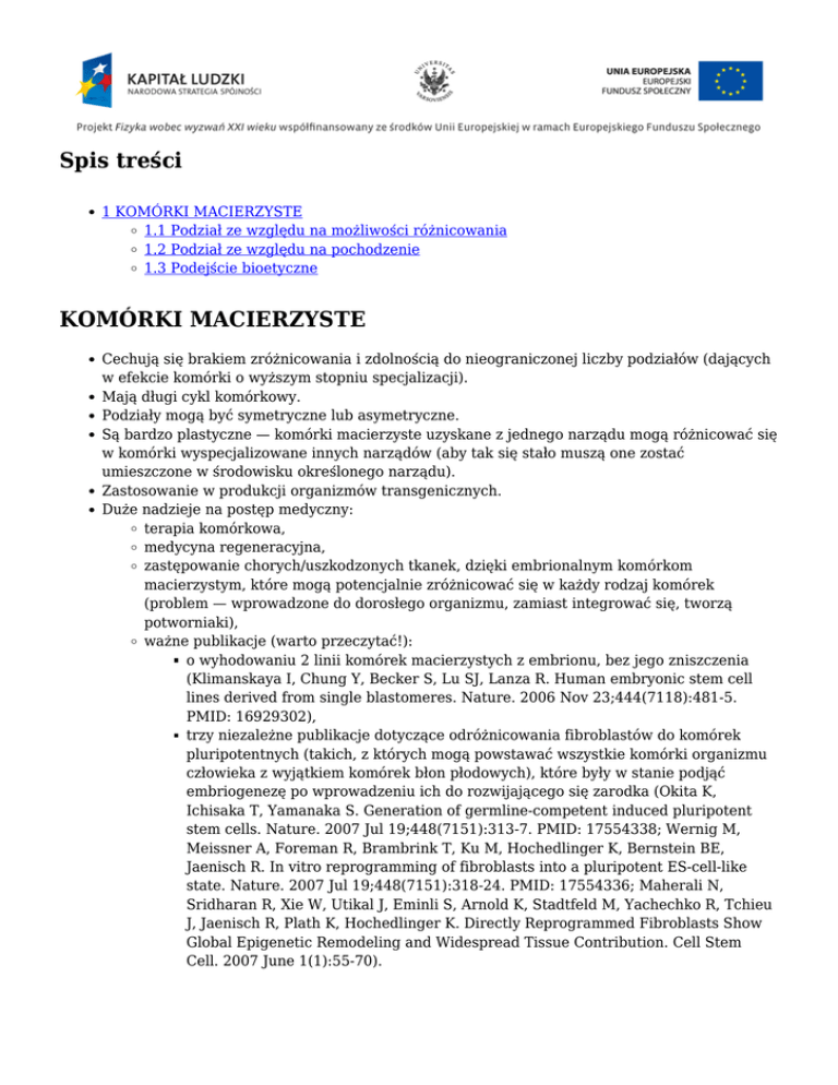 Spis treści 1 KOMÓRKI MACIERZYSTE 1.1 Podział ze względu na możliwości różnicowania 1.2 Podział ze względu na pochodzenie 1.3 Podejście bioetyczne KOMÓRKI MACIERZYSTE Cechują się brakiem zróżnicowania i zdolnością do nieograniczonej liczby podziałów (dających w efekcie komórki o wyższym stopniu specjalizacji). Mają długi cykl komórkowy. Podziały mogą być symetryczne lub asymetryczne. Są bardzo plastyczne — komórki macierzyste uzyskane z jednego narządu mogą różnicować się w komórki wyspecjalizowane innych narządów (aby tak się stało muszą one zostać umieszczone w środowisku określonego narządu). Zastosowanie w produkcji organizmów transgenicznych. Duże nadzieje na postęp medyczny: terapia komórkowa, medycyna regeneracyjna, zastępowanie chorych/uszkodzonych tkanek, dzięki embrionalnym komórkom macierzystym, które mogą potencjalnie zróżnicować się w każdy rodzaj komórek (problem — wprowadzone do dorosłego organizmu, zamiast integrować się, tworzą potworniaki), ważne publikacje (warto przeczytać!): o wyhodowaniu 2 linii komórek macierzystych z embrionu, bez jego zniszczenia (Klimanskaya I, Chung Y, Becker S, Lu SJ, Lanza R. Human embryonic stem cell lines derived from single blastomeres. Nature. 2006 Nov 23;444(7118):481-5. PMID: 16929302), trzy niezależne publikacje dotyczące odróżnicowania fibroblastów do komórek pluripotentnych (takich, z których mogą powstawać wszystkie komórki organizmu człowieka z wyjątkiem komórek błon płodowych), które były w stanie podjąć embriogenezę po wprowadzeniu ich do rozwijającego się zarodka (Okita K, Ichisaka T, Yamanaka S. Generation of germline-competent induced pluripotent stem cells. Nature. 2007 Jul 19;448(7151):313-7. PMID: 17554338; Wernig M, Meissner A, Foreman R, Brambrink T, Ku M, Hochedlinger K, Bernstein BE, Jaenisch R. In vitro reprogramming of fibroblasts into a pluripotent ES-cell-like state. Nature. 2007 Jul 19;448(7151):318-24. PMID: 17554336; Maherali N, Sridharan R, Xie W, Utikal J, Eminli S, Arnold K, Stadtfeld M, Yachechko R, Tchieu J, Jaenisch R, Plath K, Hochedlinger K. Directly Reprogrammed Fibroblasts Show Global Epigenetic Remodeling and Widespread Tissue Contribution. Cell Stem Cell. 2007 June 1(1):55-70). Podział ze względu na możliwości różnicowania Totipotentne — różnicują do każdego typu komórek (także tworzących łożysko), pluripotentne — różnicują do każdego typu komórek (z wyjątkiem komórek łożyska), multipotentne — różnicują tylko do kilku typów komórek (o podobnych właściwościach i pochodzeniu embrionalnym — różnicują się w komórki, które pochodzą z tego samego listka zarodkowego), unipotentne (prekursorowe) — progenitorowe dla jednego typu komórek. Podział ze względu na pochodzenie Zarodkowe: Komórki macierzyste embrionalne — z komórek embrionalnych: totipotentne (gdy pochodzą z kilkukomórkowego embrionu), pluripotentne (gdy pochodzą z węzła zarodkowego blastocysty); wymagają do wzrostu fibroblastów zarodkowych. Dorosłych organizmów: Komórki macierzyste somatyczne (dorosłe) — z tkanek dorosłych organizmów; w zróżnicowanych tkankach i narządach pewien procent komórek nie jest w pełni zróżnicowany; komórki te są w pewnym zakresie predeterminowane co do kierunku różnicowania się, więc są: multipotentne, unipotentne, To komórki obecne we wszystkich przebadanych dotąd tkankach. Prawdopodobnie wszystkie nowotwory wywodzą się z komórek macierzystych. Mają ograniczony czas życia — często obumierają podczas hodowli. Typy: HSC — komórki krwi; źródła: szpik (0,5 – 3%), krew pępowinowa (0,1 – 0,5%), mobilizowana krew obwodowa (0,05 – 0,2%); zastosowanie: transplantacja szpiku w chorobach nowotworowych układu hematopoetycznego lub po radio-, chemioterapii. MSC — mezenchymalne komórki macierzyste (kości, chrząstki, tkanka tłuszczowa, wątroba, płuca, śledziona, grasica, trzustka, nerka, ale także krew obwodowa i płodowa); najwięcej MSC u noworodków; liczba MSC spada wraz z wiekiem organizmu; zastosowanie: hamują namnażanie limfocytów, tworzą zręb szpiku kostnego i mechaniczne wsparcie dla komórek hematopoetycznych, mają zdolności immunomodulacyjne i immunosupresyjne, łagodzą przebieg zaburzeń mezenchymatycznych (np. przyspieszają gojenie ran czy tworzą środowisko, które sprzyja łagodzeniu uszkodzeń ośrodkowego układu nerwowego). Podejście bioetyczne Szybki rozwój nauk medycznych wymusza ustosunkowanie się do problemów etycznych, które towarzyszą tym zmianom. Nauka rozwija się w niezwykłym tempie, a jej efekty często wywołują odmienne odczucia i postawy. W krajach gdzie przyzwolenie społeczne na różnego typu badania naukowe jest duże (na przykład w Korei Południowej), badania naukowe mogą rozwijać się w sposób dynamiczny. Tutaj możliwe jest przeprowadzanie najśmielszych badań medycznych, które dla innych są absolutnie niedopuszczalne z perspektywy moralnej. To właśnie współczesna transplantologia i medycyna regeneracyjna są dziedzinami nauki, które skupiają w sobie kontrowersje etyczne dzisiejszej biologii i medycyny. W odniesieniu do komórek macierzystych pojawiają się następujące pytania i wątpliwości: Czy godzi nam się wykorzystywać ludzkie embriony? Czy możemy traktować je wyłącznie jako materiał biologiczny, który odpowiednio wykorzystany niesie ze sobą wielkie nadzieje i może doprowadzić do zatarcia różnicy między komórkami somatycznymi a zarodkowymi (opinia Ks. prof. PAT dr hab. Tadeusza Biesaga SDB z Katedry Bioetyki Papieskiej Akademii Teologicznej w Krakowie)? Inny przecież jest status macierzystej komórki zarodkowej, z której powstaje nowe życie. Ponadto w bioetyce personalistycznej embrion rozumiany jest jako nowy człowiek (ukształtowany jest odrębny genotyp, który określa niepowtarzalne cechy i właściwości rozwijającego się