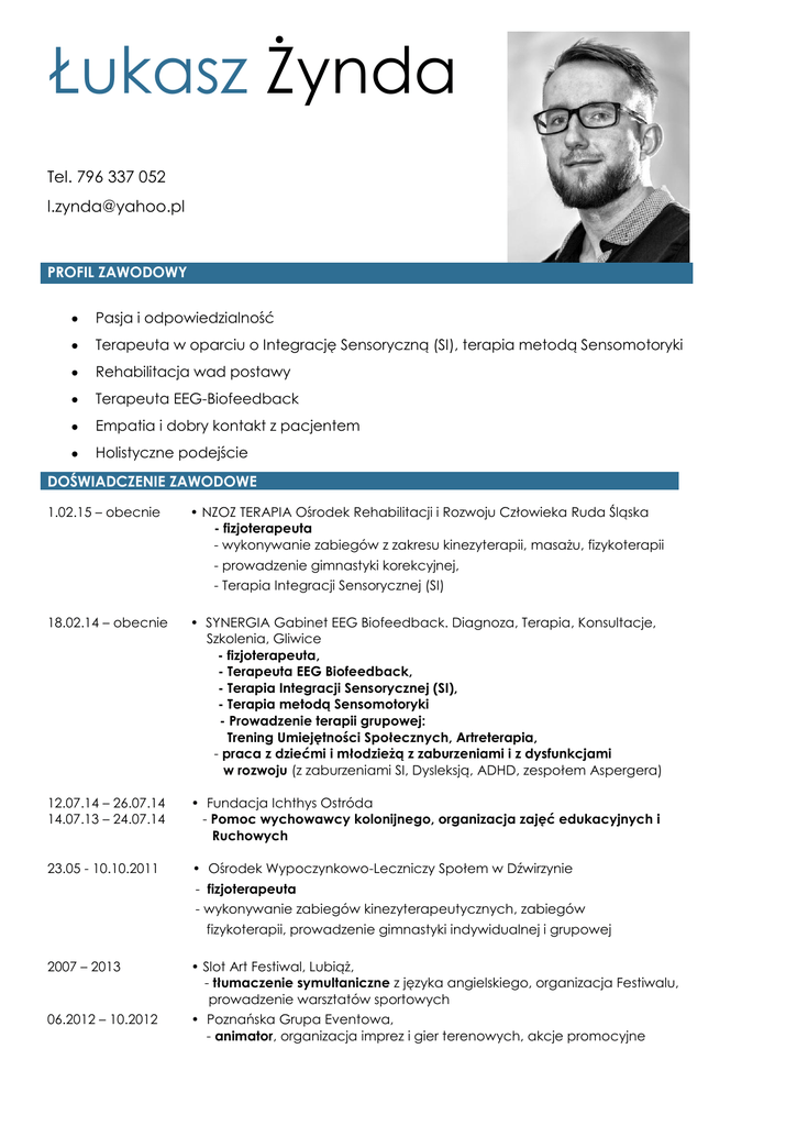 Łukasz Żynda Tel. 796 337 052 [email protected] PROFIL ZAWODOWY Pasja i odpowiedzialność Terapeuta w oparciu o Integrację Sensoryczną (SI), terapia metodą Sensomotoryki Rehabilitacja wad postawy Terapeuta EEG-Biofeedback Empatia i dobry kontakt z pacjentem Holistyczne podejście DOŚWIADCZENIE ZAWODOWE 1.02.15 – obecnie • NZOZ TERAPIA Ośrodek Rehabilitacji i Rozwoju Człowieka Ruda Śląska - fizjoterapeuta - wykonywanie zabiegów z zakresu kinezyterapii, masażu, fizykoterapii - prowadzenie gimnastyki korekcyjnej, - Terapia Integracji Sensorycznej (SI) 18.02.14 – obecnie • SYNERGIA Gabinet EEG Biofeedback. Diagnoza, Terapia, Konsultacje, Szkolenia, Gliwice - fizjoterapeuta, - Terapeuta EEG Biofeedback, - Terapia Integracji Sensorycznej (SI), - Terapia metodą Sensomotoryki - Prowadzenie terapii grupowej: Trening Umiejętności Społecznych, Artreterapia, - praca z dziećmi i młodzieżą z zaburzeniami i z dysfunkcjami w rozwoju (z zaburzeniami SI, Dysleksją, ADHD, zespołem Aspergera) 12.07.14 – 26.07.14 14.07.13 – 24.07.14 • Fundacja Ichthys Ostróda - Pomoc wychowawcy kolonijnego, organizacja zajęć edukacyjnych i Ruchowych 23.05 - 10.10.2011 • Ośrodek Wypoczynkowo-Leczniczy Społem w Dźwirzynie - fizjoterapeuta - wykonywanie zabiegów kinezyterapeutycznych, zabiegów fizykoterapii, prowadzenie gimnastyki indywidualnej i grupowej 2007 – 2013 • Slot Art Festiwal, Lubiąż, - tłumaczenie symultaniczne z języka angielskiego, organizacja Festiwalu, prowadzenie warsztatów sportowych 06.2012 – 10.2012 • Poznańska Grupa Eventowa, - animator, organizacja imprez i gier terenowych, akcje promocyjne WYKSZTAŁCENIE: 2014 – 2016 Śląski Uniwersytet Medyczny w Katowicach – Fizjoterapia Uzupełniające studia magisterskie 2011 – 2013 Uniwersytet Medyczny w Poznaniu - Zdrowie Publiczne – Uzupełniające studia magisterskie specjalizacja Zarządzanie w Ochronie Zdrowia 2012 – 2013 Pomorski Uniwersytet Medyczny - studia podyplomowe fizjoterapia w kardiologii i profilaktyce chorób układu krążenia 2007 – 2010 Państwowa Wyższa Szkoła Zawodowa w Pile - Fizjoterapia – licencjat DODATKOWE KWALIFIKACJE: Integracja Sensoryczna wg Ayres Kurs I⁰ - Gesellschaft für Sensorische Integration Österreich Integracja Sensoryczna wg Ayres Kurs II.1 Ocena poprzez obserwacje kliniczne” Gesellschaft für Sensorische Integration Österreich Integracja Sensoryczna wg Ayres Kurs II.2 Ocena za pomocą standardowych narzędzi” - Gesellschaft für Sensorische Integration Österreich Integracja Sensoryczna Kurs I⁰ (SInet) Sensomotoryka Kurs I⁰ EEG-Biofeedback Kurs I⁰ Etiopatogeza, diagnostyka i podstawowe zasady leczenia zachowawczego skolioz idiopatycznych, z elementami Metody Dobomed Wychowawca kolonijny – Kurs Socjoterapia – kurs Terapia sztuką w praktyce pedagogicznej – Arteterapia - Kurs Prawo jazdy kat. B Własny samochód Dobra obsługa komputera, MS Office, zdolność wyszukiwania informacji ZAINTERESOWANIA Sport i rekreacja: ultimate frisbee, bieganie, nordic walking, ochrona zdrowia, komputery, muzyka, literatura, język angielski Wyrażam zgodę na przetwarzanie moich danych osobowych dla potrzeb niezbędnych do realizacji procesu rekrutacyjnego, w celu pośrednictwa pracy (posiadania i przetwarzania przekazanych danych osobowych oraz ich udostępniania klientom w ramach prowadzonych projektów rekrutacyjnych) zgodnie z Ustawą z dnia 29.08.1997 roku o Ochronie Danych Osobowych; tekst jednolity: Dz. U. z 2002r. Nr 101, poz. 926 ze zm.