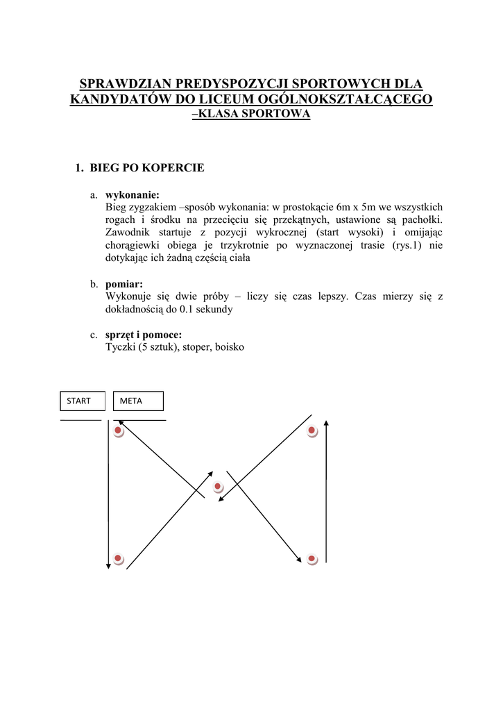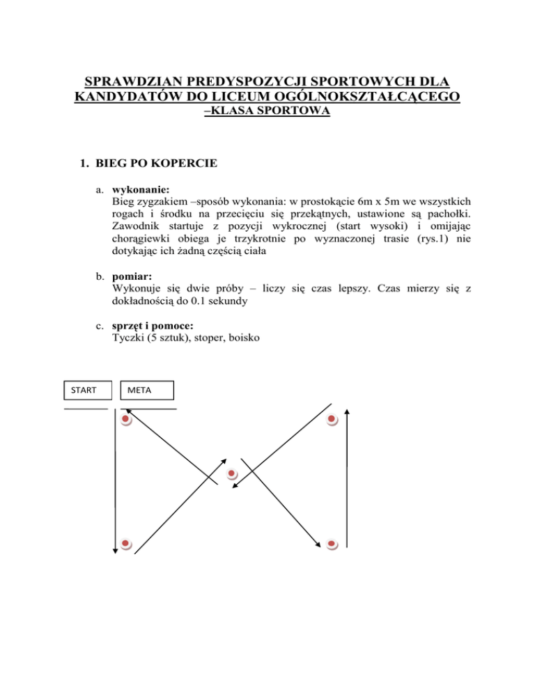 SPRAWDZIAN PREDYSPOZYCJI SPORTOWYCH DLA KANDYDATÓW DO LICEUM OGÓLNOKSZTAŁCĄCEGO –KLASA SPORTOWA 1. BIEG PO KOPERCIE a. wykonanie: Bieg zygzakiem –sposób wykonania: w prostokącie 6m x 5m we wszystkich rogach i środku na przecięciu się przekątnych, ustawione są pachołki. Zawodnik startuje z pozycji wykrocznej (start wysoki) i omijając chorągiewki obiega je trzykrotnie po wyznaczonej trasie (rys.1) nie dotykając ich żadną częścią ciała b. pomiar: Wykonuje się dwie próby – liczy się czas lepszy. Czas mierzy się z dokładnością do 0.1 sekundy c. sprzęt i pomoce: Tyczki (5 sztuk), stoper, boisko START META PUNKTACJA : DZIEWCZĘTA Wynik Punkty 28s i mniej 7 28,1s-29s 6 29,1s-30s 5 30,1s-31s 4 31,1s-32s 3 32,1s-33s 2 powyżej - 33s 1 1 - 7 pkt CHŁOPCY Wynik Punkty 24s i mniej 7 24,1s-25s 6 25,1s-26s 5 26,1s-27s 4 27,1s-28s 3 28,1s-29s 2 powyżej - 29s 1 2. SKŁONY W PRZÓD Z LEŻENIA (brzuszki) - W CZASIE 30 SEK Sposób wykonania: Pozycja wyjściowa - w leżeniu na plecach na podłożu, ręce splecione na karku, nogi ugięte w stawach kolanowych pod kątem 90 stopni, stopy rozstawione na ok. 30 cm. Partner w siadzie lub klęku, start meta trzymając rękoma podudzia ćwiczącego, przyciska jego stopy do podłoża, trzymając je we właściwej pozycji (kąt 90 stopni). Ćwiczący na sygnał powraca do skłonu, dotykając łokciami kolan. Czynność tę powtarza tak szybko jak tylko potrafi przez 30 sekund. Ocena: Łączna liczba poprawnie wykonanych skłonów w czasie 30 sekund. PUNKTACJA : DZIEWCZĘTA Wynik Punkty powyżej - 29 7 28-29 6 26-27 5 24-25 4 22-23 3 20-21 2 poniżej - 20 1 1 - 7 pkt CHŁOPCY Wynik Punkty powyżej - 31 7 30-31 6 28-29 5 26-27 4 24-25 3 22-23 2 poniżej - 22 1 3. SKOK W DAL Z MIEJSCA Sposób wykonania: Pozycja wyjściowa - stopy na szerokości bioder ustawione równolegle przed linią odbicia. Po kilku zamachach ramion dołem w tył z jednoczesnym przejściem do przysiadu ćwiczący wykonuje dynamiczny wymach ramion w przód z jednoczesnym odbiciem Ocena: z trzech skoków mierzonych z dokładnością do 1 cm uwzględnia się wynik najlepszy. Długość skoku mierzy się prostopadle od najbliższego śladu pięty do linii odbicia PUNKTACJA : DZIEWCZĘTA Wynik Punkty 210cm i więcej 7 200cm-209cm 6 190cm-199cm 5 180cm-189cm 4 170cm-179cm 3 160cm-169cm 2 poniżej -160cm 1 1 - 7 pkt CHŁOPCY Wynik Punkty 240cm i więcej 7 230cm-239cm 6 220cm-229cm 5 210cm-219cm 4 200cm-209cm 3 190cm-199cm 2 poniżej -190cm 1 4. RZUT PIŁKĄ LEKARSKĄ (dziewczęta- 2kg, chłopcy – 3kg) Z MIEJSCA W PRZÓD, ZNAD GŁOWY Sposób wykonania: Pozycja wyjściowa - piłka trzymana oburącz na wysokości klatki piersiowej, stopy na szerokości bioder, ustawione równolegle kilkanaście centymetrów przed linią wyrzutu (materacem). Ćwiczący po wykonaniu zamachu piłką, połączonego ze skłonem tułowia do tyłu i ugięciem nóg w kolanach, wyrzuca ją znad głowy. Ocena: Z trzech prób ocenianych z dokładnością do 10 cm uwzględnia się wynik najlepszy. Długość rzutu mierzy się prostopadle od najbliższego śladu piłki do linii odbicia PUNKTACJA : 1 - 7 pkt DZIEWCZĘTA Wynik Punkty powyżej - 8,00 7 7,50m-8,00m 6 6,90m-7,40m 5 6,30m-6,80m 4 5,70m-6,20m 3 5,10m-5,60m 2 poniżej -5,00m 1 CHŁOPCY Wynik Punkty powyżej - 8,50 7 8,00m-8,50m 6 7,40m-7,90m 5 6,80m-7,30m 4 6,20m-6,70m 3 5,60m-6,10m 2 poniżej -5,50m 1 PUNKTACJA ŁĄCZNA Na całkowitą ocenę sprawnościową składają się: Bieg po kopercie Siady z leżenia w czasie 30 sekund Skok w dal z miejsca Rzut piłką lekarską (2kg) z miejsca w przód znad głowy 1 – 7 pkt. 1 – 7 pkt. 1 – 7 pkt. 1 – 7 pkt. Łącznie maksymalnie zdający może uzyskać 28 punktów Minimalna ilość punktów do uzyskania kwalifikacji na sprawdzianie sprawnościowym wynosi 16 punktów