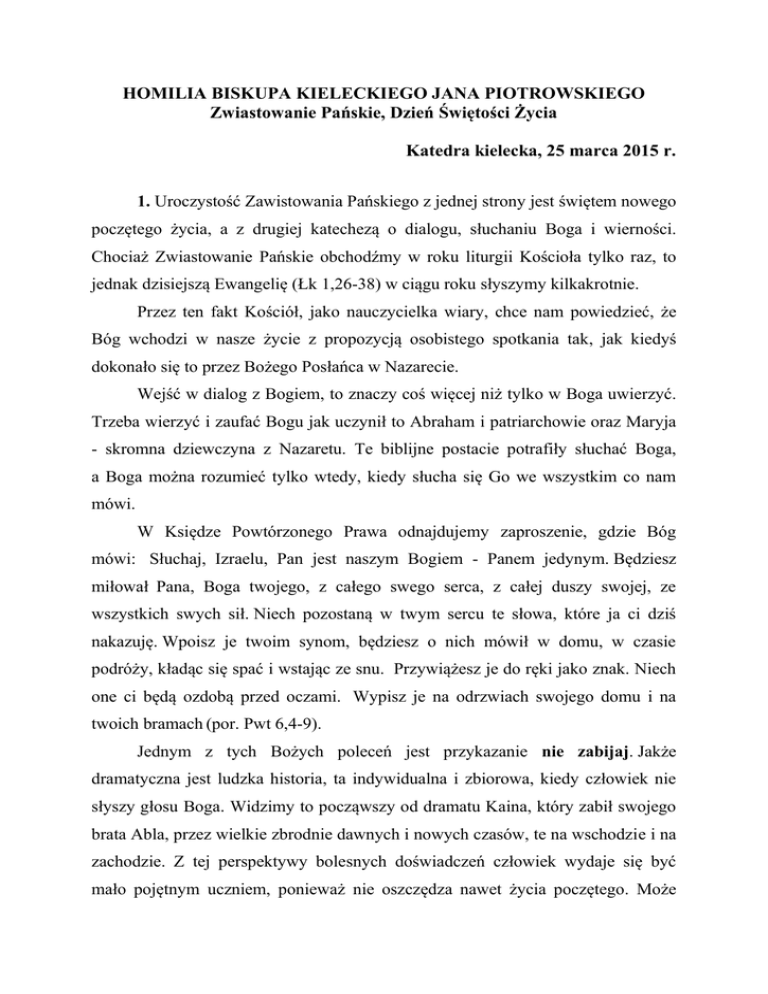 HOMILIA BISKUPA KIELECKIEGO JANA PIOTROWSKIEGO Zwiastowanie Pańskie, Dzień Świętości Życia Katedra kielecka, 25 marca 2015 r. 1. Uroczystość Zawistowania Pańskiego z jednej strony jest świętem nowego poczętego życia, a z drugiej katechezą o dialogu, słuchaniu Boga i wierności. Chociaż Zwiastowanie Pańskie obchodźmy w roku liturgii Kościoła tylko raz, to jednak dzisiejszą Ewangelię (Łk 1,26-38) w ciągu roku słyszymy kilkakrotnie. Przez ten fakt Kościół, jako nauczycielka wiary, chce nam powiedzieć, że Bóg wchodzi w nasze życie z propozycją osobistego spotkania tak, jak kiedyś dokonało się to przez Bożego Posłańca w Nazarecie. Wejść w dialog z Bogiem, to znaczy coś więcej niż tylko w Boga uwierzyć. Trzeba wierzyć i zaufać Bogu jak uczynił to Abraham i patriarchowie oraz Maryja - skromna dziewczyna z Nazaretu. Te biblijne postacie potrafiły słuchać Boga, a Boga można rozumieć tylko wtedy, kiedy słucha się Go we wszystkim co nam mówi. W Księdze Powtórzonego Prawa odnajdujemy zaproszenie, gdzie Bóg mówi: Słuchaj, Izraelu, Pan jest naszym Bogiem - Panem jedynym. Będziesz miłował Pana, Boga twojego, z całego swego serca, z całej duszy swojej, ze wszystkich swych sił. Niech pozostaną w twym sercu te słowa, które ja ci dziś nakazuję. Wpoisz je twoim synom, będziesz o nich mówił w domu, w czasie podróży, kładąc się spać i wstając ze snu. Przywiążesz je do ręki jako znak. Niech one ci będą ozdobą przed oczami. Wypisz je na odrzwiach swojego domu i na twoich bramach (por. Pwt 6,4-9). Jednym z tych Bożych poleceń jest przykazanie nie zabijaj. Jakże dramatyczna jest ludzka historia, ta indywidualna i zbiorowa, kiedy człowiek nie słyszy głosu Boga. Widzimy to począwszy od dramatu Kaina, który zabił swojego brata Abla, przez wielkie zbrodnie dawnych i nowych czasów, te na wschodzie i na zachodzie. Z tej perspektywy bolesnych doświadczeń człowiek wydaje się być mało pojętnym uczniem, ponieważ nie oszczędza nawet życia poczętego. Może inaczej! Dlatego, że nie szanuje życia poczętego i niszczy je, już w łonie matki, usprawiedliwia wszystkie inne zbrodnie w imię czystości rasy, ideologicznego podboju, nowej obyczajowości, permisywizmu moralnego i postępu naukowego. 2. Dziś, zgromadzeni w murach kieleckiej katedry, jesteśmy zaproszeni przez dar Bożego słowa, aby zapytać siebie jak słuchamy Boga i jaką życiową odpowiedź dajemy Mu w naszej chrześcijańskiej codzienności. Jeśli mamy spokojne sumienia to dziękujmy Bogu i wraz z Maryją śpiewajmy radosne Magnificat. Jednak tchórzliwie nie zamykajmy oczu, aby nie widzieć, co się dzieje wokół nas. Świat przestał kochać nowe życie i w ostatnich latach przelała się przez świat fala zbrodni na dzieciach nienarodzonych. A przecież, jak uczył Jan Paweł II w encyklice o życiu: nowa istota ludzka nie stanie się nigdy człowiekiem, jeżeli nie jest nim od samego początku. Już od chwili poczęcia rozpoczyna się jego niepowtarzalna historia (por. EV 60). Zatem nie istnieje żadne ludzkie prawo, aby zabijać nienarodzone dzieci. Nie jesteśmy trybunałem, ale nie wolno zapominać o nacisku środowiska, rodziny i przyjaciół na matkę, aby nie przyjęła ona nowego życia. W takiej samej mierze odpowiedzialni są prawodawcy, pracownicy służby zdrowia, gdy oddają na służbę śmierci wiedzę i umiejętności zdobyte po to, by bronić życia. Winny będę również ja i każdy pasterz, jeśli przemilczy prawdę, że tylko Bóg jest Panem życia i śmierci. Od zawsze i na zawsze życie ludzkie jest święte, ponieważ od samego początku domaga się «stwórczego działania Boga» i pozostaje na zawsze w odniesieniu do Stwórcy. Sam Bóg jest Panem życia, od jego początku aż do końca. Nikt zatem, w żadnej sytuacji, nie może rościć sobie prawa do zniszczenia niewinnej istoty ludzkiej (por. EV 53). 3. Kto słucha Boga, tak jak Maryja, jest wierny i rozumie dar poczętego życia. Nasza wierność, chociaż często nosi rany ludzkich niedoskonałości, nakazuje nam krzyczeć wobec współczesnego świata, naszej ojczyzny i diecezji, że życie ludzkie jest święte od jego poczęcia aż do naturalnej śmierci. Nikt nie ma prawa nam udowadniać, że jest inaczej. Mimo tej tragedii Bóg, w Jezusie Chrystusie, wciąż kocha świat i posyła nas, abyśmy o tej miłości przypominali. Dzień Świętości Życia jest czasem pamięci o tej miłości, która musi żyć w ludziach. Na początku swojego pontyfikatu w encyklice Redemptor hominis Jan Paweł II nauczał, że człowiek nie może żyć bez miłości, bowiem bez miłości pozostaje dla siebie istotą niezrozumiałą, jego życie jest pozbawione sensu, jeśli nie objawi mu się Miłość, jeśli nie spotka się z Miłością, jeśli jej nie dotknie i nie uczyni w jakiś sposób swoją, jeśli nie znajdzie w niej żywego uczestnictwa. W tej miłości, jaką Bóg objawia w Chrystusie, człowiek odnajduje swoją właściwą wielkość, godność i wartość swego człowieczeństwa (por. RH 10). Dlatego we wspólnocie Kościoła tak licznie podejmujemy zadania Adopcji Życia Poczętego wsparte Bożą łaską, modlitwą i ofiarą, aby bronić i ochraniać każde poczęte życie w rodzinach naszego miasta, naszej diecezji, ojczyzny i świata. Nie zapominajmy, że życie ma więcej zwolenników niż przeciwników, ale i nam grozi niebezpieczeństwo, że stajemy się tym, co słyszymy i co oglądamy. Słuchajmy zatem głosu Boga i wiernie naśladujmy Maryję, Matkę i Opiekunkę każdego nowego życia. Amen.