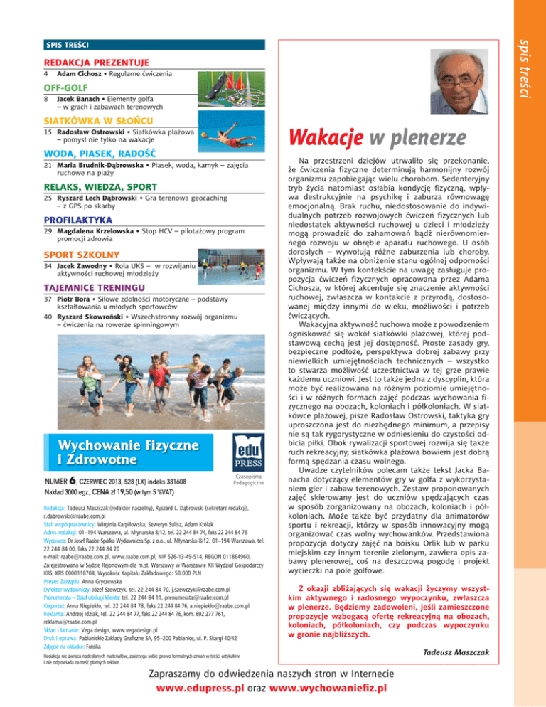 redakcja prezentuje spis treści SPIS TREŚCI REDAKCJA PREZENTUJE 4 Adam Cichosz • Regularne ćwiczenia OFF-GOLF 8 Jacek Banach • Elementy golfa – w grach i zabawach terenowych SIATKÓWKA W SŁOŃCU Wakacje w plenerze 15 Radosław Ostrowski • Siatkówka plażowa – pomysł nie tylko na wakacje WODA, PIASEK, RADOŚĆ 21 Maria Brudnik-Dąbrowska • Piasek, woda, kamyk – zajęcia ruchowe na plaży RELAKS, WIEDZA, SPORT 25 Ryszard Lech Dąbrowski • Gra terenowa geocaching – z GPS po skarby PROFILAKTYKA 29 Magdalena Krzelowska • Stop HCV – pilotażowy program promocji zdrowia SPORT SZKOLNY 34 Jacek Zawodny • Rola UKS – w rozwijaniu aktywności ruchowej młodzieży TAJEMNICE TRENINGU 37 Piotr Bora • Siłowe zdolności motoryczne – podstawy kształtowania u młodych sportowców 40 Ryszard Skowroński • Wszechstronny rozwój organizmu – ćwiczenia na rowerze spinningowym Wychowanie Fizyczne i Zdrowotne NUMER 6, CZERWIEC 2013, 528 (LX) indeks 381608 Nakład 3000 egz., CENA zł 19,50 (w tym 5 %VAT) Czasopisma Pedagogiczne Redakcja: Tadeusz Maszczak (redaktor naczelny), Ryszard L. Dąbrowski (sekretarz redakcji), [email protected] Stali współpracownicy: Wirginia Karpiłowska, Seweryn Sulisz, Adam Królak Adres redakcji: 01–194 Warszawa, ul. Młynarska 8/12, tel. 22 244 84 74, faks 22 244 84 76 Wydawca: Dr Josef Raabe Spółka Wydawnicza Sp. z o.o., ul. Młynarska 8/12, 01–194 Warszawa, tel. 22 244 84 00, faks 22 244 84 20 e-mail: [email protected], www.raabe.com.pl; NIP 526-13-49-514, REGON 011864960, Zarejestrowana w Sądzie Rejonowym dla m.st. Warszawy w Warszawie XII Wydział Gospodarczy KRS, KRS 0000118704, Wysokość Kapitału Zakładowego: 50.000 PLN Prezes Zarządu: Anna Gryczewska Dyrektor wydawniczy: Józef Szewczyk, tel. 22 244 84 70, [email protected] Prenumerata – Dział obsługi klienta: tel. 22 244 84 11, [email protected] Kolportaż: Anna Niepiekło, tel. 22 244 84 78, faks 22 244 84 76, [email protected] Reklama: Andrzej Idziak, tel. 22 244 84 77, faks 22 244 84 76, kom. 692 277 761, [email protected] Skład i łamanie: Vega design, www.vegadesign.pl Druk i oprawa: Pabianickie Zakłady Graficzne SA, 95–200 Pabianice, ul. P. Skargi 40/42 Zdjęcie na okładce: Fotolia Na przestrzeni dziejów utrwaliło się przekonanie, że ćwiczenia fizyczne determinują harmonijny rozwój organizmu zapobiegając wielu chorobom. Sedenteryjny tryb życia natomiast osłabia kondycję fizyczną, wpływa destrukcyjnie na psychikę i zaburza równowagę emocjonalną. Brak ruchu, niedostosowanie do indywidualnych potrzeb rozwojowych ćwiczeń fizycznych lub niedostatek aktywności ruchowej u dzieci i młodzieży mogą prowadzić do zahamowań bądź nierównomiernego rozwoju w obrębie aparatu ruchowego. U osób dorosłych – wywołują różne zaburzenia lub choroby. Wpływają także na obniżenie stanu ogólnej odporności organizmu. W tym kontekście na uwagę zasługuje propozycja ćwiczeń fizycznych opracowana przez Adama Cichosza, w której akcentuje się znaczenie aktywności ruchowej, zwłaszcza w kontakcie z przyrodą, dostosowanej między innymi do wieku, możliwości i potrzeb ćwiczących. Wakacyjna aktywność ruchowa może z powodzeniem ogniskować się wokół siatkówki plażowej, której podstawową cechą jest jej dostępność. Proste zasady gry, bezpieczne podłoże, perspektywa dobrej zabawy przy niewielkich umiejętnościach technicznych – wszystko to stwarza możliwość uczestnictwa w tej grze prawie każdemu uczniowi. Jest to także jedna z dyscyplin, która może być realizowana na różnym poziomie umiejętności i w różnych formach zajęć podczas wychowania fizycznego na obozach, koloniach i półkoloniach. W siatkówce plażowej, pisze Radosław Ostrowski, taktyka gry uproszczona jest do niezbędnego minimum, a przepisy nie są tak rygorystyczne w odniesieniu do czystości odbicia piłki. Obok rywalizacji sportowej rozwija się także ruch rekreacyjny, siatkówka plażowa bowiem jest dobrą formą spędzania czasu wolnego. Uwadze czytelników polecam także tekst Jacka Banacha dotyczący elementów gry w golfa z wykorzystaniem gier i zabaw terenowych. Zestaw proponowanych zajęć skierowany jest do uczniów spędzających czas w sposób zorganizowany na obozach, koloniach i półkoloniach. Może także być przydatny dla animatorów sportu i rekreacji, którzy w sposób innowacyjny mogą organizować czas wolny wychowanków. Przedstawiona propozycja dotyczy zajęć na boisku Orlik lub w parku miejskim czy innym terenie zielonym, zawiera opis zabawy plenerowej, coś na deszczową pogodę i projekt wycieczki na pole golfowe. Z okazji zbliżających się wakacji życzymy wszystkim aktywnego i radosnego wypoczynku, zwłaszcza w plenerze. Będziemy zadowoleni, jeśli zamieszczone propozycje wzbogacą ofertę rekreacyjną na obozach, koloniach, półkoloniach, czy podczas wypoczynku w gronie najbliższych. Redakcja nie zwraca nadesłanych materiałów, zastrzega sobie prawo formalnych zmian w treści artykułów i nie odpowiada za treść płatnych reklam. Zapraszamy do odwiedzenia naszych stron w Internecie www.edupress.pl oraz www.wychowaniefiz.pl Tadeusz Maszczak
