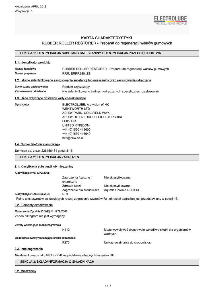 Aktualizacja APRIL 2013 Weryfikacja 5 KARTA CHARAKTERYSTYKI RUBBER ROLLER RESTORER - Preparat do regeneracji wałków gumowych SEKCJA 1: IDENTYFIKACJA SUBSTANCJI/MIESZANINY I IDENTYFIKACJA PRZEDSIĘBIORSTWA 1.1. Identyfikator produktu Nazwa handlowa Numer preparatu RUBBER ROLLER RESTORER - Preparat do regeneracji wałków gumowych RRR, ERRR250, ZE 1.2. Istotne zidentyfikowane zastosowania substancji lub mieszaniny oraz zastosowania odradzane Stwierdzone zastosowania Zastosowania odradzane Produkt czyszczący Nie zidentyfikowano żadnych odradzanych specyficznych zastosowań. 1.3. Dane dotyczące dostawcy karty charakterystyki Dystrybutor ELECTROLUBE. A division of HK WENTWORTH LTD ASHBY PARK, COALFIELD WAY, ASHBY DE LA ZOUCH, LEICESTERSHIRE LE65 1JR UNITED KINGDOM +44 (0)1530 419600 +44 (0)1530 416640 [email protected] 1.4. Numer telefonu alarmowego Semicon sp. z o.o. 226156431 godz: 8-16 SEKCJA 2: IDENTYFIKACJA ZAGROŻEŃ 2.1. Klasyfikacja substancji lub mieszaniny Klasyfikacja (WE 1272/2008) Zagrożenia fizyczne i Nie sklasyfikowane. chemiczne Zdrowie ludzi Nie sklasyfikowane. Zagrożenie dla środowiska Aquatic Chronic 4 - H413 Klasyfikacja (1999/45/EWG) R53. Pełny tekst zwrotów wskazujących rodzaj zagrożenia (zwrotów R) i określeń zagrożeń jest przedstawiony w sekcji 16. 2.2. Elementy oznakowania Oznaczenia Zgodnie Z (WE) Nr 1272/2008 Żaden piktogram nie jest wymagany. Zwroty wskazujące rodzaj zagrożenia H413 Dodatkowe zwroty wskazujące środki ostrożności P273 Może wywoływać długotrwałe szkodliwe skutki dla organizmów wodnych. Unikać uwalniania do środowiska. 2.3. Inne zagrożenia Nieklasyfikowany jako PBT / vPvB na podstawie obecnych kryteriów UE. SEKCJA 3: SKŁAD/INFORMACJA O SKŁADNIKACH 3.2. Mieszaniny 1/ 7 RUBBER ROLLER RESTORER - Preparat do regeneracji wałków gumowych C11-C15 ISO-ALKANES Numer CAS: 90622-58-5 30-60% Numer WE: 292-460-6 Klasyfikacja (WE 1272/2008) Nie sklasyfikowane. Klasyfikacja (67/548/EWG) Xn;R65. R66. C9-C12 ISO-ALKANES Numer CAS: 90622-57-4 30-60% Numer WE: 292-459-0 Klasyfikacja (WE 1272/2008) Nie sklasyfikowane. Klasyfikacja (67/548/EWG) Xn;R65. R66,R53. 1-BUTOKSYPROPAN-2-OL Numer CAS: 5131-66-8 10-30% Numer WE: 225-878-4 Klasyfikacja (WE 1272/2008) Skin Irrit. 2 - H315 Eye Irrit. 2 - H319 Klasyfikacja (67/548/EWG) Xi;R36/38 Pełny tekst zwrotów wskazujących rodzaj zagrożenia (zwrotów R) i określeń zagrożeń jest przedstawiony w sekcji 16. Uwagi względem składu Składniki nie wymienione są zakwalifikowe jako sybstancje nieszkodliwe lub w stężeniu poniżej dopuszczalnego poziomu. SEKCJA 4: ŚRODKI PIERWSZEJ POMOCY 4.1. Opis środków pierwszej pomocy Wdychanie Niezwłocznie wynieść/wyprowadzić osobę narażoną na wdychanie na świeże powietrze. Zapewnić odpoczynek, ciepło i świeże powietrze. Spożycie Dokładnie wypłukać usta. Zapewnić opiekę lekarską. Kontakt ze skórą Natychmiast umyć skórę wodą z mydłem. Jeśli podrażnienie nie zniknie po myciu, skontaktować się z lekarzem. Kontakt z oczami Przed płukaniem upewnić się, że ewentualne soczewki kontaktowe zostały wyjęte z oczu. Niezwłocznie przemyć oczy dużą ilością wody, podnosząc powieki. Kontynuować płukanie przez co najmniej 15 minut. W przypadku utrzymującego się dyskomfortu skontaktować się z lekarzem. 4.2. Najważniejsze ostre i opóźnione objawy oraz skutki narażenia Kontakt ze skórą Nie zanotowano szczególnych objawów. 4.3. Wskazania dotyczące wszelkiej natychmiastowej pomocy lekarskiej i szczególnego postępowania z poszkodowanym Treat symptomatically SEKCJA 5: POSTĘPOWANIE W PRZYPADKU POŻARU 5.1. Środki gaśnicze Środki gaśnicze Produkt nie jest łatwo palny. Przy doborze środków gaszenia pożaru uwzględnić ewentualną obecność innych środków chemicznych. 2/ 7 RUBBER ROLLER RESTORER - Preparat do regeneracji wałków gumowych 5.2. Szczególne zagrożenia związane z substancją lub mieszaniną Niebezpieczne produkty spalania W normalnych warunkach – żadnych. Nadzwyczajne zagrożenia pożarowe i wybuchowe Nie stwierdzono nadzwyczajnych zagrożeń pożarem ani wybuchem. 5.3. Informacje dla straży pożarnej Szczególne Procedury Gasnicze Nie podano żadnych szczególnych procedur gaszenia pożaru. SEKCJA 6: POSTĘPOWANIE W PRZYPADKU NIEZAMIERZONEGO UWOLNIENIA DO ŚRODOWISKA 6.1. Indywidualne środki ostrożności, wyposażenie ochronne i procedury w sytuacjach awaryjnych Stosować odzież ochronną zgodnie z sekcją 8 niniejszej karty charakterystyki preparatu niebezpiecznego. 6.2. Środki ostrożności w zakresie ochrony środowiska Nie odprowadzać do gruntu i cieków wodnych. 6.3. Metody i materiały zapobiegające rozprzestrzenianiu się skażenia i służące do usuwania skażenia Zebrać wermikulitem, suchym piaskiem albo ziemią i przesypać do pojemników. Zanieczyszczony teren spłukać dużą ilością wody. 6.4. Odniesienia do innych sekcji Stosować odzież ochronną zgodnie z sekcją 8 niniejszej karty charakterystyki preparatu niebezpiecznego. Bardziej szczegółowe informacje dotyczące skutków i objawów zdrowotnych znajdują się w sekcji 11. Zebrać rozlany /rozsypany preparat i usunąć zgodnie z wytycznymi pkt. 13. SEKCJA 7: POSTĘPOWANIE Z SUBSTANCJAMI I MIESZANINAMI ORAZ ICH MAGAZYNOWANIE 7.1. Środki ostrożności dotyczące bezpiecznego postępowania Unikać rozlania / rozsypania i kontaktu ze skórą i oczami. 7.2. Warunki bezpiecznego magazynowania, łącznie z informacjami dotyczącymi wszelkich wzajemnych niezgodności Przechowywać w szczelnie zamkniętym oryginalnym opakowaniu w suchym, chłodnym miejscu z dobrą wentylacją. Przechowywać w oryginalnym opakowaniu. 7.3. Szczególne zastosowanie(-a) końcowe Stwierdzone zastosowania tego produktu są wyszczególnione w Sekcji 1.2. SEKCJA 8: KONTROLA NARAŻENIA/ŚRODKI OCHRONY INDYWIDUALNEJ 8.1. Parametry dotyczące kontroli Nazwa STD 1-BUTOKSYPROPAN-2-OL SUP NDS NDSCH Uwagi 50 ppm C11-C15 ISO-ALKANES 1200 mg/m3 C9