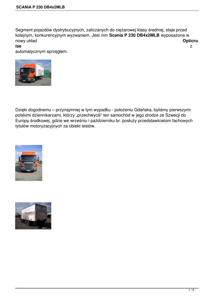 SCANIA P 230 DB4x2MLB Segment pojazdów dystrybucyjnych, zaliczanych do ciężarowej klasy średniej, staje przed kolejnym, konkurencyjnym wyzwaniem. Jest nim Scania P 230 DB4x2MLB wyposażona w nowy układ Opticru ise z automatycznym sprzęgłem. Dzięki dogodnemu – przynajmniej w tym wypadku - położeniu Gdańska, byliśmy pierwszymi polskimi dziennikarzami, którzy „przechwycili” ten samochód w jego drodze ze Szwecji do Europy środkowej, gdzie we wrześniu i październiku br. posłuży przedstawicielom fachowych tytułów motoryzacyjnych za obiekt testów. 1/9 SCANIA P 230 DB4x2MLB Dodajmy, że za kierownicą Scanii zasiedliśmy w poniedziałek, 21 września 2009, ledwie tydzień po jej premierowej prezentacji z drugiej strony Bałtyku. Była to zatem absolutna „sztuka nówka”, toteż jazda 20-tonowym pojazdem po zatłoczonych ulicach Gdańska, Sopotu i Gdyni okazała się dla niżej podpisanego nie lada wyzwaniem. Z jednej strony – ochota na możliwie najpełniejsze poznanie walorów ciężarówki w trudnych warunkach miejskich. Z drugiej – świadomość, że na taką okazję czekają również koledzy po piórze z pozostałych regionów Polski oraz krajów ościennych. Głupio byłoby coś uszkodzić lub w coś przywalić i przerwać zapoznawcze tournee nowej Scanii 230 P już w miejscu jego rozpoczęcia. Na szczęście – poszło pięknie i płynnie, bez najmniejszego choćby przytarcia opony o krawężnik. Znacząca w tym zasługa głównego obiektu naszego zainteresowania w testowanym pojeździe, tj. wspomnianego, udoskonalonego układu Opticruise. Wyręczając mnie w nieuniknionym, bezustannym „mieleniu” biegami – zwłaszcza w warunkach jazdy miejskiej – pozwolił skoncentrować się na uważnym odczytywaniu znaków drogowych (niekoniecznie pozwalających ciężarówkom na to samo, co samochodom osobowym), przewidywaniu manewrów innych kierowców oraz wybieraniu optymalnego toru jazdy podczas wjeżdżania w ulice prostopadłe, zawracania lub cofania. Prostota obsługi Praktyczne wykorzystywanie walorów układu Opticuise jest równie proste, jak operowanie przełącznikiem wycieraczek i spryskiwacza szyb w samochodzie osobowym. Przekręcając pierścień na niewielkim „joysticku” wybieramy: A – tryb automatyczny, M – tryb manualny, AP – tryb automatyczny z funkcją Power, MP – tryb manualny z funkcją Power, R – bieg wsteczny, N – położenie neutralne. Każdy wybór potwierdzony jest wyświetleniem odpowiedniego symbolu na tablicy rozdzielczej, przy czym tryby jazdy do przodu opisywane są dodatkowo liczbą określającą numer aktualnie włączonego biegu, np. A9, M6, AP10, MP12 itd. 2/9 SCANIA P 230 DB4x2MLB Przełączenie trybu pracy z automatycznego na manualny (lub odwrotnie) to tylko kwestia wykorzystania przycisku zlokalizowanego na końcu „joysticka”. Przy włączonym trybie manualnym wyboru biegu dokonuje się równie prosto; przyciągając „joystick” do siebie zmieniamy przełożenie na wyższe, odpychając – na niższe. Z powyższego opisu wynika jednoznacznie, że układ Opticruise nie wyklucza możliwości osobistego decydowania kierowcy o doborze biegów. To fakt, podobnie jak możliwość wyposażenia Scanii w Opticruise z pedałem sprzęgła. Czy to się jednak opłaca? Osobiście wątpię w celowość rezygnacji z atutów jaki daje w pełni zautomatyzowany Opticruise. Na obwodnicy Trójmiasta prowadziłem Scanię najpierw w trybie manualnym, dobierając przełożenia na swoje wyczucie, a następnie zdałem się na pracę automatu, sprawdzając jednocześnie obroty silnika na poszczególnych biegach. Praktycznie w każdym wypadku były one znacznie niższe, choć nie działo się to kosztem zmniejszenia dynamiki jazdy. Innymi słowy – silnik pracował równie wydajnie lecz przy mniejszym zużyciu paliwa i swoich podzespołów. Warto dodać, że w pełni zautomatyzowany układ Opticruise jest standardowo wyposażony w funkcję „Hill hold”, działającą zarówno przy ruszaniu pod górę jak i w dół wzniesienia. Po zdjęciu stopy z pedału hamulca w unieruchomionym pojeździe włącza się dźwiękowy i świetlny sygnał ostrzegawczy, a hamulce zasadnicze zwalniane są dopiero wówczas, gdy naciśniemy pedał przyspieszenia i uzyskamy moment obrotowy silnika wystarczająco duży, aby zapobiec cofnięciu się samochodu. Jak to działa? W technice obowiązuje zwykle zasada: im prostsza obsługa urządzenia, tym bardziej skomplikowana jego konstrukcja wewnętrzna. Każda czynność, od której chcemy zwolnić człowieka wymaga bowiem zastosowania dodatkowych rozwiązań technicznych. Układ Scania Opticruise stanowi w tym wypadku przykład wyjątkowo udanego kompromisu między uzyskanymi efektami, a stopniem złożoności konstrukcyjnej. Ale też Szwedzi pracowali nad nim już w latach 70-ych ubiegłego wieku. 3/9 SCANIA P 230 DB4x2MLB Zaczęło się od badań nad pneumatycznym układem zmiany biegów i pomysłem zastosowania go w samochodzie ciężarowym. W 1984 roku na rynku debiutuje Computer-Aided Gearchanging (CAG), w którym elektroniczna jednostka sterująca ustalała optymalny bieg włączany automatycznie po naciśnięciu przez kierowcę pedału sprzęgła. Pod koniec lat 80-ych układ sterujący zmianą biegów został skomputeryzowany i zintegrowany ze zwalniaczem Scania Retrarder. W grudniu 1994 roku doszło do oficjalnej prezentacji układu Scania Opticruise, a rok później trafił on na wyposażenie debiutujących wówczas samochodów ciężarowych Scania serii 4. Istotną zaletą rozwiązania przyjętego przez Scanię jest zastosowanie automatyzacji zmiany przełożeń w standardowej mechanicznej skrzyni biegów, co ułatwia jej montaż w podwoziu oraz obsługę techniczną i naprawę. Jedynym elementem wyróżniającym skrzynie biegów z układem Opticruise jest specjalna pokrywa, zawierająca siłowniki zmiany biegów i czujniki pozycji. Nic dziwnego, że takie rozwiązanie zyskało dotych