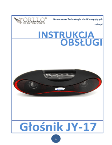Nowoczesne Technologie dla Wymagających orllo.pl INSTRUKCJA OBSŁUGI Głośnik JY-17 1 SPIS TREŚCI: I. II. III. IV. V. VI. VII. VIII. Wstęp…………………………………………………….…… 3 Cechy i funkcje urządzenia…………………….……. 4 Opis techniczny urządzenia………………….……… 5 Przed pierwszym użyciem…………………….……. 8 Odtwarzanie muzyki…………………………………... 9 Ustawienie zegara i alarmów…..………….………10 Wsparcie gwarancyjne i posprzedażowe……..11 Oferta ORLLO……………………………………………. 12 2 I. WSTĘP: Dziękujemy za okazane zaufanie i wybór produktu ORLLO. Niniejsza instrukcja zawiera informacje dotyczące specyfikacji technicznej i obsługi urządzenia, jego funkcji i ustawień oraz prawidłowej instalacji. Należy uważnie przeczytać treść niniejszej instrukcji obsługi przed pierwszym użytkowaniem. Postępowanie zgodne z instrukcją jest warunkiem prawidłowego funkcjonowania i korzystania z urządzenia. Życzymy Państwu zadowolenia z użytkowania urządzenia. 3 II. CECHY Łączność NFC- to technologia umożliwiająca bezprzewodowe, szybkie powiązywanie głośnika z telefonem bądź innym urządzeniem, który obsługuje NFC. Dzięki tej funkcji nie ma potrzeby wprowadzania haseł i potwierdzeń przy łączności Bluetooth Dźwięk stereo 2 x 3W Duży cyfrowy wyświetlacz: -Funkcja wyświetlania godziny i dnia tygodnia (d1- pon., d2wt,…) W trybie czuwania po naciśnięciu przycisku, pokazuje się godzina - oszczędzanie baterii. W trybie pracy (gdy słuchamy muzyki) godzina widoczna jest cały czas. Funkcja budzika/alarmu (możliwość ustawienia 2 alarmów) -wybór dni kiedy ma być aktywny Bluetooth 3.0 Radio FM (po podłączeniu przewodu aux jako antena) - Możliwość programowania stacji radiowych Slot na karty microSD Wejście AUX, USB Nowoczesny wygląd Wytrzymała obudowa Odbieranie rozmów za pomocą jednego przycisku, gdy telefon jest połączony z głośnikiem przez Bluetooth Automatyczne przełączanie na rozmowę telefoniczną gdy słuchamy muzyki Informacja głosowa o numerze dzwoniącego (w jęz. angielskim) Słuchanie muzyki przez Bluetooth Sterowanie głośnikiem przez Bluetooth Wbudowana wytrzymała bateria, dzięki czemu można zabrać głośnik ze sobą Czas pracy na baterii min. 7 godz. Wykorzystanie jako zestaw głośnomówiący Wysoka jakość dźwięku Sound System 3D stereo ORAZ FUNKCJE URZĄDZENIA 4 III. OPIS TECHNICZNY URZĄDZENIA Specyfikacja Techniczna: Moc wyjściowa: 6W 3Wx2 Częstotliwość: 20Hz-18KHz S/N: ≥80dB Głośnik: 52mm 4 Ω Zasilanie: DC 5V Bluetooth wersja 3.0 Łączność NFC Wymiary: 21x6.5x6.7cm Zasięg Bluetooth: 10m Przewód mini jack: ok 75cm Przewód USB/microUSB: 75cm 5 IV. OPIS TECHNICZNY URZĄDZENIA 6 V. OPIS TECHNICZNY URZĄDZENIA Opis techniczny : Diody sygnalizujące działanie: A. Bluetooth B. Radio FM C. Karta TF D. USB E. F. G. H. Alarm 1 Alarm 2 AUX Ładowanie Przyciski oraz wyjścia: 1. M-mode (tryb) 2. Cofnięcie utworu lub stacji radiowej/przyciszenie 3. Odtwarzanie/Pauza 4. Następny utwór lub stacja radiowa/podgłaszanie 5. Clock (Zegar) 6. Repeat (powtórzenie utworu) /wygaszenie ekranu 7. Włączanie/wyłączanie głośnika 8. Gniazdo zasilania microUSB 9. Gniazdo AUX 10. Slot kart TF (microSD) 11. Gniazdo USB Opis funkcji przycisków oraz wyjść: 1. Naciśnięcie powoduje wybór jednego z trybów odtwarzania (Bluetooth, FM, TF, USB ,AUX). Długie przytrzymanie przycisku powoduje ustawienie alarmów. 2. Naciśnięcie powoduje cofnięcie utworu. Długotrwałe przytrzymanie przycisku powoduje podgłośnienie dźwięku. 3. Odtwarzanie utworu / Zatrzymanie utworu / Odbieranie połączenia 4. Naciśnięcie powoduje wybranie następnego utworu / Długotrwałe przytrzymanie przycisku powoduje przyciszenie dźwięku. 5. Naciśnięcie powoduje sprawdzenie godziny oraz dnia tygodnia w trybie czuwania / przytrzymanie powoduje ustawienie zegara i dni tygodnia. 6. Naciśnięcie powoduje powtórzenie utworu / kolejne naciśnięcie powoduje powtórzenie wszystkich utworów / przytrzymanie powoduje wygaszenie ekranu. 7. Umożliwia podłączenie zasilania do urządzenia. 8. Umożliwia podłączenie przewodu miniJack 3.5mm . 7 9. Przełącznik umożliwiający włączenie i wyłączenie urządzenia. 10. Slot umożliwiający włożenie karty pamięci. 11. Gniazdo umożliwiające włożenie pamięci USB. IV. PRZED PIERWSZYM UŻYCIEM Przed Pierwszym Użyciem Urządzenia: 1. Przed użyciem należy zapoznać się z całą instrukcją, aby odpowiednio obsługiwać i użytkować urządzenie. 2. Nie należy urządzenia wystawiać na bezpośrednie działanie promieniowania słonecznego ani wysokich temperatur. 3. Urządzenie należy przechowywać, użytkować w suchym, pozbawionym wilgoci i wody miejscu. 4. Nie należy rozbierać ani demontować podzespołów urządzenia może to powodować nieprawidłowe działanie sprzętu. Gdy sprzęt działa nieprawidłowo należy go oddać do serwisu. 5. Nie należy stosować substancji chemicznych do czyszczenia. 6. Przed pierwszym użyciem głośnika należy naładować baterię do pełna. 7. Głośnik powinien być wyłączony gdy podłączamy do niego źródło zasilania lub inny przwód. Nieprzestrzeganie tej czynności może skutkować uszkodzeniem głośnika. WAŻNE: Specyfikacja może ulec zmianie z powodu modernizacji lub uaktualnień. Produkt rzeczywisty może różnić się od produktu poglądowego. 8 V. ODTWARZANIE Odtwarzanie muzyki: Po włączeniu głośnika możemy wybrać jeden z trybów odtwarzania muzyki za pomocą przycisku : Odtwarzanie (AUX, TF, USB) Po wybraniu odpowiedniego nośnika, głośnik automatycznie zacznie odtwarzanie muzyki. Aby przerwać lub zatrzymać odtwarzanie należy nacisnąć przycisk . Oznaczenie utworów na wyświetlaczu (01, 02, 03…….). Naciśnięcie przycisku powoduje cofnięcie utworu, a długotrwałe przytrzym
