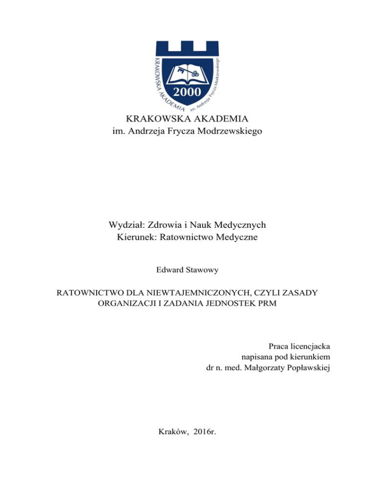 KRAKOWSKA AKADEMIA im. Andrzeja Frycza Modrzewskiego Wydział: Zdrowia i Nauk Medycznych Kierunek: Ratownictwo Medyczne Edward Stawowy RATOWNICTWO DLA NIEWTAJEMNICZONYCH, CZYLI ZASADY ORGANIZACJI I ZADANIA JEDNOSTEK PRM Praca licencjacka napisana pod kierunkiem dr n. med. Małgorzaty Popławskiej Kraków, 2016r. Spis treści: 1. Wykaz skrótów użytych w pracy 1.1. Cel pracy 2. Wstęp 2.1. Organizacja systemu PRM 2.2. Ratownicy medyczni i ratownicy 2.3. Podsumowanie 3. Piśmiennictwo 1. Wykaz skrótów użytych w pracy: PRM- Państwowe Ratownictwo Medyczne ZRM- Zespół Ratownictwa Medycznego SOR- Szpitalny Oddział Ratunkowy KPP- Kwalifikowana Pierwsza Pomoc MCR- Medyczne Czynności Ratunkowe LPR- Lotnicze Pogotowie Ratunkowe KSRG- Krajowy System Ratowniczo-Gaśniczy 1.1. Cel pracy Do wyboru tego tematu skłoniło mnie moje doświadczenie związane z ratownictwem, a szczególnie edukowanie społeczeństwa na temat ratownictwa w naszym kraju, z jakim spotykam się na co dzień. Celem pracy jest naświetlenie szerokiej grupie odbiorców niezwiązanych z ratownictwem, struktury systemu Państwowego Ratownictwa Medycznego, zasad organizacji, składu personalnego polskiego ratownictwa i wykonywanych przez nich zadań. 2. Wstęp Duża część społeczeństwa, niezwiązana z ratownictwem na co dzień, spytana o organizację ratownictwa w Polsce, posiada wiedzę z poziomu lat 90- tych. Spotkałem wiele osób, które nie wiedziały, kim jest ratownik medyczny, kto pracuje w zespołach ratownictwa medycznego (ZRM). Większość tych osób była przekonana że w karetkach musi być obecny lekarz. Spotkałem wiele opinii, że w karetkach jeżdżą sanitariusze z lekarzami, że straż pożarna nie jeździ do wypadków, większość nie wiedziała że w strukturach innych służb pracują ratownicy. Społeczeństwo jest zaskoczone, gdy słyszy że ratownik medyczny może samodzielnie udzielać świadczeń medycznych w karetce. Ludzie nie wiedzą, że to jest człowiek po studiach wyższych. W ostatniej dekadzie znacząco zmieniła się organizacja ratownictwa w Polsce. Od momentu wejścia w życie ustawy o Państwowym Ratownictwie Medycznym wyróżniamy również ratowników pracujących np. w szeregach Straży Pożarnych. Strażak jest profesjonalnie wyszkolony do ratowania ludzi w stanach zagrożenia życia, innych niż pożary. Czym różni się ratownik od ratownika medycznego? Te i inne kwestie rozwiąże w mojej pracy. 2.1. Organizacja systemu PRM. Art. 1 ustawy o Państwowym Ratownictwie Medycznym „ W celu realizacji zadań państwa polegającego na zapewnieniu pomocy każdej osobie znajdującej się w stanie nagłego zagrożenia zdrowotnego tworzy się system Państwowe Ratownictwo Medyczne”. Jednostkami Systemu Państwowego Ratownictwa Medycznego (PRM) są szpitalne oddziały ratunkowe (SOR) oraz zespoły ratownictwa medycznego. SOR jest to oddzielna komórka w organizacji szpitala, której zadaniem jest udzielanie pomocy w stanach nagłych. Drugim członem systemu PRM są zespoły ratownictwa medycznego, czyli popularne karetki (transport naziemny) i lotnicze zespoły ratownictwa medycznego Lotniczego Pogotowia Ratunkowego (LPR-transport powietrzny). Jednak nie wszystkie karetki są zespołami systemowymi. W zespołach ratownictwa medycznego działają tylko ambulanse typu „P” , „S” i LPR. Karetki transportowe typu T lub karetki prywatnych firm transportowych nie są jednostkami Państwowego Ratownictwa Medycznego. Do tego systemu nie należą również karetki organizacji zajmujących się pierwszą pomocą, np. Maltańska Służba Medyczna, PCK. W tych karetkach dopuszczona jest możliwość pracy sanitariusza lub ratownika po kursie kwalifikowanej pierwszej pomocy (KPP). Zadaniem tych organizacji jest przede wszystkim zabezpieczanie imprez masowych i organizacja szkoleń z zakresu pierwszej pomocy. Te i podobne organizacje współpracują z systemem PRM. W tym miejscu należy wyjaśnić jakie karetki są systemowe. Karetki systemowe, czyli zespoły ratownictwa medycznego PRM, są to ambulanse/śmigłowce ratunkowe, które realizują zadania zlecone przez dyspozytorów po przyjęciu wezwania z telefonu alarmowego. Ustawa określa podział ambulansów na: podstawowe (P), specjalistyczne (S) i zespoły HEMS (od ang. Helicopter Emergency Medical Service) Lotniczego Pogotowia Ratunkowego. Kadrę ambulansu typu P są stanowią minimum dwie osoby uprawnione do samodzielnego wykonywania medycznych czynności ratunkowych, które tworzą zespół ratownictwa medycznego czyli ratowników medycznych lub pielęgniarek systemu. Zespoły te pozbawione są lekarza. Karetki typu S mają w składzie personalnym lekarza systemu oraz dwie osoby będące ratownikami medycznymi lub pielęgniarkami systemu, jedna z tych osób musi posiadać uprawnienia do prowadzenia pojazdu uprzywilejowanego. Lotniczy zespół ratownictwa medycznego składa się z co najmniej z trzech osób, w tym z: jednego pilota zawodowego, lekarza systemu oraz ratownika medycznego lub pielęgniarki systemu. W Polsce mamy ok. 1500 zespołów ratownictwa medycznego, z czego ok. 30 procent stanowią zespoły specjalistyczne. Powstałe w 2000 roku lotnicze zespoły rozlokowane są w 16 stałych bazach w całej Polsce i jednej sezonowej (nad morzem w okresie wakacyjnym). 2.2. Ratownicy medyczni i ratownicy. Zawód ratownika medycznego jest stosunkowo młodym zawodem. Początki wykształcania się tego zawodu sięgają końca lat 90-tych. Wtedy też zaczęto otwierać pierwsze szkoły kształcące ratowników medycznych, a Absolwenci tych szkół zaczęli wymieniać sanitariuszy w karetkach. Obecnie ratownik medyczny to samodzielny pracownik systemu. Pracę tego zawodu określa Ustawa o Państwowym Ratownictwie Medycznym, która weszła w życie dopiero w 2006 roku. Zgodnie z ustawą, ratownik medyczny jest to osoba uprawniona do wykonywania medycznych czynności ratunkowych, która musi mieć ukończone studia wyższe na kierunku