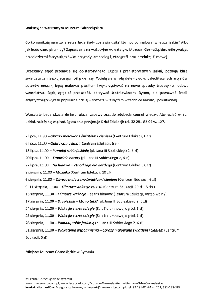 Wakacyjne warsztaty w Muzeum Górnośląskim Co komunikują nam zwierzęta? Jakie ślady zostawia dzik? Kto i po co malował wnętrza jaskiń? Albo jak budowano piramidy? Zapraszamy na wakacyjne warsztaty w Muzeum Górnośląskim, odkrywające przed dziećmi fascynujący świat przyrody, archeologii, etnografii oraz produkcji filmowej. Uczestnicy zajęć przeniosą się do starożytnego Egiptu i prehistorycznych jaskiń, poznają bliżej zwierzęta zamieszkujące górnośląskie lasy. Wcielą się w rolę detektywów, paleolitycznych artystów, autorów mozaik, będą malować piaskiem i wykorzystywać na nowe sposoby tradycyjne, ludowe wzornictwo. Będą zgłębiać przeszłość, odkrywać średniowieczny Bytom, ale i poznawać środki artystycznego wyrazu popularne dzisiaj – stworzą własny film w technice animacji poklatkowej. Warsztaty będą okazją do inspirującej zabawy oraz do zdobycia cennej wiedzy. Aby wziąć w nich udział, należy się zapisać. Zgłoszenia przyjmuje Dział Edukacji: tel. 32 281-82-94 w. 127. 2 lipca, 11.30 – Obrazy malowane światłem i cieniem (Centrum Edukacji, 6 zł) 6 lipca, 11.00 – Odkrywamy Egipt (Centrum Edukacji, 6 zł) 13 lipca, 11.00 – Pomaluj sobie jaskinię (pl. Jana III Sobieskiego 2, 6 zł) 20 lipca, 11.00 – Tropiciele natury (pl. Jana III Sobieskiego 2, 6 zł) 27 lipca, 11.00 – Na ludowo – etnodizajn dla każdego (Centrum Edukacji, 6 zł) 3 sierpnia, 11.00 – Mozaika (Centrum Edukacji, 10 zł) 6 sierpnia, 11.30 – Obrazy malowane światłem i cieniem (Centrum Edukacji, 6 zł) 9–11 sierpnia, 11.00 – Filmowe wakacje cz. I–III (Centrum Edukacji, 20 zł – 3 dni) 13 sierpnia, 11.30 – Filmowe wakacje – seans filmowy (Centrum Edukacji, wstęp wolny) 17 sierpnia, 11.00 – Drapieżnik – kto to taki? (pl. Jana III Sobieskiego 2, 6 zł) 24 sierpnia, 11.00 – Wakacje z archeologią (Sala Kolumnowa, ogród, 6 zł) 25 sierpnia, 11.00 – Wakacje z archeologią (Sala Kolumnowa, ogród, 6 zł) 26 sierpnia, 11.00 – Pomaluj sobie jaskinię (pl. Jana III Sobieskiego 2, 6 zł) 31 sierpnia, 11.00 – Wakacyjne wspomnienia – obrazy malowane światłem i cieniem (Centrum Edukacji, 6 zł) Miejsce: Muzeum Górnośląskie w Bytomiu Muzeum Górnośląskie w Bytomiu www.muzeum.bytom.pl, www.facebook.com/MuzeumGornoslaskie, twitter.com/MuzGornoslaskie Kontakt dla mediów: Małgorzata Iwanek, [email protected], tel. 32 281-82-94 w. 201, 531-153-189