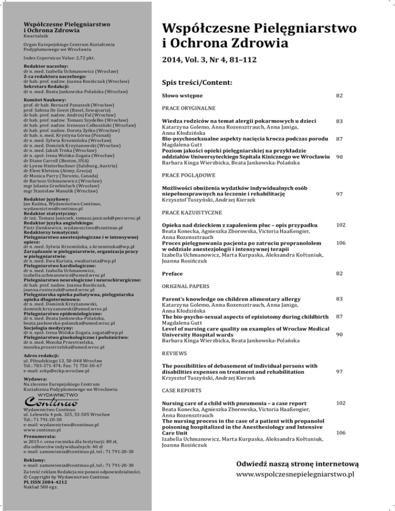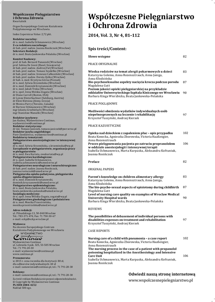 Współczesne Pielęgniarstwo i Ochrona Zdrowia Kwartalnik Organ Europejskiego Centrum Kształcenia Podyplomowego we Wrocławiu Index Copernicus Value: 2,72 pkt. Redaktor naczelny: dr n. med. Izabella Uchmanowicz (Wrocław) Z-ca redaktora naczelnego: dr hab. prof. nadzw. Joanna Rosińczuk (Wrocław) Sekretarz Redakcji: dr n. med. Beata Jankowska-Polańska (Wrocław) Komitet Naukowy: prof. dr hab. Bernard Panaszek (Wrocław) prof. Sabina De Geest (Basel, Szwajcaria) dr hab. prof. nadzw. Andrzej Fal (Wrocław) dr hab. prof. nadzw. Tomasz Szydełko (Wrocław) dr hab. prof. nadzw. Ireneusz Całkosiński (Wrocław) dr hab. prof. nadzw. Dorota Zyśko (Wrocław) dr hab. n. med. Krystyna Górna (Poznań) dr n. med. Sylwia Krzemińska (Wrocław) dr n. med. Dominik Krzyżanowski (Wrocław) dr n. med. Jakub Trnka (Wrocław) dr n. społ. Irena Wolska-Zogata (Wrocław) dr Diane Carroll (Boston, USA) dr Lynne Hinterbuchner (Salzburg, Austria) dr Eleni Kletsiou (Ateny, Grecja) dr Monica Parry (Toronto, Canada) dr Bartosz Uchmanowicz (Wrocław) mgr Jolanta Grzebieluch (Wrocław) mgr Stanisław Manulik (Wrocław) Redaktor językowy: Jan Kuźma, Wydawnictwo Continuo, [email protected] Redaktor statystyczny: dr inż. Tomasz Janiczek, [email protected] Redaktor języka angielskiego: Piotr Zienkiewicz, [email protected] Redaktorzy tematyczni: Pielęgniarstwo anestezjologiczne i w intensywnej opiece: dr n. med. Sylwia Krzemińska, [email protected] Zarządzanie w pielęgniarstwie, organizacja pracy w pielęgniarstwie: dr n. med. Ewa Kuriata, [email protected] Pielęgniarstwo kardiologiczne: dr n. med. Izabella Uchmanowicz, [email protected] Pielegniarstwo neurologiczne i neurochirurgiczne: dr hab. prof. nadzw. Joanna Rosińczuk, [email protected] Pielęgniarska opieka paliatywna, pielęgniarska opieka długoterminowa: dr n. med. Dominik Krzyżanowski, [email protected] Pielęgniarstwo epidemiologiczne: dr n. med. Beata Jankowska-Polańska, [email protected] Socjologia medycyny: dr n. społ. Irena Wolska-Zogata, [email protected] Pielęgniarstwo ginekologiczne i położnictwo: dr n. med. Monika Przestrzelska, [email protected] Adres redakcji: ul. Piłsudskiego 13, 50-048 Wrocław Tel.: 783-371-474; Fax: 71 750-30-67 e-mail: [email protected] Wydawca: Na zlecenie Europejskiego Centrum Kształcenia Podyplomowego we Wrocławiu Wydawnictwo Continuo ul. Lelewela 4 pok. 325, 53-505 Wrocław Tel.: 71 791-20-30 e-mail: [email protected] www.continuo.pl Prenumerata: w 2015 r. cena rocznika dla Instytucji: 80 zł, dla odbiorców indywidualnych: 40 zł e-mail: [email protected], tel.: 71 791-20-30 Reklamy: e-mail: [email protected], tel.: 71 791-20-30 Za treść reklam Redakcja nie ponosi odpowiedzialności. © Copyright by Wydawnictwo Continuo PL ISSN 2084-4212 Nakład 500 egz. Współczesne Pielęgniarstwo i Ochrona Zdrowia 2014, Vol. 3, Nr 4, 81–112 Spis treści/Content: 82 Słowo wstępne PRACE ORYGINALNE Wiedza rodziców na temat alergii pokarmowych u dzieci Katarzyna Golemo, Anna Rozensztrauch, Anna Janiga, Anna Kłodzińska Bio-psychoseksualne aspekty nacięcia krocza podczas porodu Magdalena Gutt Poziom jakości opieki pielęgniarskiej na przykładzie oddziałów Uniwersyteckiego Szpitala Kinicznego we Wrocławiu Barbara Kinga Wierzbicka, Beata Jankowska-Polańska 83 87 90 PRACE POGLĄDOWE Możliwości obniżenia wydatków indywidualnych osób niepełnosprawnych na leczenie i rehabilitację Krzysztof Tuszyński, Andrzej Kierzek 97 PRACE KAZUISTYCZNE Opieka nad dzieckiem z zapaleniem płuc – opis przypadku Beata Konecka, Agnieszka Zborowska, Victoria Haaßengier, Anna Rozensztrauch Proces pielęgnowania pacjenta po zatruciu propranololem w oddziale anestezjologii i intensywnej terapii Izabella Uchmanowicz, Marta Kurpaska, Aleksandra Kołtuniuk, Joanna Rosińczuk 102 Preface 82 106 ORIGINAL PAPERS Parent’s knowledge on children alimentary allergy Katarzyna Golemo, Anna Rozensztrauch, Anna Janiga, Anna Kłodzińska The bio-psycho-sexual aspects of episiotomy during childbirth Magdalena Gutt Level of nursing care quality on examples of Wroclaw Medical University Hospital wards Barbara Kinga Wierzbicka, Beata Jankowska-Polańska 83 87 90 REVIEWS The possibilities of debasement of individual persons with disabilities expenses on treatment and rehabilitation Krzysztof Tuszyński, Andrzej Kierzek 97 CASE REPORTS Nursing care of a child with pneumonia – a case report Beata Konecka, Agnieszka Zborowska, Victoria Haaßengier, Anna Rozensztrauch The nursing process in the case of a patient with propanolol poisoning hospitalized in the Anesthesiology and Intensive Care Unit Izabella Uchmanowicz, Marta Kurpaska, Aleksandra Kołtuniuk, Joanna Rosińczuk 102 106 Odwiedź naszą stronę internetową www.wspolczesnepielegniarstwo.pl SőĔĜĔ ĜĘęĻĕēĊ Mijają już trzy lata od momentu utworzenia kwartalnika „Współczesne Pielęgniarstwo i Ochrona Zdrowia” jako o icjalnego organu Europejskiego Centrum Kształcenia Podyplomowego we Wrocławiu. Tak jak zakładaliśmy w tym okresie w kwartalniku drukowane były prace oryginalne, poglądowe, kazuistyczne, prace studenckie i inne. Łącznie w okresie trzech lat opublikowanych zostało 27 prac oryginalnych, 17 poglądowych, 3 kazuistyczne, 13 prac studenckich, 1 z historii medycyny i artykuł redakcyjny. Zakładaliśmy, iż na łamach naszego kwartalnika będą obecne artykuły o różnej tematyce szeroko związanej z dziedzinami pielęgniarstwa, położnictwa, ochrony zdrowia, które prezentują nie tylko najistotniejsze problemy związane z tymi dziedzinami nauki, ale także będą prezentowały osiągnięcia pielęgniarek i położnych, a także autorów związanych z szeroko pojętą dziedziną nauk o zdrowiu w kontekście zachodzących zmian w tych dyscyplinach nauki. Myślę, że w tym okresie udało się osiągnąć zamierzony cel. Z satysfakcją informuję, że uruchomiliśmy stronę internetową czasopisma: http://www.wspolczesnepielegniarstwo.pl. Na stronie p