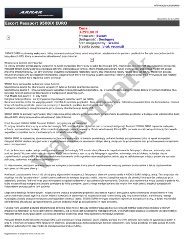 Informacje o produkcie Utworzono 03-03-2017 Escort Passport 9500iX EURO Cena : 3.299,00 zł Producent : Escort Dostępność : Dostępny Stan magazynowy : średni Średnia ocena : brak recenzji 9500iX EURO to pierwszy wykrywacz, który zapewnia pełną ochronę przed wszystkimi urządzeniami do pomiaru prędkości w Europie oraz jednocześnie bazę danych GPS, którą łatwo można aktualizować przez Internet. er m ar k Rewolucja w świecie antyradarów. To jedyny detektor przeznaczony wyłącznie na rynek europejski, który łączy w sobie technologię GPS, możliwości sieci Internet oraz sztucznej inteligencji. Passport 9500iX EURO zapewnia najlepszą ochronę, wprowadzając funkcje, które zrewolucjonizowały rynek wykrywaczy. Dodatkowo model ten został znacznie zmodyfikowany, tak aby wykrywał wszystkie europejskie fotoradary lasery oraz impulsowe radary ręczne takie jak ISKRA. Model ten posiada wbudowaną bazę GPS europejskich fotoradarów stacjonarnych które nie wysyłają wiązki radarowej i których wykrycie przez inne wykrywacze jest niestety niemożliwe. 9500iX Euro zapewnia 100% ochronę! 9500iX Euro wprowadza całkowicie nowe funkcje: Segmentacja pasma Ka skanowanie używanych tylko w Europie segmentów pasma. Segmentacja pasma K - filtracja fałszywych sygnałów z nowoczesnych tempomatów, np. w samochodach marki Mercedes-Benz z systemem Distronic Plus. Detekcja nowych pistoletów laserowych w europejskich specyfikacjach. Tryb Miasto bez pasm K i X City NoXK Odrębna funkcja KPulse - do wykrywania impulsowych radarów takich jak ISKRA. Baza fotoradarów, które nie wysyłają wiązki mikrofal do pomiaru prędkości . Baza obejmuje całą Europę. Oddzielne powiadomienia dla Fotoradarów, bramek liczących średnią prędkość, kamer na czerwonych światłach, punktów kontroli prędkości i innych. Możliwość aktualizacji oprogramowania przy pomocy standardowego kabla USB. 9500iX EURO to pierwszy wykrywacz, który zapewnia pełną ochronę przed wszystkimi urządzeniami do pomiaru prędkości w Europie oraz jednocześnie bazę danych GPS, którą łatwo można aktualizować przez Internet. Ecort Passport 9500iX EURO Passport 9500iX - przygotuj się na rewolucję! To jedyny detektor który łączy w sobie technologię GPS, możliwości sieci Internet oraz sztucznej inteligencji. Passport 9500iX EURO zapewnia najlepszą ochronę, wprowadzając funkcje, które zrewolucjonizowały rynek wykrywaczy. Dzięki wbudowanej filtracji GPS, pozwala na całkowitą eliminację fałszywych sygnałów z czujników ruchu montowanych na drzwiach automatycznych. at 9500iX EURO to najbardziej zaawansowany technicznie wykrywacz na świecie posiadający unikalne funkcje przygotowane tylko na rynek europejski. Passport 9500iX dostarczany jest wraz z ekskluzywnym aluminiowym neseserem obitym skórą, służącym do przenoszenia oraz przechowywania urządzenia wraz z akcesoriami. w Funkcja AutoLearn wykorzystuje naszą opatentowaną technologię GPS w celu identyfikowania i wyeliminowania fałszywych alarmów, automatycznie podczas jazdy! W przeciwieństwie do modelu 9500i, teraz detektor sam uczy się fałszywych sygnałów, automatycznie je blokując opierając się na częstotliwości i pozycji GPS. Dzięki możliwości monitorowania do 8 sygnałów radarowych jednocześnie, gdy w zablokowanym miejscu pojawi się np radar policyjny, zostaniesz natychmiast powiadomiony! To niesamowite, ale Escort znalazł przepis na wykrywacz doskonały, który potrafi wyeliminować wieczny problem producentów a także użytkowników wykrywaczy! fałszywe alarmy! Możliwość zastosowania innych niż do tej pory algorytmów interpretacji fałszywych alarmów zaowocowały w 9500iX EURO kolejną zaletą. Ten antyradar nie musi być na siłę "przytłumiany", dzięki czemu znakomicie wykrywa sygnały z odbić. Jest to szczególnie ważne dla detekcji fotoradarów, zwłaszcza przy ustawieniu pomiaru "od tyłu" oraz przy wykrywaniu urządzeń radarowych zza zakrętu lub wzniesienia. Cecha ta, plus wyśmienita wręcz czułość w paśmie Ka, które w specyfikacji europejskiej zostało zawężone do kilku zakresów, czyni z niego niedościgniony dla innych firm wzór jakości detekcji europejskich Fotoradarów pracujących w tym paśmie! Ulepszona detekcja fal laserowych - wiązka lasera służąca do pomiaru prędkości jest bardzo wąska i precyzyjna, tylko skierowana bezpośrednio w Twój samochód może zostać wykryta. Escort 9500iX EURO jest w stanie wykryć wiązkę laserową nawet wtedy gdy inny samochód jest namierzany. Wersja europejska została znacznie ulepszona pod względem detekcji lasera, 9500iX EURO wykrywa wszystkie najnowsze europejskie lasery, a dzięki możliwości samodzielnej aktualizacji oprogramowania, zawsze będziesz mógł go zaktualizować w razie potrzeby. Funkcja Mark Location pozwala programować dowolną ilość miejsc, tak aby detektor powiadamiał Cię kilkaset metrów wcześniej o miejscu w którym znajduje się fotoradar, w miejscach kontroli prędkości, lub w miejscach szczególnie niebezpiecznych, w których nagle pojawia się znaczne jej ograniczenie, Passport 9500iX EURO powiadomi Cię kilkaset metrów wcześniej, abyś mógł spokojnie zmniejszyć prędkość. Passport 9500iX EURO dzięki technologii GPS stale monitoruje Twoją prędkość, jeżeli jedziesz poniżej 45 km/h detektor sam wyłącza sygnalizację pasm X oraz K, w których występuje 95% fałszywych alarmów, powiadamiając tylko podwójnym krótkim dźwiękiem. Gdy Twoja prędkośc wzrasta ponad 45 km/h detektor automatycznie przechodzi do maksymalnego trybu czułości. Wygenerowano w programie www.oscGold.com Aktualizowana baza GPS pozwala nam na pełną ochronę przed bramkami, które mierzą średnią prędkość na wyznaczonych odcinkach, zawiera również lokalizację kamer na czerwonych światłach, punktów kontroli prędkości i innych. Samodzielnie możesz wybrać , które punkty mają być sygn