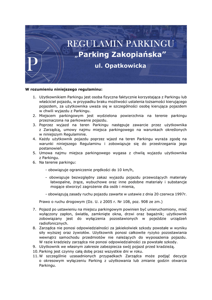 Regulaminu Parkingu Strzeżonego Zakopiańska