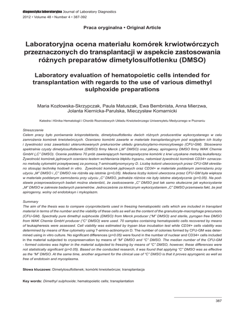 diagnostyka laboratoryjna Journal of Laboratory Diagnostics 2012 • Volume 48 • Number 4 • 387-392 Praca oryginalna • Original Article Laboratoryjna ocena materiału komórek krwiotwórczych przeznaczonych do transplantacji w aspekcie zastosowania różnych preparatów dimetylosulfotlenku (DMSO) Laboratory evaluation of hematopoietic cells intended for transplantation with regards to the use of various dimethyl sulphoxide preparations Maria Kozłowska-Skrzypczak, Paula Matuszak, Ewa Bembnista, Anna Mierzwa, Jolanta Kiernicka-Parulska, Mieczysław Komarnicki Katedra i Klinika Hematologii i Chorób Rozrostowych Układu Krwiotwórczego Uniwersytetu Medycznego w Poznaniu Streszczenie Celem pracy było porównanie krioprotektanta, dimetylosulfotlenku dwóch różnych producentów wykorzystanego w celu zamrożenia komórek krwiotwórczych. Oceniano komórki zawarte w materiale transplantacyjnym pod względem ich liczby i żywotności oraz zawartości ukierunkowanych prekursorów układu granulocytarno-monocytowego (CFU-GM). Stosowano spektralnie czysty dimetylosulfotlenek (DMSO) firmy Merck („M” DMSO) oraz jałowy, apirogenny DMSO firmy WAK Chemie GmbH („C” DMSO). Ocenie poddano 70 prób zawierających hematopoetyczne komórki z krwi uzyskane metodą leukaferezy. Żywotność komórek jądrowych oceniano testem wchłaniania błękitu trypanu, natomiast żywotność komórek CD34+ oznaczano metodą cytometrii przepływowej za pomocą 7-aminoaktynomycyny D. Liczbę kolonii utworzonych przez CFU-GM określano stosując technikę hodowli in vitro. Żywotność komórek jądrowych oraz CD34+ w materiale poddanym zamrażaniu przy użyciu „M” DMSO i „C” DMSO nie różniła się istotnie (p>0,05). Mediana liczby kolonii utworzona przez CFU-GM była większa w materiale poddanym zamrożeniu przy użyciu „C” DMSO, jednakże różnice nie były istotne statystycznie (p>0,05). Na podstawie przeprowadzonych badań można stwierdzić, że zastosowanie „C” DMSO jest tak samo skuteczne jak wykorzystanie „M” DMSO w zakresie badanych parametrów. Jednocześnie za klinicznym wykorzystaniem „C” DMSO przemawia fakt, że jest apirogenny, wolny od endotoksyn i mykoplazm. Summary The aim of the thesis was to compare cryoprotectants used in freezing hematopoietic cells which are included in transplant material in terms of the number and the viability of these cells as well as the content of the granulocyte-macrophage precursors (CFU-GM). Spectrally pure dimethyl sulphoxide (DMSO) from Merck producer (“M” DMSO) and sterile, pyrogen free DMSO from WAK Chemie GmbH producer (“C” DMSO) were used. 70 samples containing hematopoietic cells recovered by means of leukapheresis were assessed. Cell viability was estimated by trypan blue incubation test while CD34+ cells viability was determined by means of flow cytometry using 7-amino-actinomycin D. The number of colonies formed by CFU-GM was determined using in vitro culture. No significant differences (p>0.05) were found in the number of nuclear and CD34+ cells included in the material subjected to cryopreservation by means of “M” DMSO and “C” DMSO. The median number of the CFU-GM - formed colonies was higher in the material subjected to freezing by means of “C” DMSO, however, these differences were not statistically significant (p>0.05). Based on the conducted research, it was found that applying “C” DMSO was as effective as the “M” DMSO. At the same time, another argument for the clinical use of “C” DMSO is that it proves apyrogenic as well as free of endotoxin and mycoplasma. Słowa kluczowe:Dimetylosulfotlenek; komórki krwiotwórcze; transplantacja Key words:Dimethyl sulphoxide; hematopoietic cells; transplantation 387 Laboratoryjna ocena materiału komórek krwiotwórczych przeznaczonych do transplantacji w aspekcie zastosowania ... Wstęp Transplantacja krwiotwórczych komórek macierzystych stanowi uznaną metodę leczenia wielu chorób nowotworowych oraz nienowotworowych. W przypadku przeszczepień własnych komórek konieczne jest przechowywanie materiału do czasu transplantacji. W tym celu standardowo stosuje się metodę zamrażania. Technika ta znalazła zastosowanie w przypadku wszystkich transplantacji komórek autologicznych, pozyskiwanych z krwi obwodowej oraz szpiku [1]. Zamrażanie krwiotwórczych komórek macierzystych niesie ze sobą ryzyko uszkodzenia komórek spowodowane bezpośrednim wpływem niskiej temperatury sięgającej -1960C. Dlatego niezbędne jest użycie środków krioprotekcyjnych, które znacznie zmniejszają proces tworzenia zewnątrzi wewnątrzkomórkowych kryształów lodu oraz dehydratację komórek [2, 3, 4]. Jednym z nich jest dimetylosulfotlenek (DMSO) stosowany w różnym stężeniu, najczęściej 10% [5]. DMSO posiada zdolność przenikania przez błonę komórkową. Należy do krioprotektantów penetrujących. Po wniknięciu do komórki DMSO doprowadza do wyrównania gradientu osmotycznego, a także utrzymuje stabilne wewnątrzkomórkowe stężenie soli i pH [6]. Osmolalność 10% roztworu DMSO wynosi 1,4 osmoli, preparaty krwiotwórczych komórek macierzystych mają 270-300 miliosmoli, dlatego po dodaniu DMSO komórki ulegają gwałtownemu odwodnieniu. To działanie ma na celu wyrównanie różnicy osmolalności między środowiskiem wewnątrz- i zewnątrzkomórkowym [7]. Ze względu na dużą wrażliwość komórek po rozmrożeniu, DMSO może doprowadzić do ich lizy. Redukcji w ten sposób ulega liczba komórek oraz w dużym stopniu powoduje to istotne zmniejszenie żywotności komórek mniej i bardziej dojrzałych. Poza działaniem krioochronnym DMSO wpływa toksycznie na komórki. Ścisłe przestrzeganie procedury przygotowania i rozmrażania preparatów przeznaczonych do przeszczepienia ogranicza niekorzystne skutki działania DMSO [8]. Toksyczność DMSO rośnie wraz ze wzrostem temperatury, dlatego ważne jest, aby preparat po rozmrożeniu był jak najs