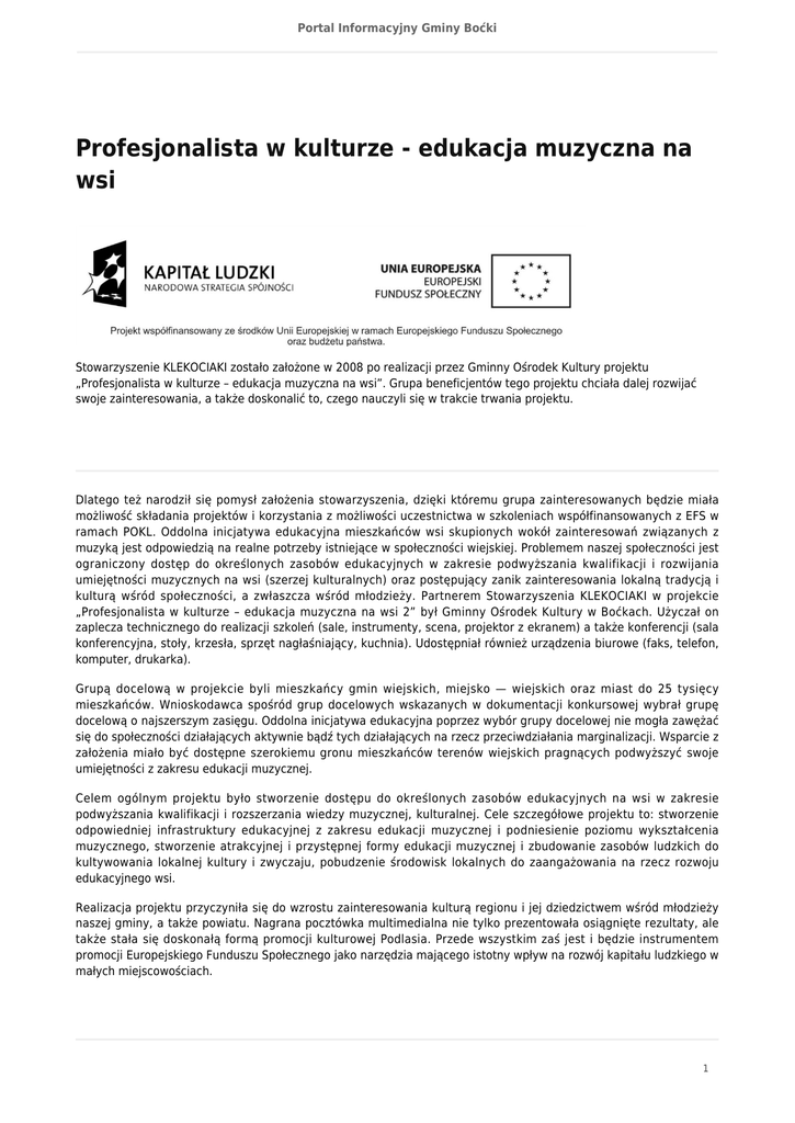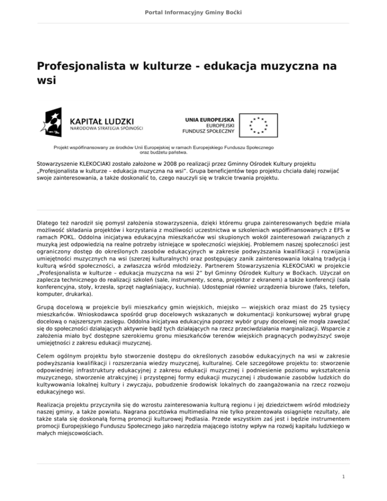 Portal Informacyjny Gminy Boćki Profesjonalista w kulturze - edukacja muzyczna na wsi Stowarzyszenie KLEKOCIAKI zostało założone w 2008 po realizacji przez Gminny Ośrodek Kultury projektu „Profesjonalista w kulturze – edukacja muzyczna na wsi”. Grupa beneficjentów tego projektu chciała dalej rozwijać swoje zainteresowania, a także doskonalić to, czego nauczyli się w trakcie trwania projektu. Dlatego też narodził się pomysł założenia stowarzyszenia, dzięki któremu grupa zainteresowanych będzie miała możliwość składania projektów i korzystania z możliwości uczestnictwa w szkoleniach współfinansowanych z EFS w ramach POKL. Oddolna inicjatywa edukacyjna mieszkańców wsi skupionych wokół zainteresowań związanych z muzyką jest odpowiedzią na realne potrzeby istniejące w społeczności wiejskiej. Problemem naszej społeczności jest ograniczony dostęp do określonych zasobów edukacyjnych w zakresie podwyższania kwalifikacji i rozwijania umiejętności muzycznych na wsi (szerzej kulturalnych) oraz postępujący zanik zainteresowania lokalną tradycją i kulturą wśród społeczności, a zwłaszcza wśród młodzieży. Partnerem Stowarzyszenia KLEKOCIAKI w projekcie „Profesjonalista w kulturze – edukacja muzyczna na wsi 2” był Gminny Ośrodek Kultury w Boćkach. Użyczał on zaplecza technicznego do realizacji szkoleń (sale, instrumenty, scena, projektor z ekranem) a także konferencji (sala konferencyjna, stoły, krzesła, sprzęt nagłaśniający, kuchnia). Udostępniał również urządzenia biurowe (faks, telefon, komputer, drukarka). Grupą docelową w projekcie byli mieszkańcy gmin wiejskich, miejsko — wiejskich oraz miast do 25 tysięcy mieszkańców. Wnioskodawca spośród grup docelowych wskazanych w dokumentacji konkursowej wybrał grupę docelową o najszerszym zasięgu. Oddolna inicjatywa edukacyjna poprzez wybór grupy docelowej nie mogła zawężać się do społeczności działających aktywnie bądź tych działających na rzecz przeciwdziałania marginalizacji. Wsparcie z założenia miało być dostępne szerokiemu gronu mieszkańców terenów wiejskich pragnących podwyższyć swoje umiejętności z zakresu edukacji muzycznej. Celem ogólnym projektu było stworzenie dostępu do określonych zasobów edukacyjnych na wsi w zakresie podwyższania kwalifikacji i rozszerzania wiedzy muzycznej, kulturalnej. Cele szczegółowe projektu to: stworzenie odpowiedniej infrastruktury edukacyjnej z zakresu edukacji muzycznej i podniesienie poziomu wykształcenia muzycznego, stworzenie atrakcyjnej i przystępnej formy edukacji muzycznej i zbudowanie zasobów ludzkich do kultywowania lokalnej kultury i zwyczaju, pobudzenie środowisk lokalnych do zaangażowania na rzecz rozwoju edukacyjnego wsi. Realizacja projektu przyczyniła się do wzrostu zainteresowania kulturą regionu i jej dziedzictwem wśród młodzieży naszej gminy, a także powiatu. Nagrana pocztówka multimedialna nie tylko prezentowała osiągnięte rezultaty, ale także stała się doskonałą formą promocji kulturowej Podlasia. Przede wszystkim zaś jest i będzie instrumentem promocji Europejskiego Funduszu Społecznego jako narzędzia mającego istotny wpływ na rozwój kapitału ludzkiego w małych miejscowościach. 1