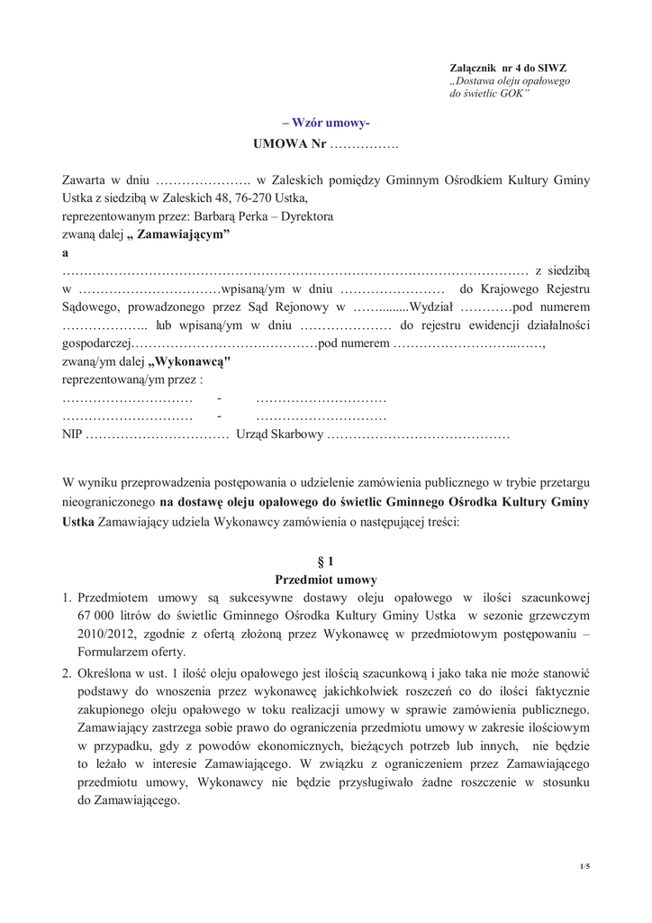 Załącznik nr 4 do SIWZ „Dostawa oleju opałowego do świetlic GOK” – Wzór umowyUMOWA Nr ……………. Zawarta w dniu …………………. w Zaleskich pomiędzy Gminnym Ośrodkiem Kultury Gminy Ustka z siedzibą w Zaleskich 48, 76-270 Ustka, reprezentowanym przez: Barbarą Perka – Dyrektora zwaną dalej „ Zamawiającym” a ……………………………………………………………………………………………… z siedzibą w ……………………………wpisaną/ym w dniu …………………… do Krajowego Rejestru Sądowego, prowadzonego przez Sąd Rejonowy w …….........Wydział …………pod numerem ……………….. lub wpisaną/ym w dniu ………………… do rejestru ewidencji działalności gospodarczej………………………….…………pod numerem ………………………..……, zwaną/ym dalej „Wykonawcą" reprezentowaną/ym przez : ………………………… ………………………… ………………………… ………………………… NIP …………………………… Urząd Skarbowy …………………………………… W wyniku przeprowadzenia postępowania o udzielenie zamówienia publicznego w trybie przetargu nieograniczonego na dostawę oleju opałowego do świetlic Gminnego Ośrodka Kultury Gminy Ustka Zamawiający udziela Wykonawcy zamówienia o następującej treści: §1 Przedmiot umowy 1. Przedmiotem umowy są sukcesywne dostawy oleju opałowego w ilości szacunkowej 67 000 litrów do świetlic Gminnego Ośrodka Kultury Gminy Ustka w sezonie grzewczym 2010/2012, zgodnie z ofertą złoŜoną przez Wykonawcę w przedmiotowym postępowaniu – Formularzem oferty. 2. Określona w ust. 1 ilość oleju opałowego jest ilością szacunkową i jako taka nie moŜe stanowić podstawy do wnoszenia przez wykonawcę jakichkolwiek roszczeń co do ilości faktycznie zakupionego oleju opałowego w toku realizacji umowy w sprawie zamówienia publicznego. Zamawiający zastrzega sobie prawo do ograniczenia przedmiotu umowy w zakresie ilościowym w przypadku, gdy z powodów ekonomicznych, bieŜących potrzeb lub innych, nie będzie to leŜało w interesie Zamawiającego. W związku z ograniczeniem przez Zamawiającego przedmiotu umowy, Wykonawcy nie będzie przysługiwało Ŝadne roszczenie w stosunku do Zamawiającego. 1/5 3. Wykonawca zobowiązuje się do dostarczania oleju opałowego zgodnego z obowiązującą normą jakościową PN-C-96024:L1 oraz spełniającego wymagania zawarte w Rozporządzeniu Ministra Gospodarki z dnia 9 grudnia 2008 r. w sprawie wymagań jakościowych dla paliw ciekłych (Dz. U. z 2008 r. nr 221, poz. 1441 z późn. zm.). 4. Podczas kaŜdorazowej dostawy Wykonawca będzie zobowiązany przedstawić atest jakościowy dostarczanego oleju opałowego. 5. Specyfikacja istotnych warunków zamówienia oraz Formularz ofertowy, będący elementem oferty Wykonawcy, stanowią integralną część umowy. §2 Termin realizacji Wykonawca dostarczy przedmiot umowy w terminie od podpisania umowy do dnia 30 maja 2012 roku. §3 Osoby odpowiedzialne za realizację 1. Osobą odpowiedzialną za prawidłową realizację przedmiotu zamówienia jest: 1) ze strony Zamawiającego: Barbara Perka 2) ze strony Wykonawcy: …………………………….. §4 Sposoby i miejsce realizacji dostaw 1. Wykonawca zobowiązuje się dostarczać przedmiot umowy sukcesywnie, przez okres trwania umowy do wskazanych zbiorników w świetlicach Gminnego Ośrodkach Kultury Gminy Ustka mieszczących się w miejscowościach: 1) Zaleskie, 2) Objazda, 3) Charnowo, 4) Rowy, 5) Pęplino, 6) Wytowno, 7) Gąbino w terminie 2 dni roboczych licząc od daty złoŜenia zamówienia (faxem) przez Zamawiającego. 2. Wykonawca odpowiada za zgodną z prawem i warunkami bezpieczeństwa realizację dostaw oleju opałowego. 3. Wielkość, termin i miejsce kaŜdorazowej dostawy Zamawiający określi według bieŜących potrzeb przesyłając Wykonawcy zamówienie faxem na nr ………………………….., z tym Ŝe wielkość kaŜdorazowej dostawy nie będzie mniejsza niŜ 200 litrów oleju. 4. Dostawa towarów następować będzie transportem Wykonawcy, na jego koszt i ryzyko do wskazanych miejsc Zamawiającego, o których mowa w ust. 1. 5. Podczas kaŜdorazowej dostawy Wykonawca zobowiązany jest dostarczyć atest jakościowy 2/5 dostarczonego oleju opałowego. Brak atestu stanowi podstawę do odmowy przyjęcia towaru. 6. Dowodem zrealizowania kaŜdorazowej dostawy będzie pisemne potwierdzenie przyjęcia towaru przez upowaŜnionego pracownika Zamawiającego, dokonującego odbioru dostawy po sprawdzeniu ilości i jakości towaru. 7. W przypadku stwierdzenia braków lub wad w dostarczanym towarze, Zamawiający zastrzega sobie prawo do dokonania przez Wykonawcę uzupełnienia lub wymiany towaru na wolny od wad. 8. W przypadku towaru niezgodnego z obowiązującą normą lub złoŜoną ofertą Zamawiającemu przysługuje prawo do odmowy przyjęcia towaru. §5 Odpowiedzialność Wykonawcy z tytułu jakości dostaw 1. W przypadku zastrzeŜeń co do jakości dostarczonego oleju opałowego Zamawiający powiadomi o powyŜszym fakcie Wykonawcę i w obecności jego przedstawiciela pobrane zostaną próbki zakwestionowanej dostawy oleju opałowego, w celu poddania ich badaniom w niezaleŜnym laboratorium badawczym. 2. W przypadku potwierdzenia przez laboratorium badawcze zastrzeŜeń Zamawiającego co do jakości oleju opałowego, Wykonawca dostarczy olej opałowy o właściwych parametrach technicznych w ilości, co do której zakwestionowano dostawę. Dodatkowo Wykonawca obciąŜony zostanie kosztami badania próbek, kosztami usuwania awarii urządzeń lub kosztami ich wymiany, jeŜeli zastosowany olej opałowy niespełniający wymogów jakościowych spowodował ich uszkodzenie lub zniszczenie. §6 Cena przedmiotu umowy, wynagrodzenie i warunki płatności 1. Szacunkowa wartość umowy wynosi, zgodnie z ofertą Wykonawcy złoŜoną 