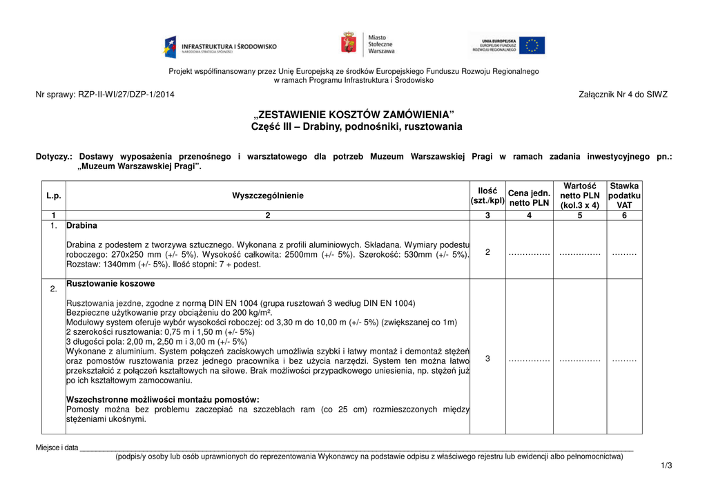 Projekt współfinansowany przez Unię Europejską ze środków Europejskiego Funduszu Rozwoju Regionalnego w ramach Programu Infrastruktura i Środowisko Nr sprawy: RZP-II-WI/27/DZP-1/2014 Załącznik Nr 4 do SIWZ „ZESTAWIENIE KOSZTÓW ZAMÓWIENIA” Część III – Drabiny, podnośniki, rusztowania Dotyczy.: Dostawy wyposażenia przenośnego i warsztatowego dla potrzeb Muzeum Warszawskiej Pragi w ramach zadania inwestycyjnego pn.: „Muzeum Warszawskiej Pragi”. Wyszczególnienie L.p. 1 1. 2 Wartość netto PLN (kol.3 x 4) 5 Stawka podatku VAT 6 Drabina Drabina z podestem z tworzywa sztucznego. Wykonana z profili aluminiowych. Składana. Wymiary podestu roboczego: 270x250 mm (+/- 5%). Wysokość całkowita: 2500mm (+/- 5%). Szerokość: 530mm (+/- 5%). Rozstaw: 1340mm (+/- 5%). Ilość stopni: 7 + podest. 2. Ilość Cena jedn. (szt./kpl) netto PLN 3 4 2 …………… …………… ……… 3 …………… …………… ……… Rusztowanie koszowe Rusztowania jezdne, zgodne z normą DIN EN 1004 (grupa rusztowań 3 według DIN EN 1004) Bezpieczne użytkowanie przy obciążeniu do 200 kg/m². Modułowy system oferuje wybór wysokości roboczej: od 3,30 m do 10,00 m (+/- 5%) (zwiększanej co 1m) 2 szerokości rusztowania: 0,75 m i 1,50 m (+/- 5%) 3 długości pola: 2,00 m, 2,50 m i 3,00 m (+/- 5%) Wykonane z aluminium. System połączeń zaciskowych umożliwia szybki i łatwy montaż i demontaż stężeń oraz pomostów rusztowania przez jednego pracownika i bez użycia narzędzi. System ten można łatwo przekształcić z połączeń kształtowych na siłowe. Brak możliwości przypadkowego uniesienia, np. stężeń już po ich kształtowym zamocowaniu. Wszechstronne możliwości montażu pomostów: Pomosty można bez problemu zaczepiać na szczeblach ram (co 25 cm) rozmieszczonych między stężeniami ukośnymi. Miejsce i data ____________________________________________________________________________________________________________________________________________ (podpis/y osoby lub osób uprawnionych do reprezentowania Wykonawcy na podstawie odpisu z właściwego rejestru lub ewidencji albo pełnomocnictwa) 1/3 Nr sprawy: RZP-II-WI/27/DZP-1/2014 Załącznik Nr 4 do SIWZ Stabilizator teleskopowy z wbudowanym elementem przesuwnym: Jednoczęściowy element przesuwny umożliwia łatwe przesuwanie zmontowanego rusztowania jezdnego na stabilizatorze. Zamknięte profile o kształcie tunelu zastosowane do ram pionowych. Ujednolicone punkty mocowania umożliwiają prosty montaż elementów rusztowania w różnych pozycjach. Rolki jezdne ø 200 mm (+/- 5%) z regulacją wysokości, umożliwiającą kompensowanie nierówności podłoża. Rolki są wyposażone w mechanizm blokujący (funkcja hamowania). 3. Aluminiowa drabinka biblioteczna Drabinka obustronna, z zabezpieczeniem przed nadmiernym rozłożeniem, antypoślizgowe nóżki. Składana o niskiej wadze. Parametry: ilość szczebli (łącznie z podestem): 3szt., wysokość maksymalna: 0,61m (+/5%), wysokość zasięgu podestu: 2,70m (+/- 5%), waga: max 2,50kg 4. …………… …………… ……… 3 …………… …………… ……… 1 …………… …………… ……… Drabina rozstawno-przystawna 3x7 Aluminiowa, trzyczęściowa drabina do zastosowania jako: drabina przystawna, trzyczęściowa drabina rozsuwana, rozsuwana jako trzyczęściowa drabina wolnostojąca. Stabilizator u podstawy zwiększa powierzchnię podparcia Wymiar stabilizatora: 681 mm (+/- 5%); Wymiar podłużnicy: 61,5 mm x 20 mm (+/- 5%), grubość: 1,25 mm (+/- 5%) Posiada certyfikat EN 131. Wysokość drabiny - 1,95 m (+/- 5%) Wysokość drabiny po rozłożeniu w literę "A" - 1,85 m (+/- 5%) Wysokość drabiny po rozłożeniu w literę "A" i wysuniętym trzecim elementem - 2,95 m (+/- 5%) Wysokość drabiny po wysunięciu trzech elementów - 4,20 m (+/- 5%) Max. wysokość robocza - 5,40 m (+/- 5%) Waga – max 10,3 kg. 5. 1 Podnośnik koszowy Zastosowanie: do prac wewnątrz pomieszczeń lub na równym utwardzonym terenie. Platforma podnosi się tylko w pionie, dodatkowy wysięg boczny można uzyskać poprzez wysunięcie ruchomej części pomostu na maksymalną długość do 90cm. Dane techniczne: wysokość robocza: 8,1m (+/- 5%) wysokość platformy: 6,1m (+/- 5%) wymiary platformy: 2,26m x 0,81m (+/- 5%) dodatkowo wysuwany pomost: max 90cm Miejsce i data ____________________________________________________________________________________________________________________________________________ (podpis/y osoby lub osób uprawnionych do reprezentowania Wykonawcy na podstawie odpisu z właściwego rejestru lub ewidencji albo pełnomocnictwa) 2/3 Nr sprawy: RZP-II-WI/27/DZP-1/2014 Załącznik Nr 4 do SIWZ maksymalny udźwig: 360kg szerokość transportowa: 0,82m (+/- 5%) długość transportowa: 2,44m (+/- 5%) wysokość transportowa: 2,13m (+/- 5%) wysokość przy złożonych barierkach: 1,75m (+/- 5%) zasilanie: akumulatory ciężar: 1560kg (+/- 5%) ogumienie: białe niebrudzące Razem netto Kwota podatku VAT Razem brutto Miejsce i data ____________________________________________________________________________________________________________________________________________ (podpis/y osoby lub osób uprawnionych do reprezentowania Wykonawcy na podstawie odpisu z właściwego rejestru lub ewidencji albo pełnomocnictwa) 3/3