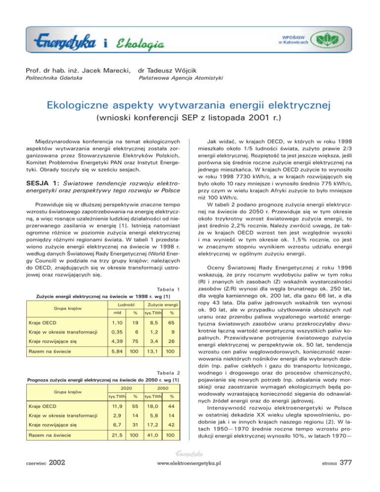 Prof. dr hab. in¿. Jacek Marecki, dr Tadeusz Wójcik Politechnika Gdañska Pañstwowa Agencja Atomistyki Ekologiczne aspekty wytwarzania energii elektrycznej (wnioski konferencji SEP z listopada 2001 r.) Miêdzynarodowa konferencja na temat ekologicznych aspektów wytwarzania energii elektrycznej zosta³a zorganizowana przez Stowarzyszenie Elektryków Polskich, Komitet Problemów Energetyki PAN oraz Instytut Energetyki. Obrady toczy³y siê w szeciu sesjach. SESJA 1: wiatowe tendencje rozwoju elektro- energetyki oraz perspektywy tego rozwoju w Polsce Przewiduje siê w d³u¿szej perspektywie znaczne tempo wzrostu wiatowego zapotrzebowania na energiê elektryczn¹, a wiêc rosn¹ce uzale¿nienie ludzkiej dzia³alnoci od nieprzerwanego zasilania w energiê [1]. Istniej¹ natomiast ogromne ró¿nice w poziomie zu¿ycia energii elektrycznej pomiêdzy ró¿nymi regionami wiata. W tabeli 1 przedstawiono zu¿ycie energii elektrycznej na wiecie w 1998 r. wed³ug danych wiatowej Rady Energetycznej (World Energy Council) w podziale na trzy grupy krajów: nale¿¹cych do OECD, znajduj¹cych siê w okresie transformacji ustrojowej oraz rozwijaj¹cych siê. Tabela 1 Zu¿ycie energii elektrycznej na wiecie w 1998 r. wg [1] Grupa krajów Zu¿ycie energii Ludnoæ mld % tys.TWh % Kraje OECD 1,10 19 8,5 65 Kraje w okresie transformacji 0,35 6 1,2 9 Kraje rozwijaj¹ce siê 4,39 75 3,4 26 Razem na wiecie 5,84 100 13,1 100 Tabela 2 Prognoza zu¿ycia energii elektrycznej na wiecie do 2050 r. wg [1] Grupa krajów 2020 2050 tys.TWh % tys.TWh % Kraje OECD 11,9 55 18,0 44 Kraje w okresie transformacji 2,9 14 5,8 14 Kraje rozwijaj¹ce siê 6,7 31 17,2 42 Razem na wiecie 21,5 100 41,0 100 czerwiec 2002 Jak widaæ, w krajach OECD, w których w roku 1998 mieszka³o oko³o 1/5 ludnoci wiata, zu¿yto prawie 2/3 energii elektrycznej. Rozpiêtoæ ta jest jeszcze wiêksza, jeli porówna siê rednie roczne zu¿ycie energii elektrycznej na jednego mieszkañca. W krajach OECD zu¿ycie to wynosi³o w roku 1998 7730 kWh/c, a w krajach rozwijaj¹cych siê by³o oko³o 10 razy mniejsze i wynosi³o rednio 775 kWh/c, przy czym w wielu krajach Afryki zu¿ycie to by³o mniejsze ni¿ 100 kWh/c. W tabeli 2 podano prognozê zu¿ycia energii elektrycznej na wiecie do 2050 r. Przewiduje siê w tym okresie oko³o trzykrotny wzrost wiatowego zu¿ycia energii, to jest rednio 2,2% rocznie. Nale¿y zwróciæ uwagê, ¿e tak¿e w krajach OECD wzrost ten jest wzglêdnie wysoki i ma wynieæ w tym okresie ok. 1,5% rocznie, co jest w znacznym stopniu wynikiem wzrostu udzia³u energii elektrycznej w ogólnym zu¿yciu energii. Oceny wiatowej Rady Energetycznej z roku 1996 wskazuj¹, ¿e przy rocznym wydobyciu paliw w tym roku (R) i znanych ich zasobach (Z) wskanik wystarczalnoci zasobów (Z/R) wynosi dla wêgla brunatnego ok. 250 lat, dla wêgla kamiennego ok. 200 lat, dla gazu 66 lat, a dla ropy 43 lata. Dla paliw j¹drowych wskanik ten wynosi ok. 90 lat, ale w przypadku u¿ytkowania ubo¿szych rud uranu oraz przerobu paliwa wypalonego wartoæ energetyczna wiatowych zasobów uranu przekroczy³aby dwukrotnie ³¹czn¹ wartoæ energetyczn¹ wszystkich paliw kopalnych. Przewidywane potrojenie wiatowego zu¿ycia energii elektrycznej w perspektywie ok. 50 lat, tendencja wzrostu cen paliw wêglowodorowych, koniecznoæ rezerwowania niektórych noników energii dla wybranych dziedzin (np. paliw ciek³ych i gazu do transportu lotniczego, wodnego i drogowego oraz do procesów chemicznych), pojawianie siê nowych potrzeb (np. odsalania wody morskiej) oraz zaostrzanie wymagañ ekologicznych bêd¹ powodowa³y wzrastaj¹c¹ koniecznoæ siêgania do odnawialnych róde³ energii oraz do energii j¹drowej. Intensywnoæ rozwoju elektroenergetyki w Polsce w ostatniej dekadzie XX wieku uleg³a spowolnieniu, podobnie jak i w innych krajach naszego regionu [2]. W latach 19501970 rednie roczne tempo wzrostu produkcji energii elektrycznej wynosi³o 10%, w latach 1970 www.elektroenergetyka.pl strona 377 1990 3,8%, a w latach 19901999 tylko 0,5%. rednia iloæ wytworzonej energii elektrycznej na mieszkañca Polski w roku 1999 wynosi³a 3660 kWh. W prognozach dla lat 20002020, dokonanych z zasady wariantowo, przy ró¿nej stopie wzrostu produktu krajowego brutto (PKB), zak³adano roczne tempo wzrostu produkcji energii elektrycznej w granicach 1,03,5%. W przedstawionej na konferencji autorskiej prognozie J. Mareckiego [2] rednie roczne tempo wzrostu produkcji energii elektrycznej w okresie 20002020 wynosi 2,22,9% (wariant niski i wysoki), co odpowiada produkcji na mieszkañca w roku 2020 od 5600 do 6400 kWh. Stanowi to 72 82% poziomu krajów UE w roku 1998. Warunki ekonomiczne powoduj¹, ¿e w rozwa¿anej perspektywie, w odró¿nieniu od krajów UE, iloæ energii elektrycznej wytwarzanej z wêgla kamiennego i brunatnego pozostaje w obydwu rozwa¿anych wariantach na poziomie zbli¿onym do wystêpuj¹cego w roku 2000. Procentowy udzia³ wêgla kamiennego i brunatnego w produkcji energii elektrycznej maleje z 61 i 36% w roku 2000 do 43 i 25% w wariancie niskim oraz 35 i 22% w wariancie wysokim w roku 2020. Mimo zak³adanego istotnego wzrostu produkcji energii elektrycznej ze róde³ odnawialnych, wynosz¹cego ok. 57% rocznie, ich udzia³ w ³¹cznej produkcji energii nie przekroczy 6% w roku 2020. W konsekwencji znacznie wzronie udzia³ importowanego gazu, z 2 TWh w roku 2000 (1,5%) do 60 TWh (27%) w roku 2020 w wariancie niskim oraz do 75 TWh (29%) w wariancie wysokim, przy za³o¿eniu, ¿e w tym wariancie pojawi siê w roku 2020 energetyka j¹drowa z udzia³em w produkcji energii elektrycznej wynosz¹cym 8% (20 TWh). Udzia³ gazu dochodzi wiêc do poziomu, przy którym pojawiaj¹ siê pytania o bezpieczeñstwo energetyczne kraju. Problem obci¹¿enia bilansu p³atniczego kraju z tytu³u importu tak wielkiej iloci gazu nie by³ rozpatrywany na konferencji. do obni¿enia do roku 2012 emisji gazów cieplarnianych o 6% w stosunku do roku 1988. Zobowi¹zania krajów cz³onków UE 