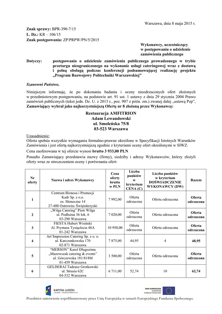 Warszawa, dnia 8 maja 2015 r. Znak sprawy: BPR-390-7/15 L. Dz.: KR – 106/15 Znak postępowania: ZP/PRPW/PN/5/2015 Wykonawcy, uczestniczący w postępowaniu o udzielenie zamówienia publicznego Dotyczy: postępowania o udzielenie zamówienia publicznego prowadzonego w trybie przetargu nieograniczonego na wykonanie usługi cateringowej wraz z dostawą i pełną obsługą podczas konferencji podsumowującej realizację projektu „Program Rozwojowy Politechniki Warszawskiej” Szanowni Państwo, Niniejszym informuję, że po dokonaniu badania i oceny nieodrzuconych ofert złożonych w przedmiotowym postępowaniu, na podstawie art. 91 ust. 1 ustawy z dnia 29 stycznia 2004 Prawo zamówień publicznych (tekst jedn. Dz. U. z 2013 r., poz. 907 z późn. zm.) zwanej dalej „ustawą Pzp”, Zamawiający wybrał jako najkorzystniejszą Ofertę nr 8 złożoną przez Wykonawcę: Restauracja AMFITRION Adam Lewandowski ul. Smoleńska 75/8 03-523 Warszawa Uzasadnienie: Oferta spełnia wszystkie wymagania formalno-prawne określone w Specyfikacji Istotnych Warunków Zamówienia i jest ofertą najkorzystniejszą zgodnie z kryteriami oceny ofert określonymi w SIWZ. Cena zaoferowana w tej ofercie wynosi brutto 3 933,00 PLN Ponadto Zamawiający przedstawia nazwy (firmy), siedziby i adresy Wykonawców, którzy złożyli oferty wraz ze streszczeniem oceny i porównania ofert: Nr oferty 1 2 3 4 5 6 Nazwa i adres Wykonawcy Centrum Biznesu i Promocji Kadr Sp. z o.o. os. Słoneczne 14 27-400 Ostrowiec Świętokrzyski „Wilga Catering” Piotr Wilga ul. Podłużna 36 lok. 6 03-290 Warszawa FIESTA Hubert Wisiński Al. Prymasa Tysiąclecia 48A 01-242 Warszawa Art’Impression Catering Sp. z o. o. ul. Karczunkowska 170 02-871 Warszawa “MERSON” Karol Długozima „Mazowszak catering & events” ul. Górczewska 181/818M 01-459 Warszawa GELDERAJ Tadeusz Grotkowski ul. Strusia 62C 04-532 Warszawa Cena oferty brutto w PLN Liczba punktów w kryterium CENA (C) Liczba punktów w kryterium DOŚWIADCZENIE WYKONAWCY (DW) Razem 7 992,00 Oferta odrzucona Oferta odrzucona Oferta odrzucona 7 020,00 Oferta odrzucona Oferta odrzucona Oferta odrzucona 10 950,00 Oferta odrzucona Oferta odrzucona Oferta odrzucona 7 875,00 44,95 4 48,95 3 500,00 Oferta odrzucona Oferta odrzucona Oferta odrzucona 6 711,00 52,74 10 62,74 Przedmiot zamówienia współfinansowany przez Unię Europejską w ramach Europejskiego Funduszu Społecznego. 7 8 9 10 11 International Food Service Sp. z o. o. ul. Igańska 20 04-087 Warszawa “IBELLA” CATERING Grażyna Sieradzińska ul. Koszykowa 79 02-008 Warszawa Produkcja Polska Pierogarnie Spółka z ograniczoną odpowiedzialnością Spółka komandytowa ul. Nowy Świat 6/12 00-400 Warszawa Restauracja AMFITRION Adam Lewandowski ul. Smoleńska 75/8 03-523 Warszawa „CARACAS” s. c. Paweł Feluch, Małgorzata Lenarcik ul. Królewska 47 m. 102 00-103 Warszawa 8 640,00 Oferta odrzucona Oferta odrzucona Oferta odrzucona 5 940,00 Oferta odrzucona Oferta odrzucona Oferta odrzucona 6 900,27 51,30 2 53,30 3 933,00 90 6 96 5 773,92 61,30 0 61,30 Jednocześnie informuję, że zgodnie z dyspozycją art. 94 ust. 2 pkt 1) lit. a) ustawy Pzp, umowa w sprawie zamówienia publicznego zostanie zawarta w terminie nie krótszym niż 5 dni od dnia przesłania niniejszego zawiadomienia o wyborze najkorzystniejszej oferty. Z poważaniem, Przedmiot zamówienia współfinansowany przez Unię Europejską w ramach Europejskiego Funduszu Społecznego.