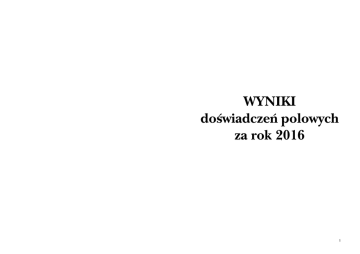 WYNIKI doœwiadczeñ polowych za rok 2016 1 2 średnia dobowa w ?C 21,1 19,9 20,6 20,5 23,5 22,8 20,7 22,3 16,0 18,5 12,6 15,7 10,1 6,6 6,2 7,6 6,0 9 0,8 5,3 4,4 2,4 2,6 3,1 512,3 Grudzień Listopad Październik Wrzesień Sierpień Lipiec 14,5 3,0 19,3 36,8 6,1 0 5,6 11,7 9,9 14,0 16,1 40,0 21,4 7,9 1,9 31,2 30,4 7,8 54,7 92,9 0 8,0 1,1 9,1 6,1 19,3 5,1 30,5 7,5 37,4 20,1 65 22,4 7,7 8,6 38,7 9,6 23,6 25,5 93,7 9,9 20,8 3,3 34 18,8 10,5 9,2 38,5 Czerwiec Maj Kwiecień Marzec suma w mm RAZEM 651,3 13,1 25,7 26,5 65,3 7,2 6,1 8,8 22,1 5,3 21,4 28,9 55,6 0 37,6 0,5 38,1 4,5 84 21 109,5 6,7 7,4 1,3 15,4 I II III Σ/ŚREDNIA I II III Σ/ŚREDNIA I II III Σ/ŚREDNIA I II III Σ/ŚREDNIA I II III Σ/ŚREDNIA I II III Σ/ŚREDNIA suma w mm 19,3 63,4 20,2 102,9 24,6 4,4 30,3 59,3 15,9 19,3 4,4 39,6 78,9 13,1 26,7 118,7 30,4 suma w mm 2015 2016 średnia dobowa w ?C 18,3 18,6 20,7 19,2 19,0 16,3 18,4 17,9 18,1 16,0 12,1 15,4 8,8 6,5 7,2 7,5 4,2 2015 Dekada 2016 Temperatura Miesiąc 2015 średnia dobowa w ?C -2,4 3,6 1,0 0,73 -1,9 0,3 5,8 1,4 2,8 3,3 7,4 4,5 4,3 9,4 12,6 8,8 13,1 13,4 12,8 13,1 19,5 17,9 16,4 17,9 Luty W III dekadzie sierpnia wiêksze opady umo¿liwi³y prawid³owe przygotowanie i terminowy siew rzepaku ozimego. I II III Σ/ŚREDNIA I II III Σ/ŚREDNIA I II III Σ/ŚREDNIA I II III Σ/ŚREDNIA I II III Σ/ŚREDNIA I II III Σ/ŚREDNIA Wysoka temperatura oraz niewielkie opady w I po³owie sierpnia umo¿liwi³y sprawne zakoñczenie ¿niw. Styczeń W lipcu wysokiej temperaturze towarzyszy³y znaczne opady deszczu, szczególnie w II dekadzie. Poprawa pogody w III dekadzie umo¿liwi³a zbiór rzepaku oraz zbó¿. suma w mm Maj by³ ciep³y z niezbyt du¿¹ iloœci¹ opadów. Taka pogoda utrzymywa³a siê tak¿e w czerwcu, dziêki czemu terminowo wykonano zabiegi ochrony i nawo¿enia. 2016 Z nastaniem kwietnia przysz³o ocieplenie, które umo¿liwi³o siew zbó¿ jarych oraz roœlin str¹czkowych. Koniec miesi¹ca by³ ciep³y i suchy, co umo¿liwi³o posadzenie ziemniaków oraz siew kukurydzy. Sprzyjaj¹ca pogoda w kwietniu umo¿liwi³a wykonanie zabiegów nawo¿enia oraz ochrony prowadzonych doœwiadczeñ. średnia dobowa w ?C -6,4 -1,8 -0,6 -2,9 4,9 4,1 3,4 4,1 4,6 3,5 5,3 4,5 11,2 10,4 7,8 9,8 12,5 11,3 17,8 13,9 16,1 18,0 22,1 18,7 Marzec okaza³ siê ch³odnym i doœæ suchym miesi¹cem. 2015 Koñcem III dekady lutego poprawa pogody i ciep³o spowodowa³y wznowienie wegetacji roœlin, na które zastosowano I dawkê nawo¿enia pog³ównego azotem. 2016 W drugiej po³owie stycznia i w lutym 2016 r. nast¹pi³o znaczne ocieplenie, któremu towarzyszy³y opady œniegu, a potem deszczu. Dekada Grudzieñ by³ doœæ ciep³y z niewielk¹ iloœci¹ opadów. Znaczne och³odzenie nast¹pi³o na prze³omie 2015 i 2016 r. Brak okrywy œnie¿nej oraz znaczne spadki temperatury w nocy spowodowa³y czêœciowe uszkodzenie roœlin pszenicy ozimej pochodz¹cych z opóŸnionych zasiewów. Miesiąc PaŸdziernik by³ ciep³y i suchy. Sprzyjaj¹ca pogoda na prze³omie paŸdziernika i listopada umo¿liwi³a jesienne zwalczanie chwastów w zbo¿ach ozimych oraz wykonanie jesiennego nawo¿enia dolistnego doœwiadczeñ. W III dekadzie listopada nast¹pi³o och³odzenie, z czêstymi nocnymi przymrozkami. Stan roœlin rzepaku przed zim¹ by³ bardzo dobry. Natomiast stan zbó¿ by³ zró¿nicowany i uzale¿niony od terminu siewu. Opady Na prze³omie wrzeœnia i paŸdziernika wykonano siew zbó¿ ozimych w such¹ glebê. Wschody roœlin by³y dobre i równomierne pomimo niskiej iloœci opadów. Temperatura Opady deszczu za wrzesieñ wynios³y 55,6 mm. Miesi¹c by³ ciep³y i suchy. Opady Brak opadów w sierpniu 2015 r. utrudni³ wykonanie uprawek po¿niwnych oraz przygotowanie roli pod siew rzepaku ozimego na rok nastêpny. Tab. 1. Dekadowe sumy opadów i œrednie dekadowe temperatury powietrza za lata 2015-2016 wg pomiarów stacji meteorologicznej na polu doœwiadczalnym PODR Boguchwa³a PRZEBIEG POGODY I JEJ WP£YW NA WEGETACJÊ ROŒLIN 3 Wprowadzenie I. DOŒWIADCZENIA PDO Sezon rolniczy 2015-2016 mo¿na okreœliæ mianem udanego. Uzyskano wysokie plony zbó¿ ozimych, rzepaku ozimego, kukurydzy i ziemniaków. Plonowanie roœlin str¹czkowych (bobik, groch, ³ubin, soja) by³o na œrednim poziomie, a na obni¿enie plonu wp³yw mia³ brak odpowiedniej iloœci opadów w maju i czerwcu. Doœwiadczenia PDO prowadzone by³y w oparciu o metodykê instytutów bran¿owych, takich jak: COBORU w S³upi Wielkiej, IUNG - PIB w Pu³awach, IOR - PIB w Poznaniu, IHAR - PIB w Radzikowie oraz w³asn¹. Odmiany by³y wysiewane w czterech powtórzeniach. Celem niniejszych doœwiadczeñ polowych by³o sprawdzenie w lokalnych warunkach glebowo-klimatycznych mo¿liwoœci wykorzystania genetycznego potencja³u plonotwórczego badanych odmian. Doœwiadczenia odmianowe z pszenic¹ ozim¹, pszen¿ytem ozimym, jêczmieniem ozimym i pszenic¹ jar¹ prowadzono w ramach Porejestrowego Doœwiadczalnictwa Odmianowego (PDO), wed³ug metodyki COBORU przy dwóch poziomach agrotechniki: Przebieg pogody w ró¿nym stopniu wp³ywa³ na plonowanie roœlin. Do niekorzystnych warunków pogodowych, które wp³ynê³y ujemnie na wzrost i rozwój roœlin nale¿a³y: sucha jesieñ, brak odpowiedniej okrywy œnie¿nej w zimie w po³¹czeniu ze znacznymi spadkami temperatury, brak dostatecznej iloœci opadów w maju i w czerwcu, wysokie temperatury w lecie. Dodatnio na plon wp³ynê³y: d³uga i ciep³a jesieñ, stosunkowo krótka i doœæ ³agodna zima, wczesna wiosna i letnie opady deszczu. Dodatkowym czynnikiem wp³ywaj¹cym korzystnie na plonowanie roœlin na polu doœwiadczalnym by³y wystêpuj¹ce kilkakrotnie punktowo opady deszczu. Niezbyt wysoka suma opadów w okresie wegetacji korzystnie wp³ynê³a na zdrowotnoœæ roœlin oraz brak wylegania. W sezonie 2015-2016 zaobserwowano ni¿sze ni¿ w latach ubieg³ych pora¿enie roœlin przez choroby grzybowe oraz mniejsze wyleganie roœlin. Stoj¹ce roœliny oraz sprzyjaj¹ca pogoda umo¿liwi³y szy